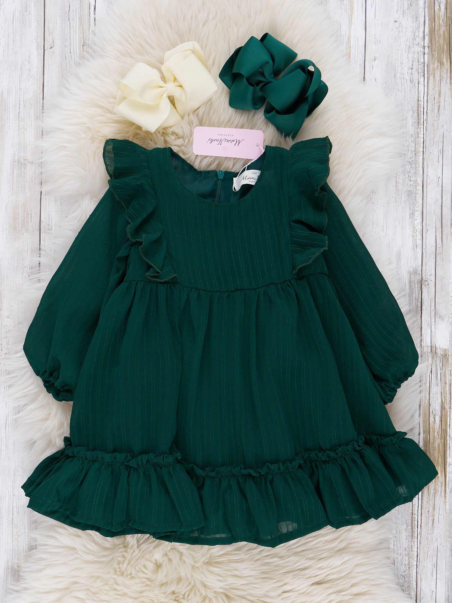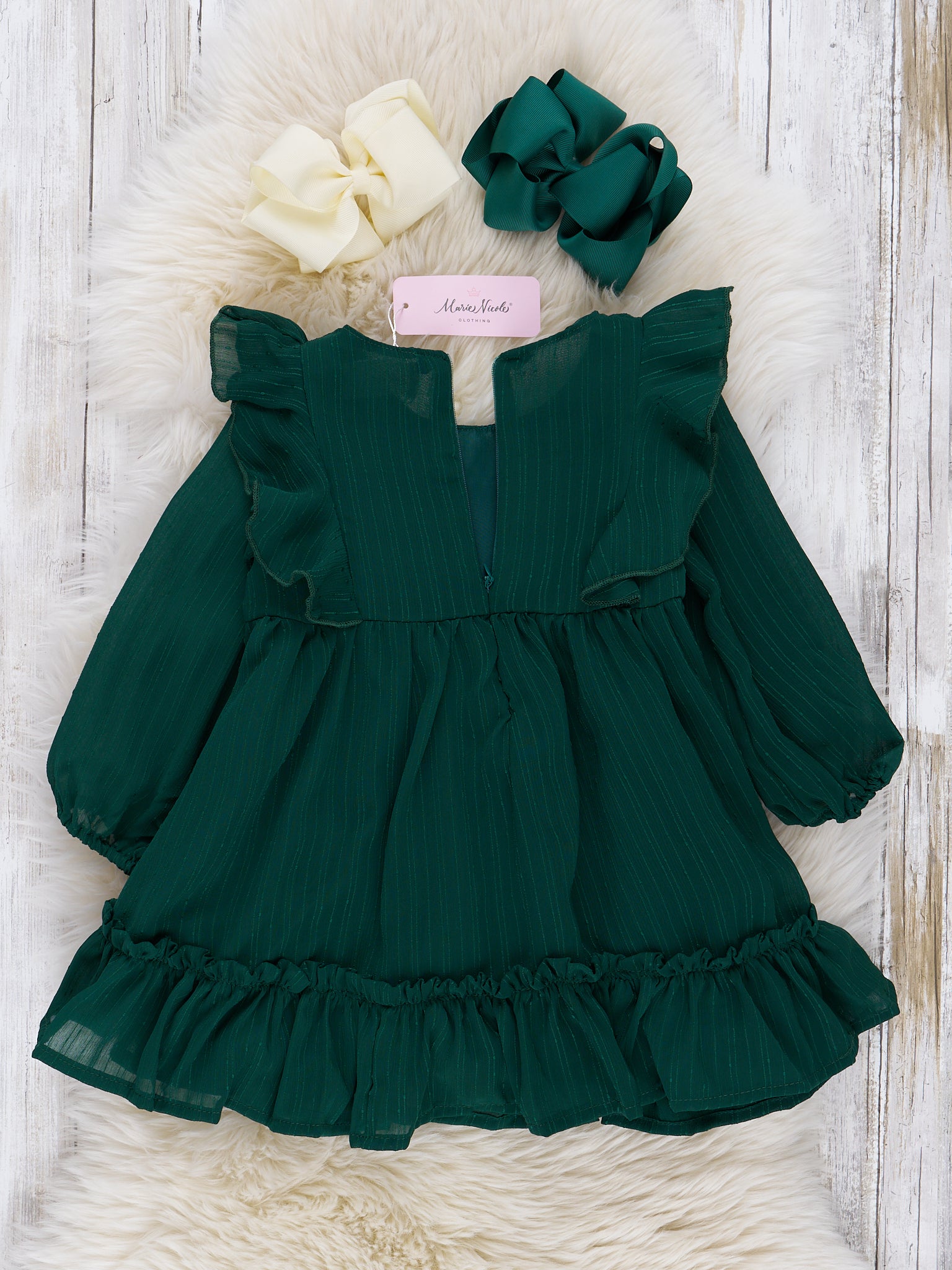 Treat yourself to the perfect Christmas outfit: our Hunter Green Ruffle Dress! Boasting a classic silhouette with a zippered back and cascading ruffles, your little one will feel festive and fashionable in no time.
