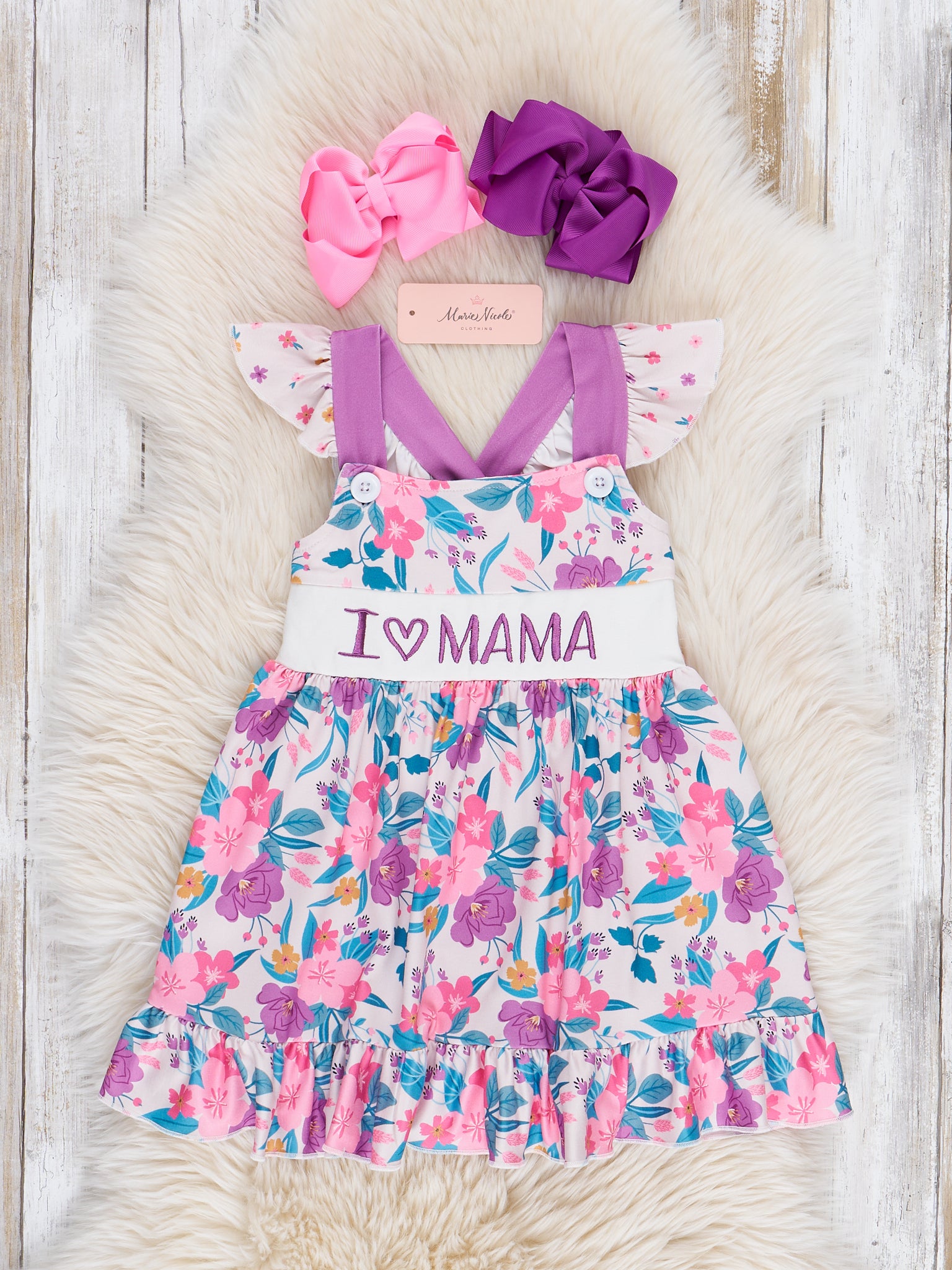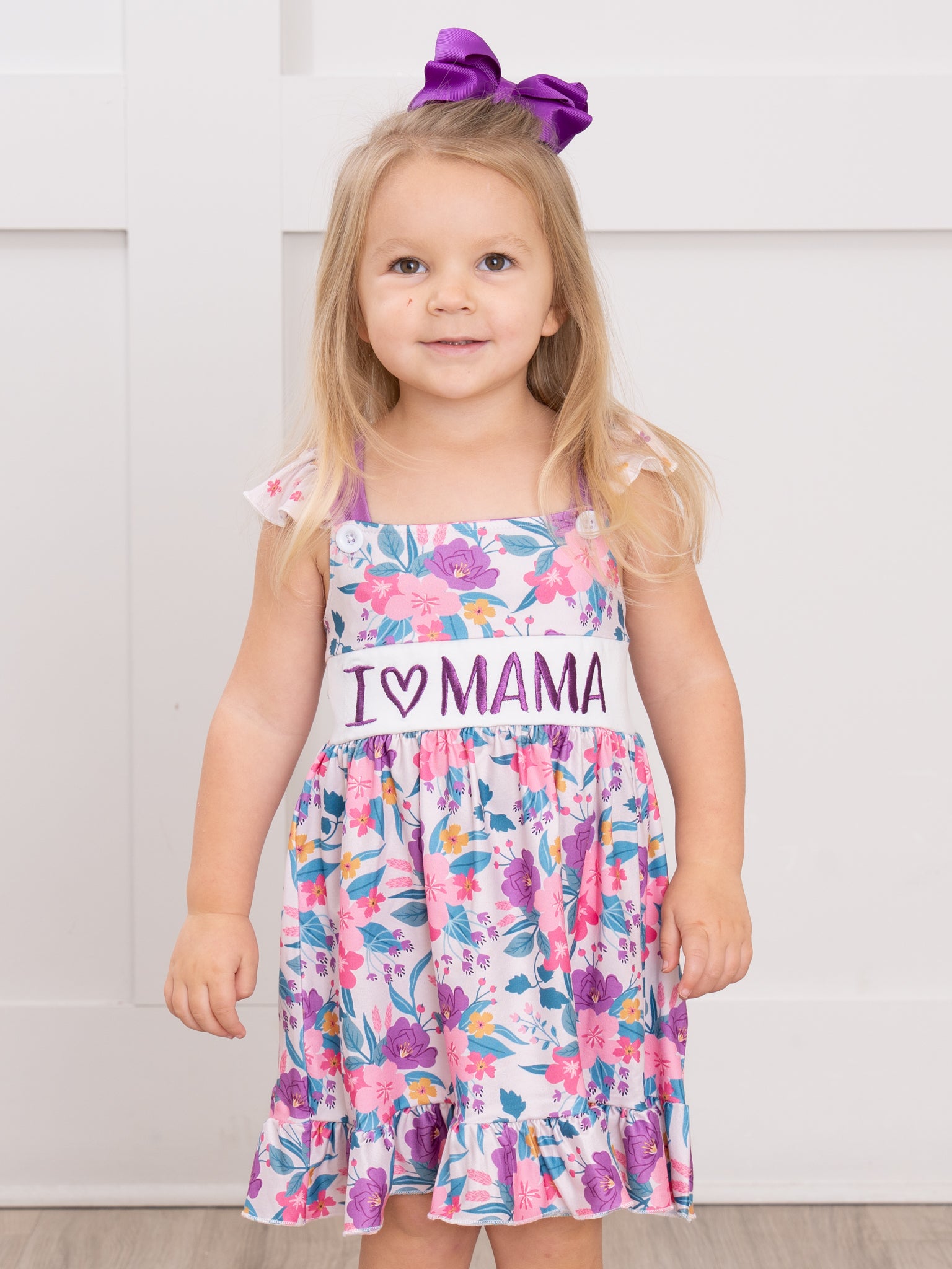 The "I Love Mama" Floral Dress for your mama's girl! This dress features gorgeous purple florals, an embroidered "I Love Mama", flutter sleeves, ruffle trim, & adjustable straps.