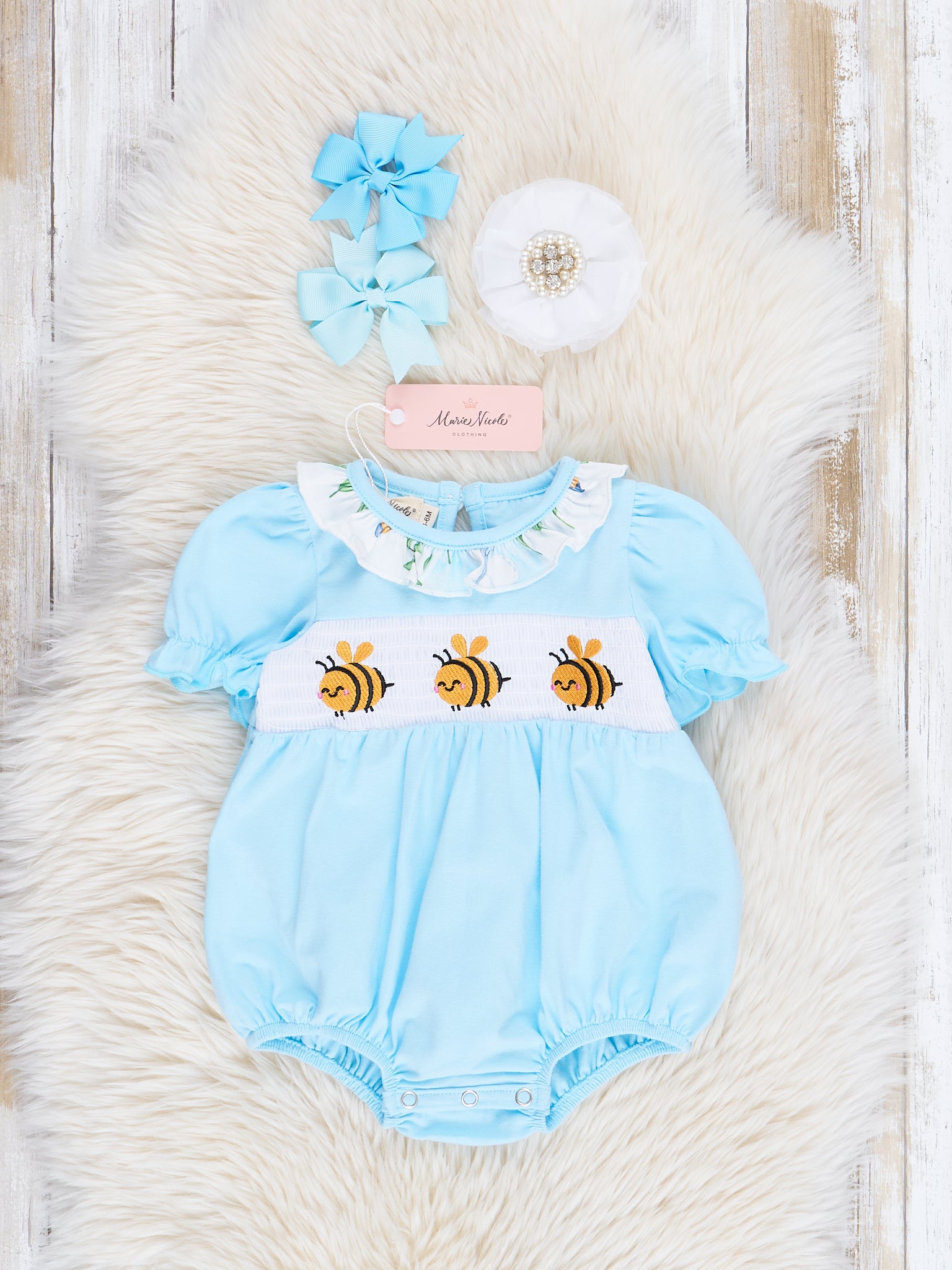Ice Blue Bumble Bee Smocked Ruffle Bubble