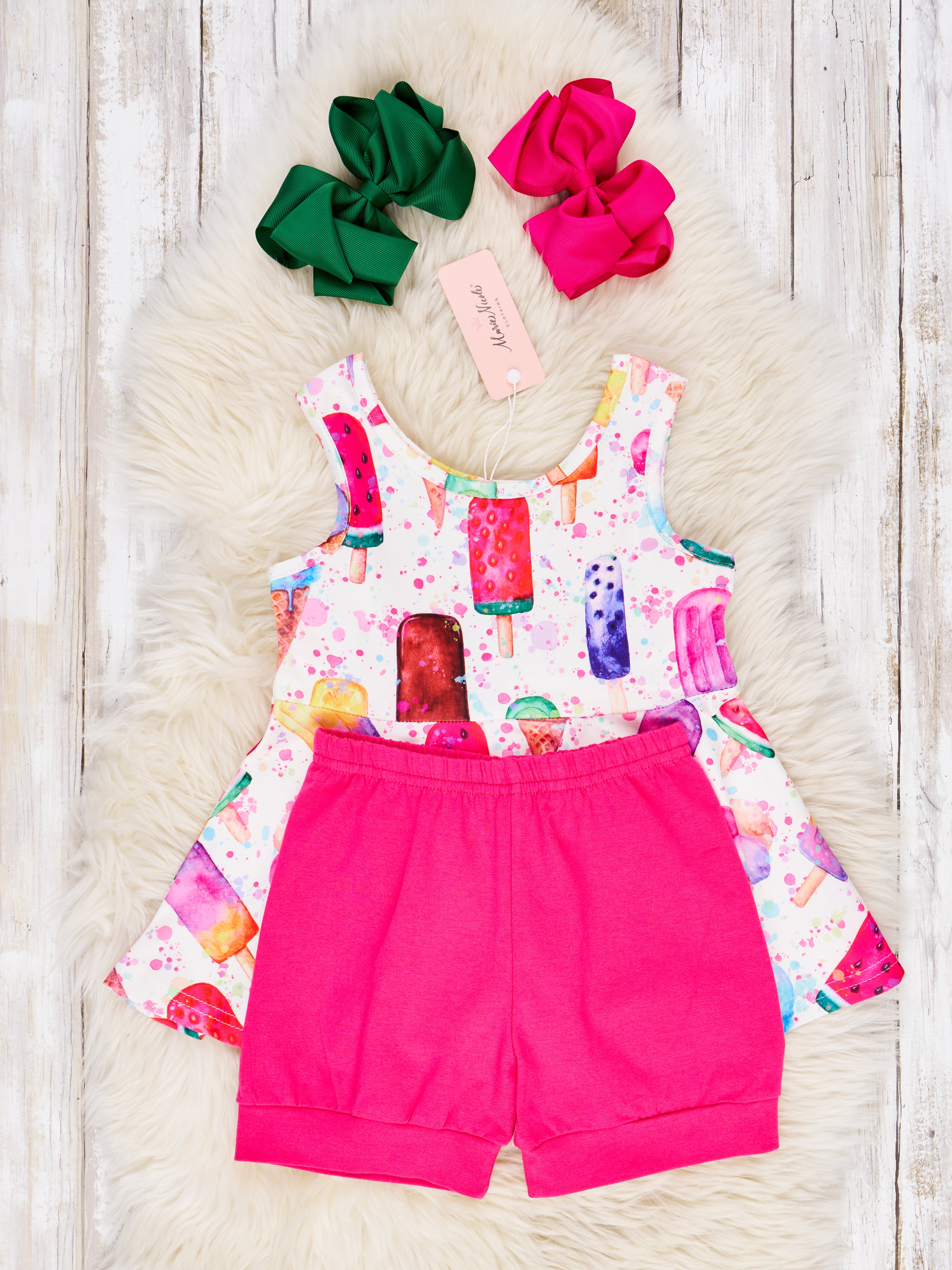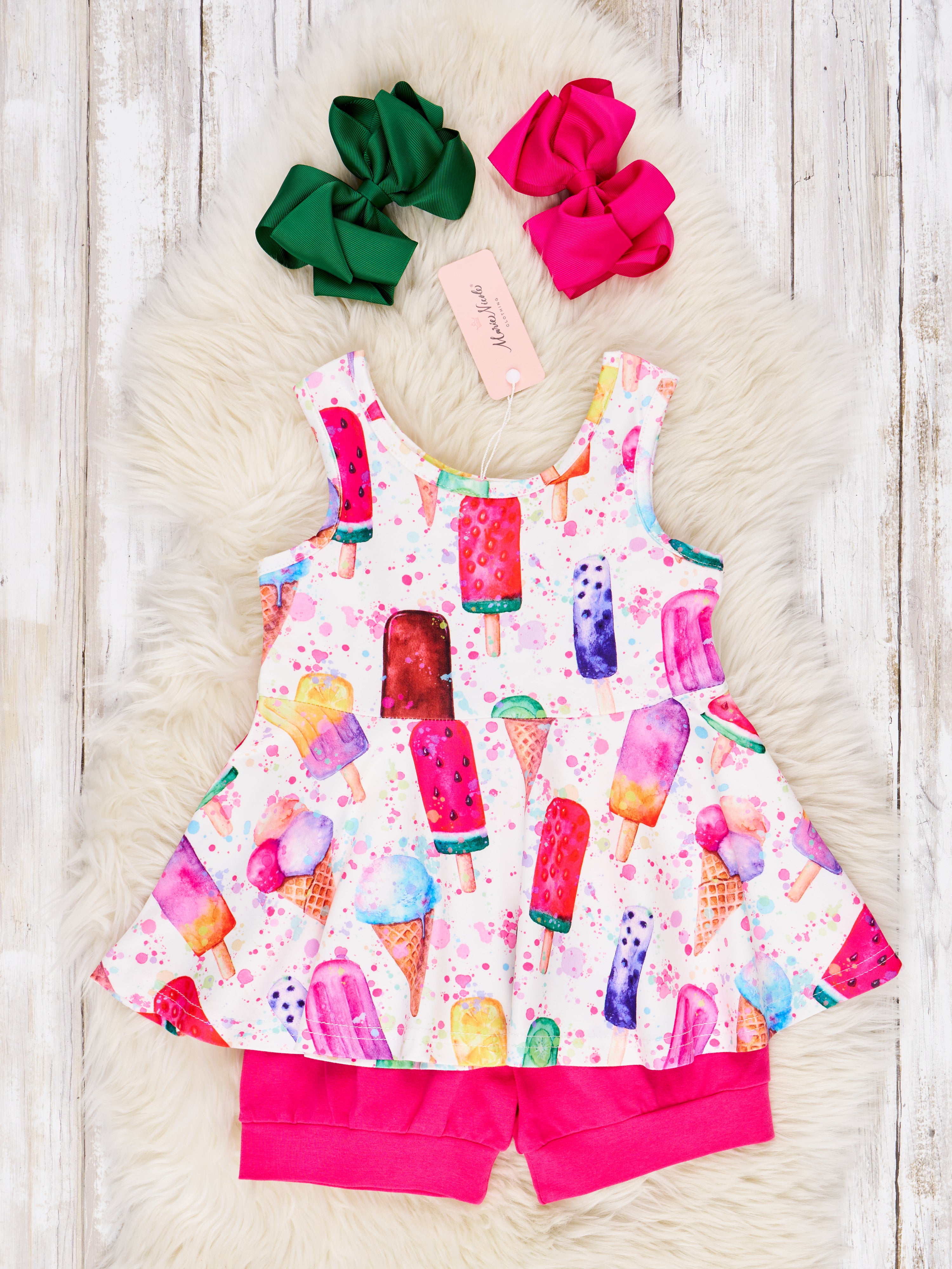 Let your kiddo rock the season's trendiest look with this must-have Ice Cream Tank & Shorts Outfit! The fun-filled set includes a comfy tank embossed with vibrant ice cream cones and shorts with an elastic waistband – perfect for playful summer days!