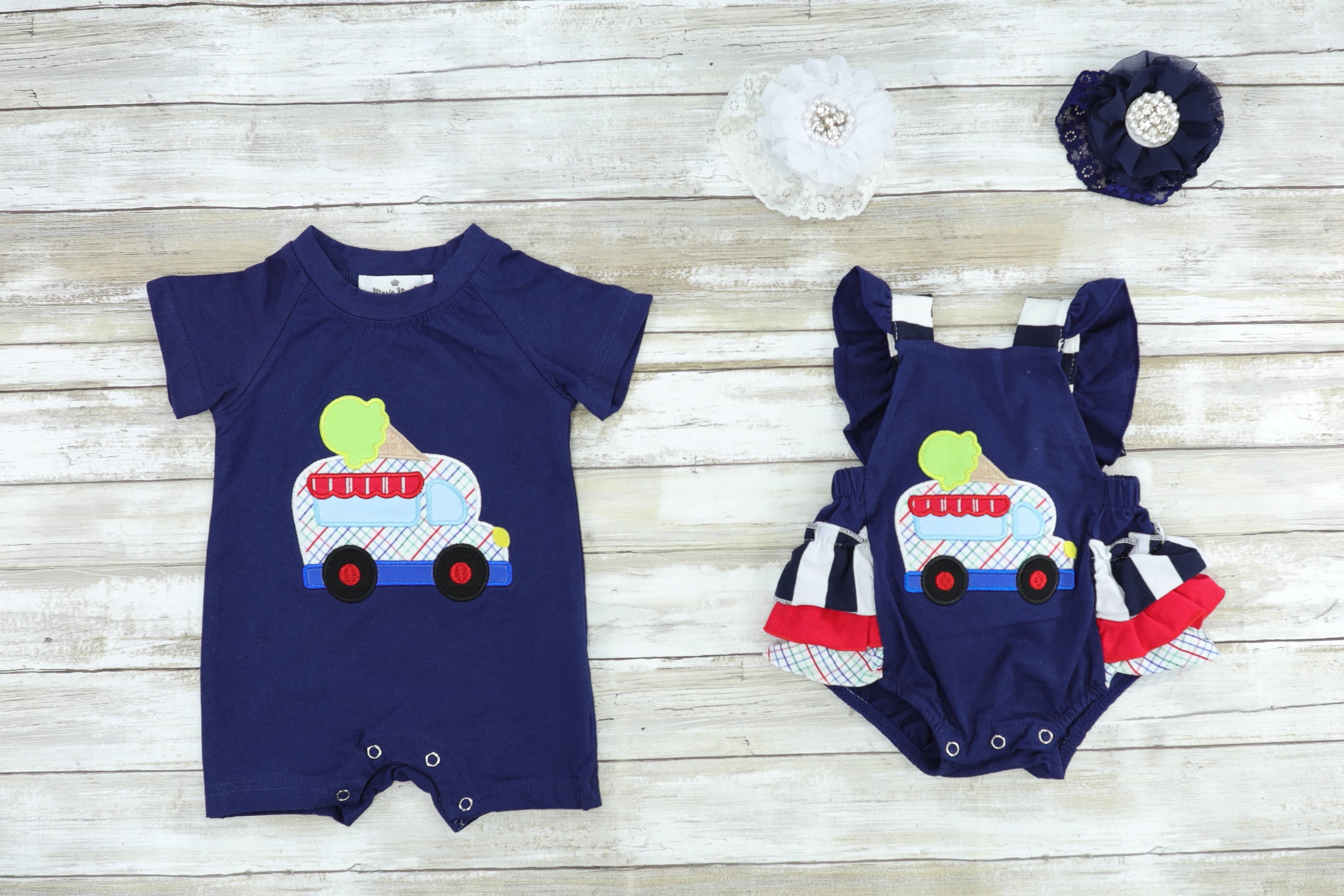 I scream, you scream, we all scream for ice cream! The cutest sibling set for your littles who love their ice cream! This navy blue romper features an ice cream appliqué and snap buttons making for easy diaper changes.