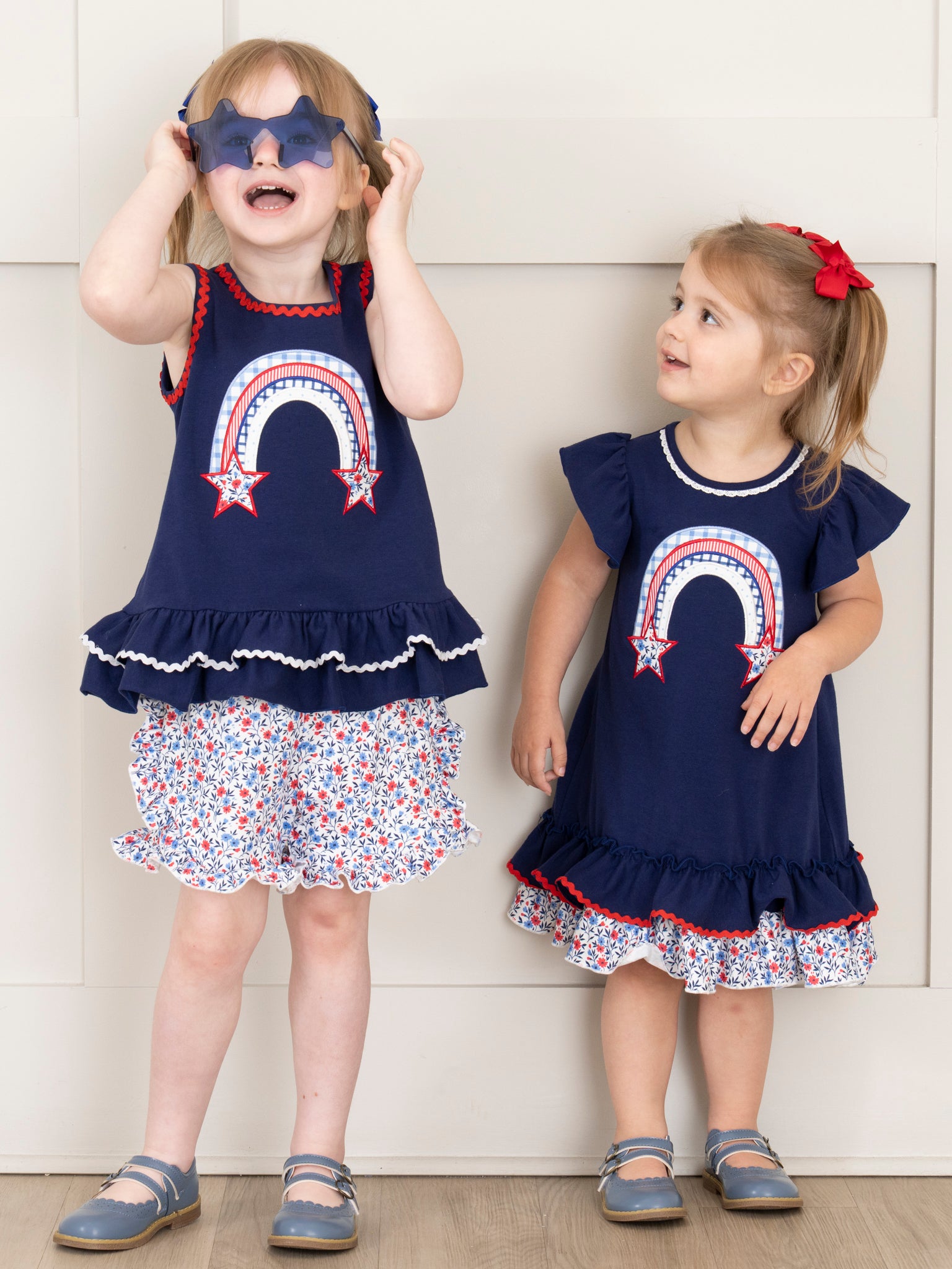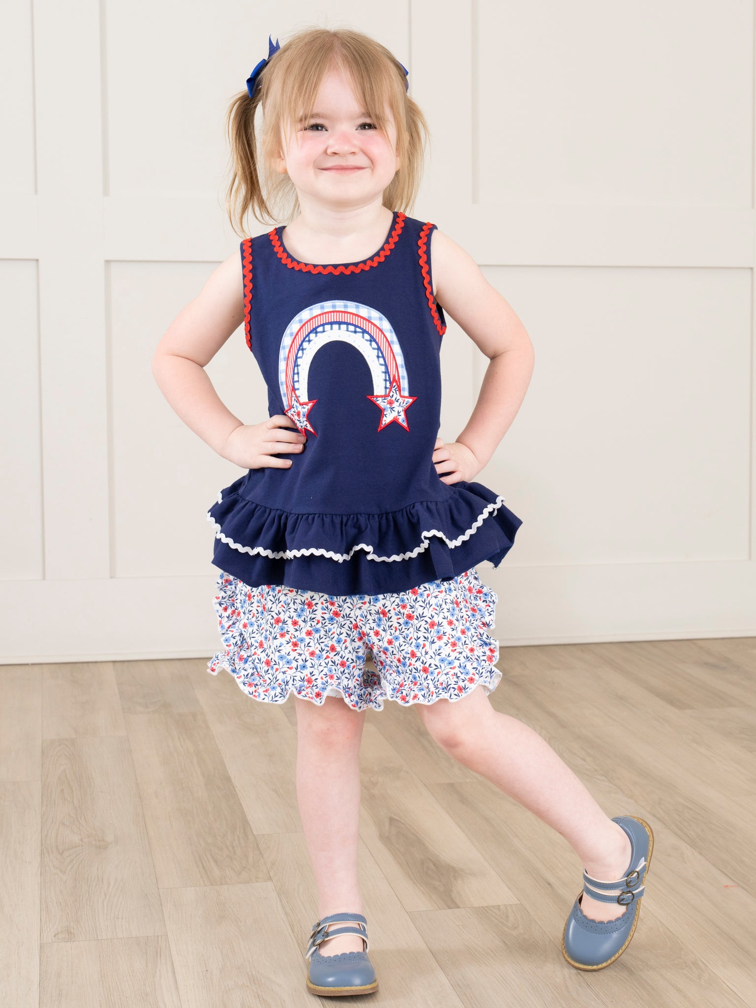 Show off your little one's unique style with the Independence Rainbow Embroidered Ruffle Outfit by Marie Nicole Clothing. This girls' outfit features a navy swing top with an embroidered red, white, and blue rainbow, paired with patriotic floral ruffle shorts. Perfect for siblings, this outfit screams fun and freedom!