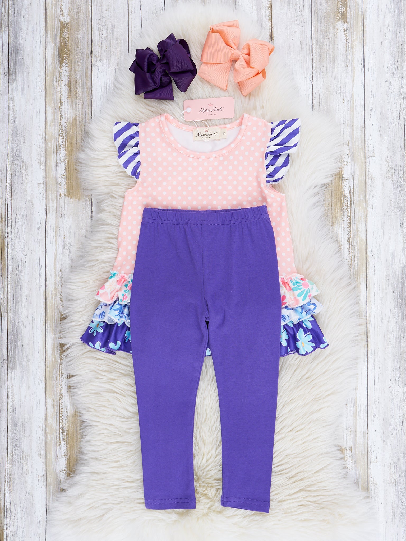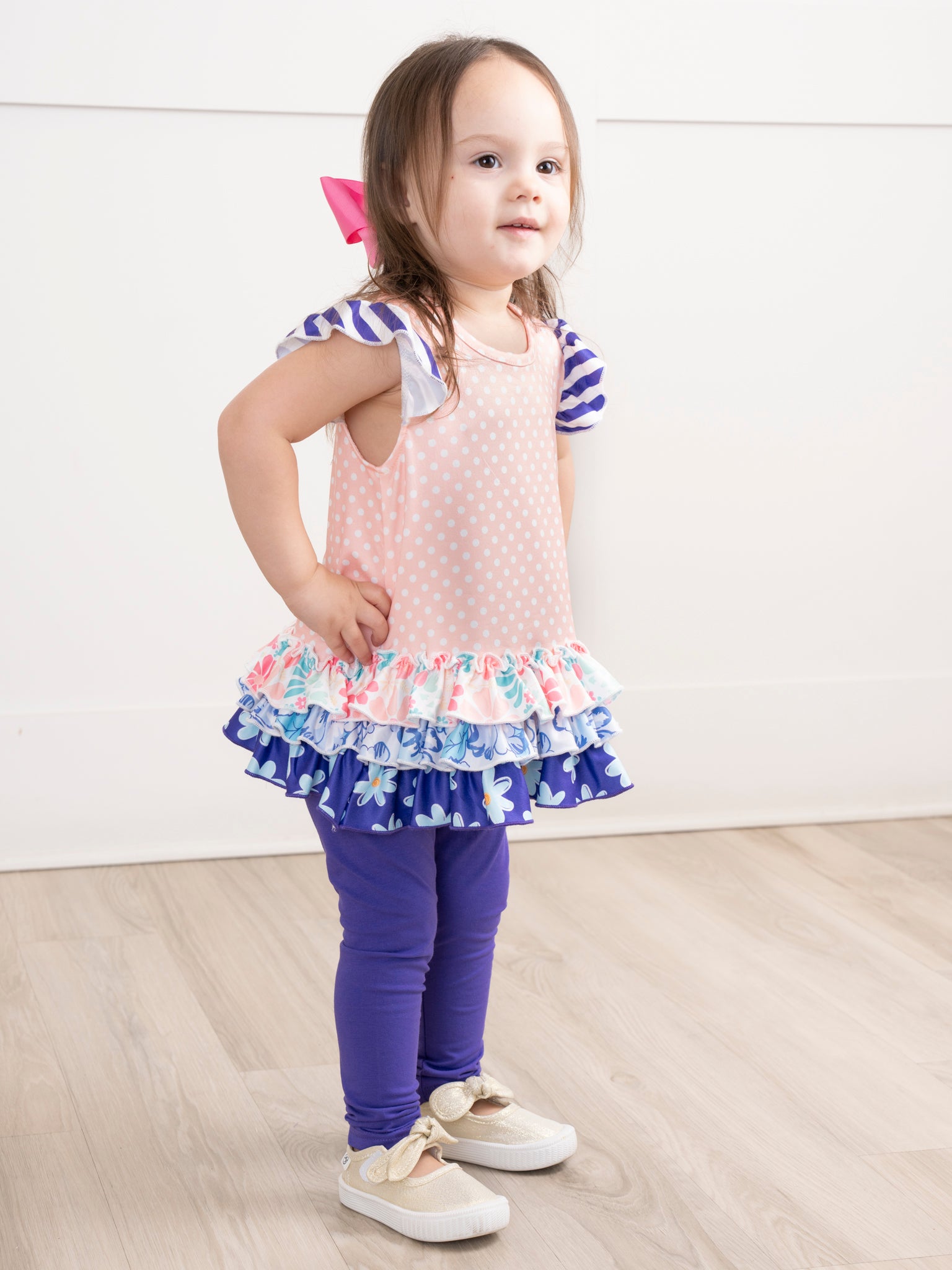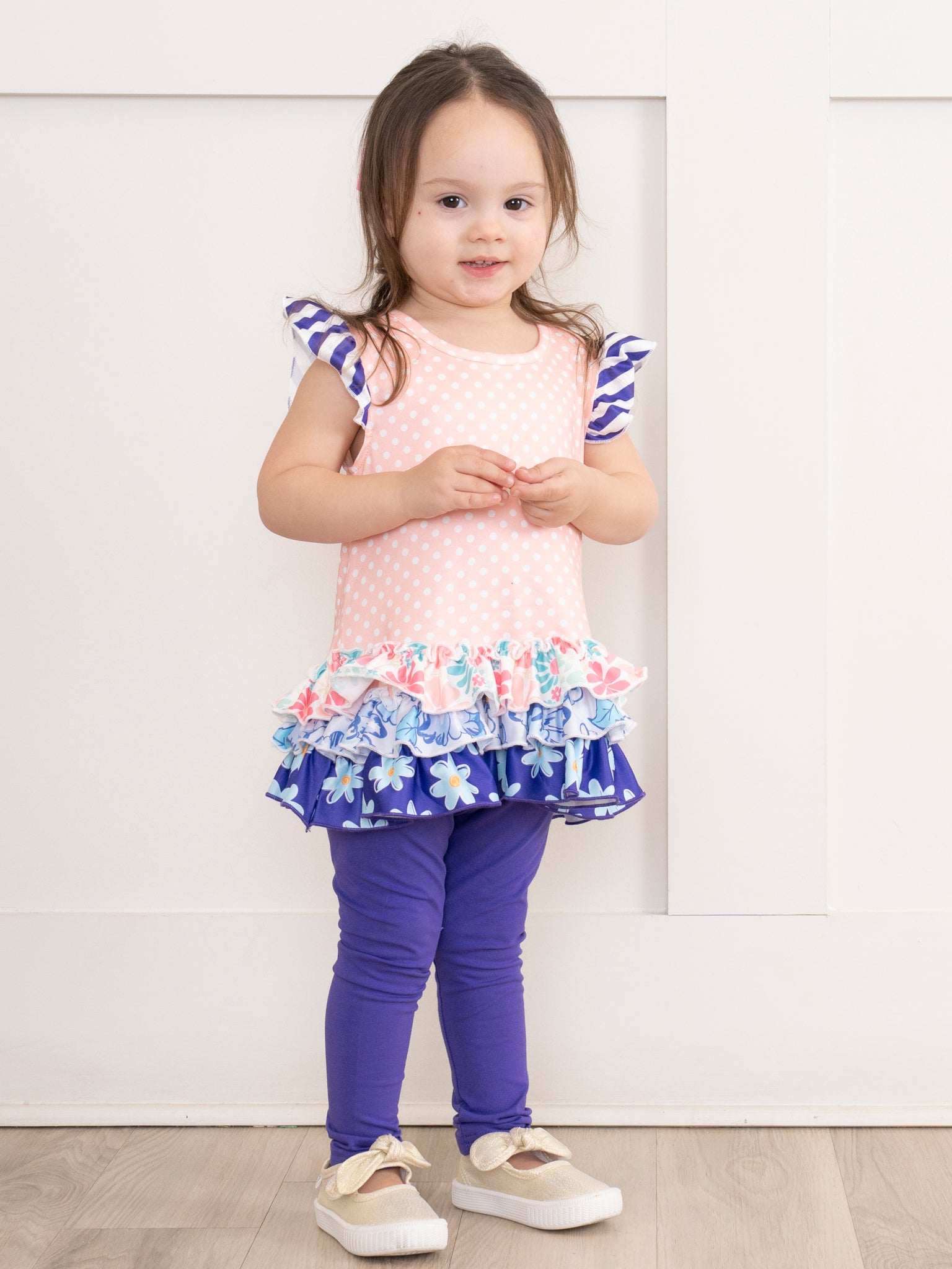 Double the fun with this Indigo & Peach Print sister set! This outfit features a peach polka dot and indigo stripe top for a playful mix of patterns, paired with indigo leggings. But the real showstopper? The adorable floral ruffle hem that add a touch of whimsy to this already charming outfit.