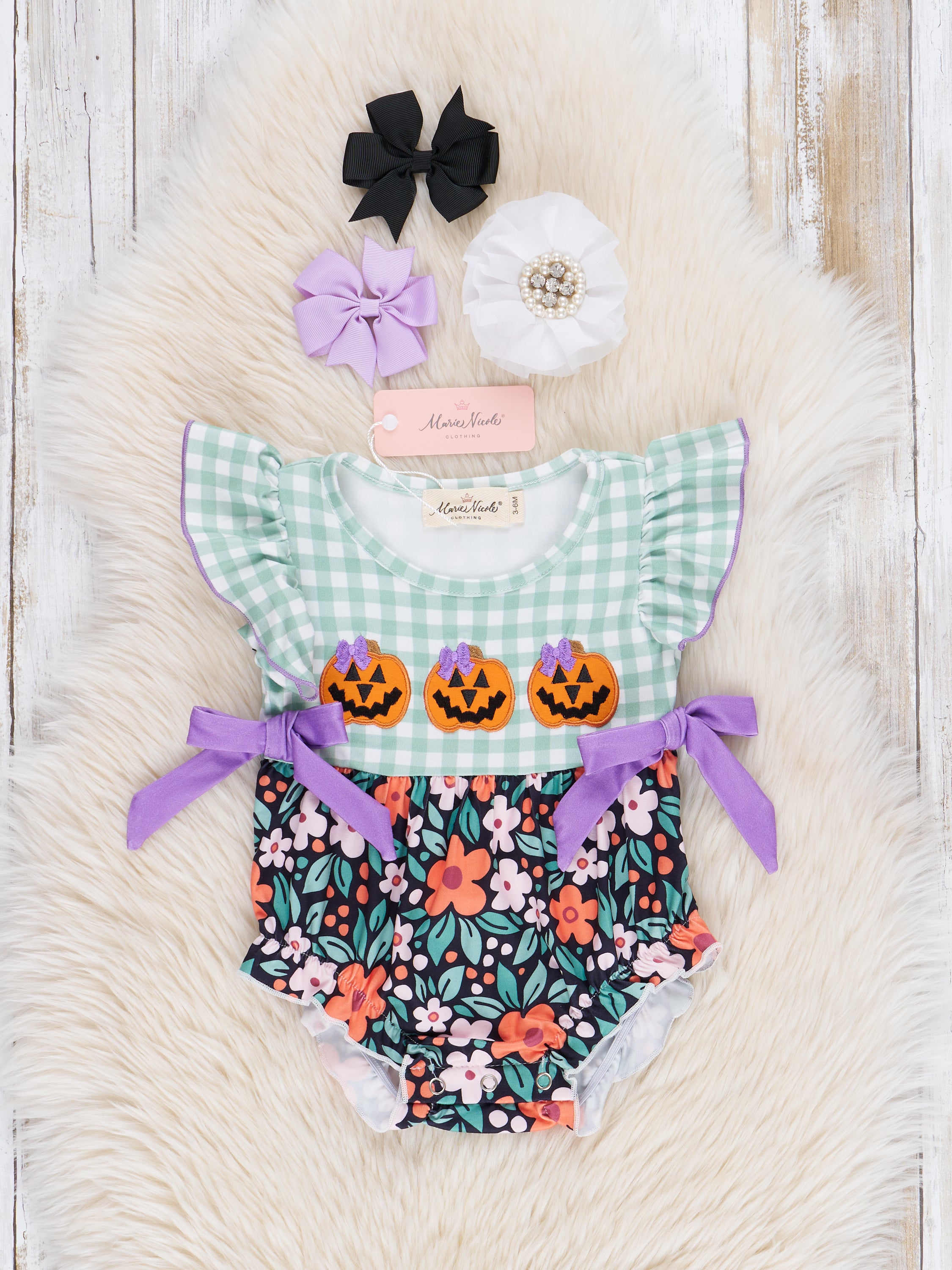 Get ready for fall fun with our Jack-o-Lantern Florals Ruffle Bubble! This sister set features a gingham ruffle bodice adorned with embroidered jack-o-lanterns, paired with a playful floral print. Complete with a charming bow detail, this bubble is perfect for the season.