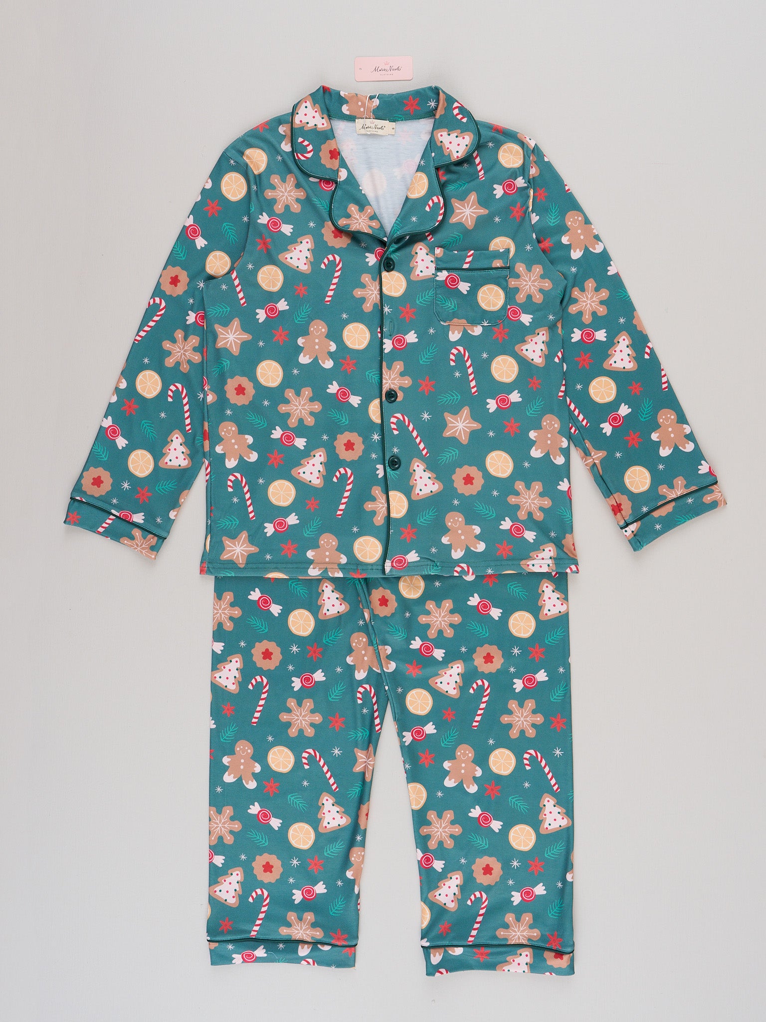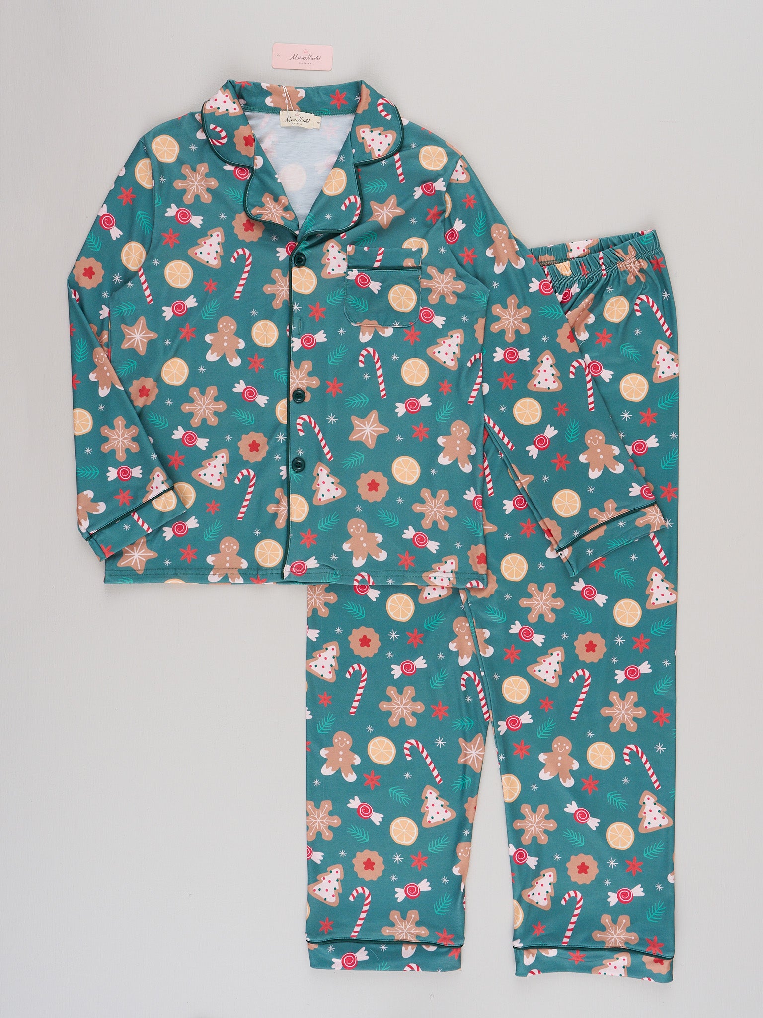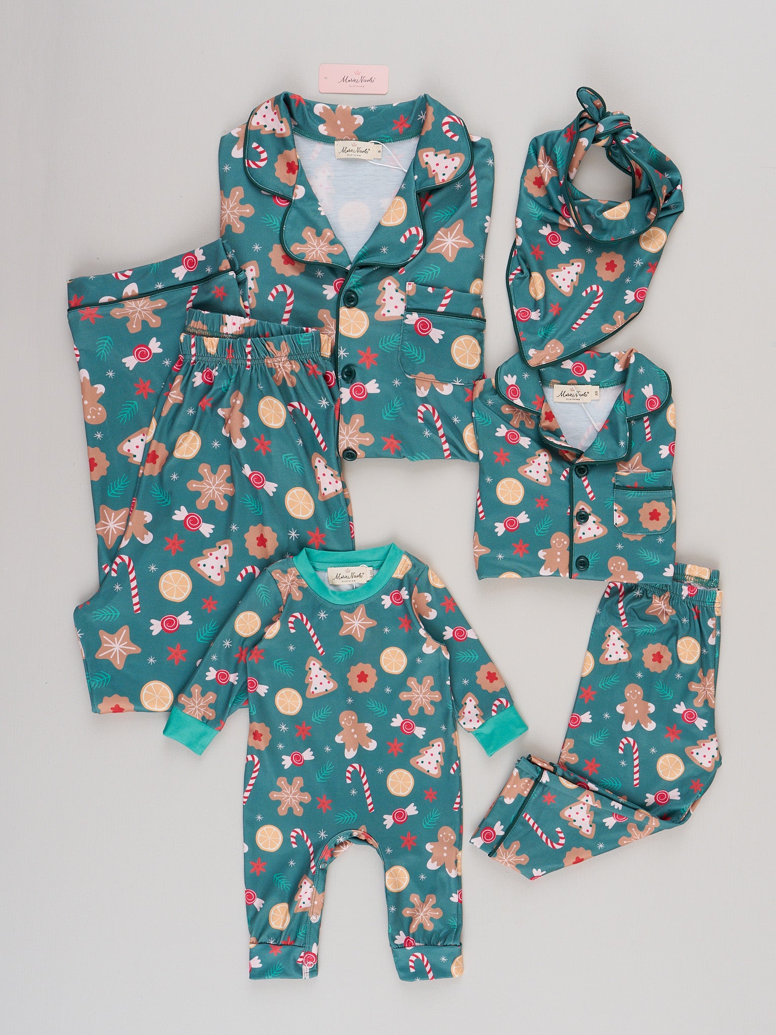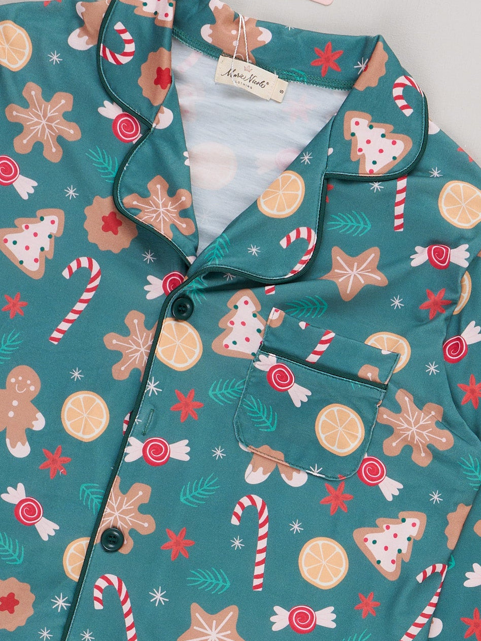 The Jolly Sweets Family Pajamas by Marie Nicole Clothing deliver playful holiday cheer with a festive print full of gingerbread treats, candy canes, and whimsical designs. Made from soft, cozy fabric for relaxing evenings at home, these pajamas bring comfort and fun to the family's holiday traditions.