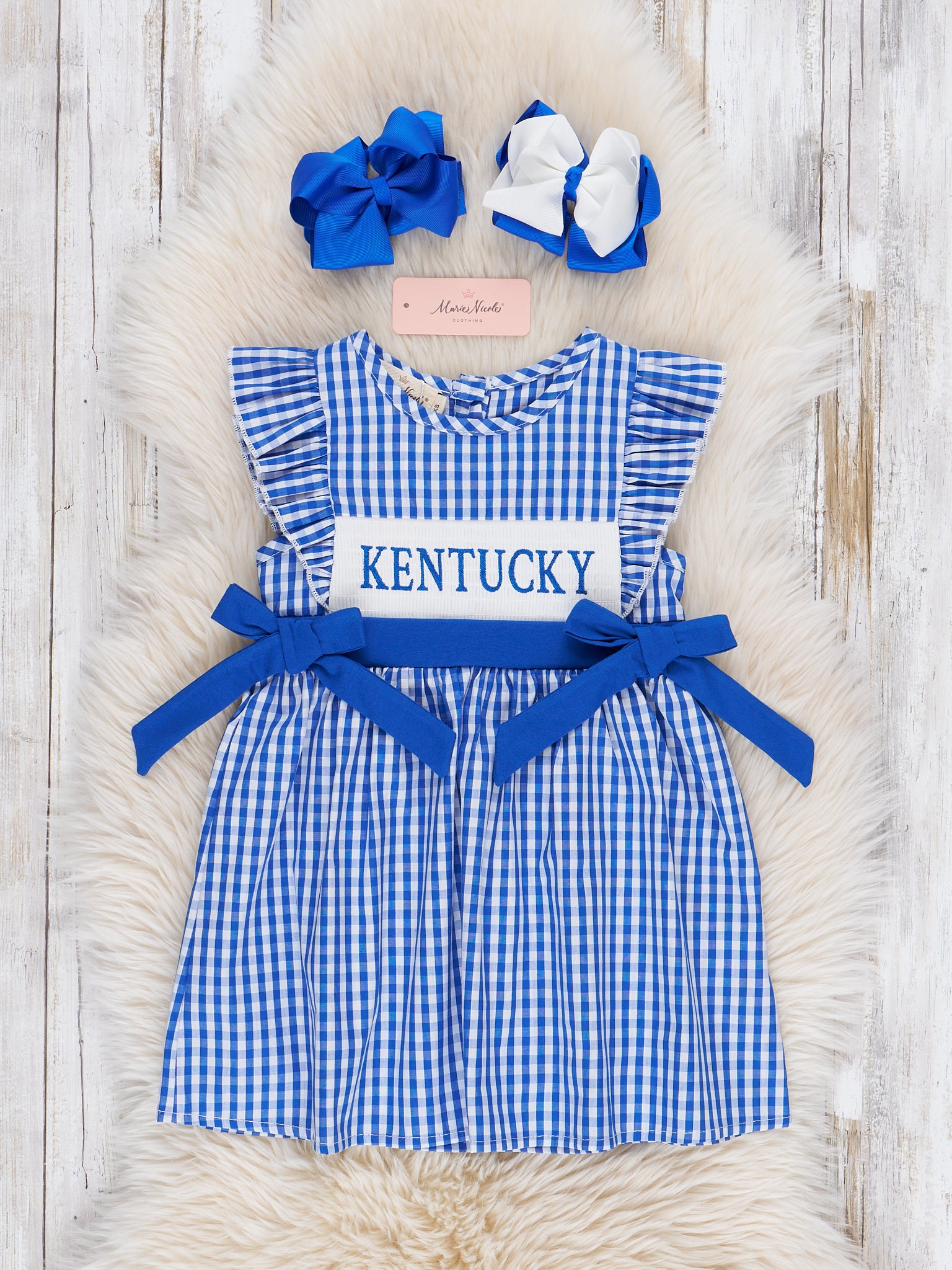The Kentucky Smocked Gingham Dress is a darling combination of Southern charm and team spirit. Featuring a classic blue and white gingham pattern, sweet ruffle sleeves, and a smocked panel embroidered with “Kentucky” this dress from Marie Nicole Clothing is perfect for game days, family gatherings, or sunny day adventures. Finished with bold blue waist ties for a polished look, it’s a spirited style your little fan will love to twirl in.