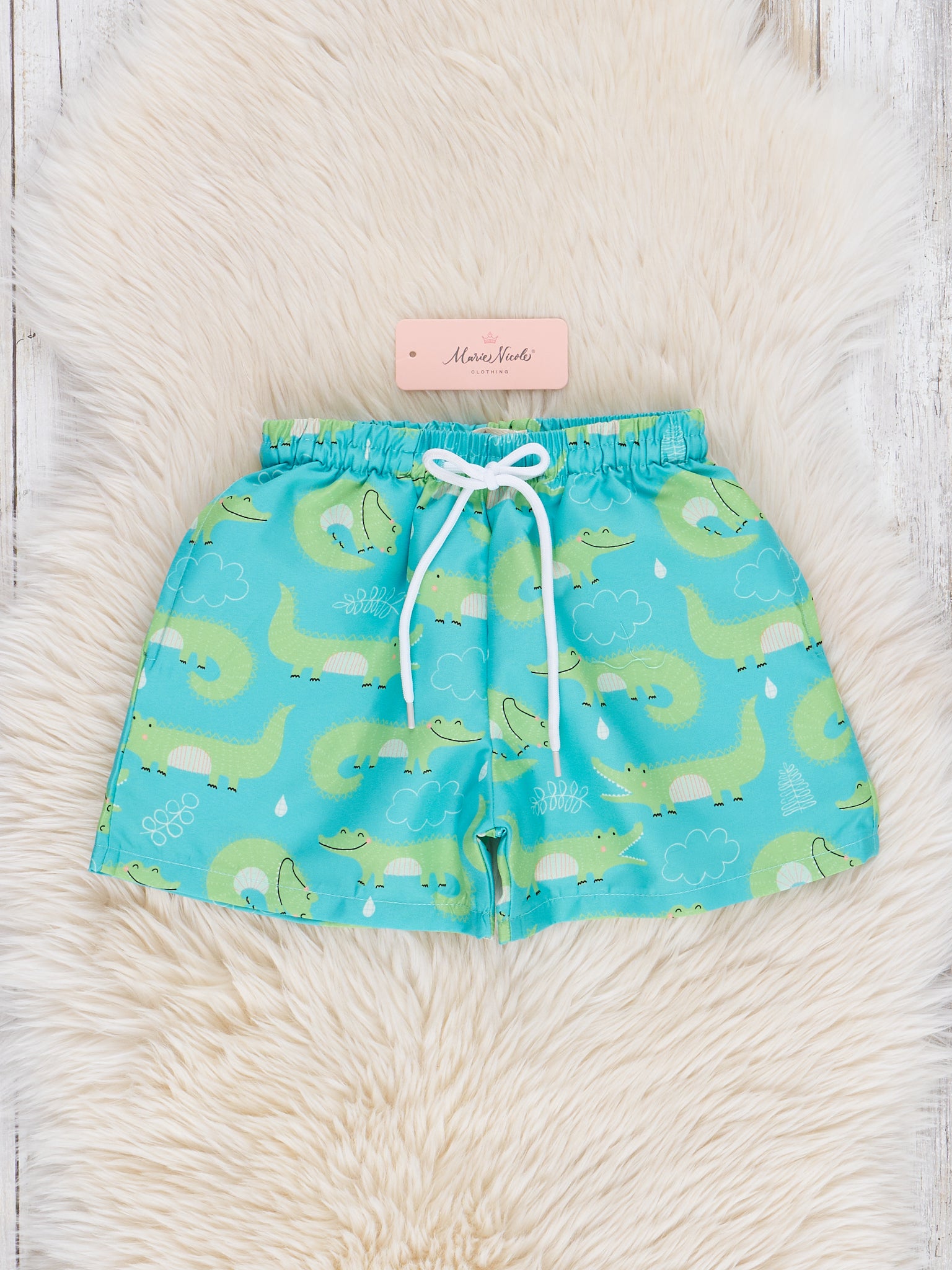 Make a splash with the Later Gator Swim Trunks. Featuring a playful alligator print and elastic waistband, these swim trunks will have your little one looking stylish while they splash around. With adjustable drawstring for a perfect fit and a matching sibling set available, it's perfect for fun in the sun. From Marie Nicole Clothing.