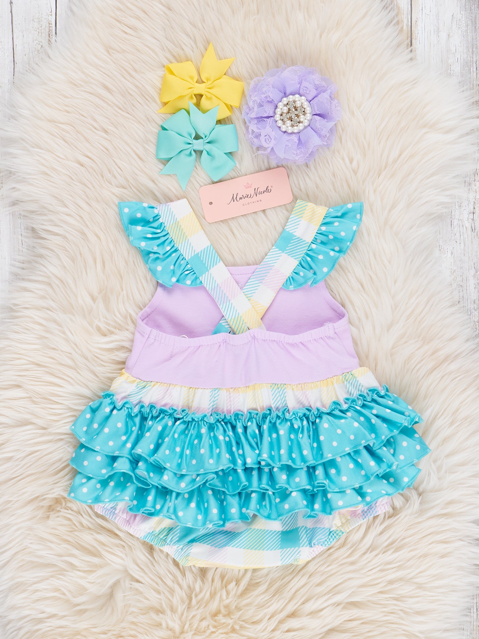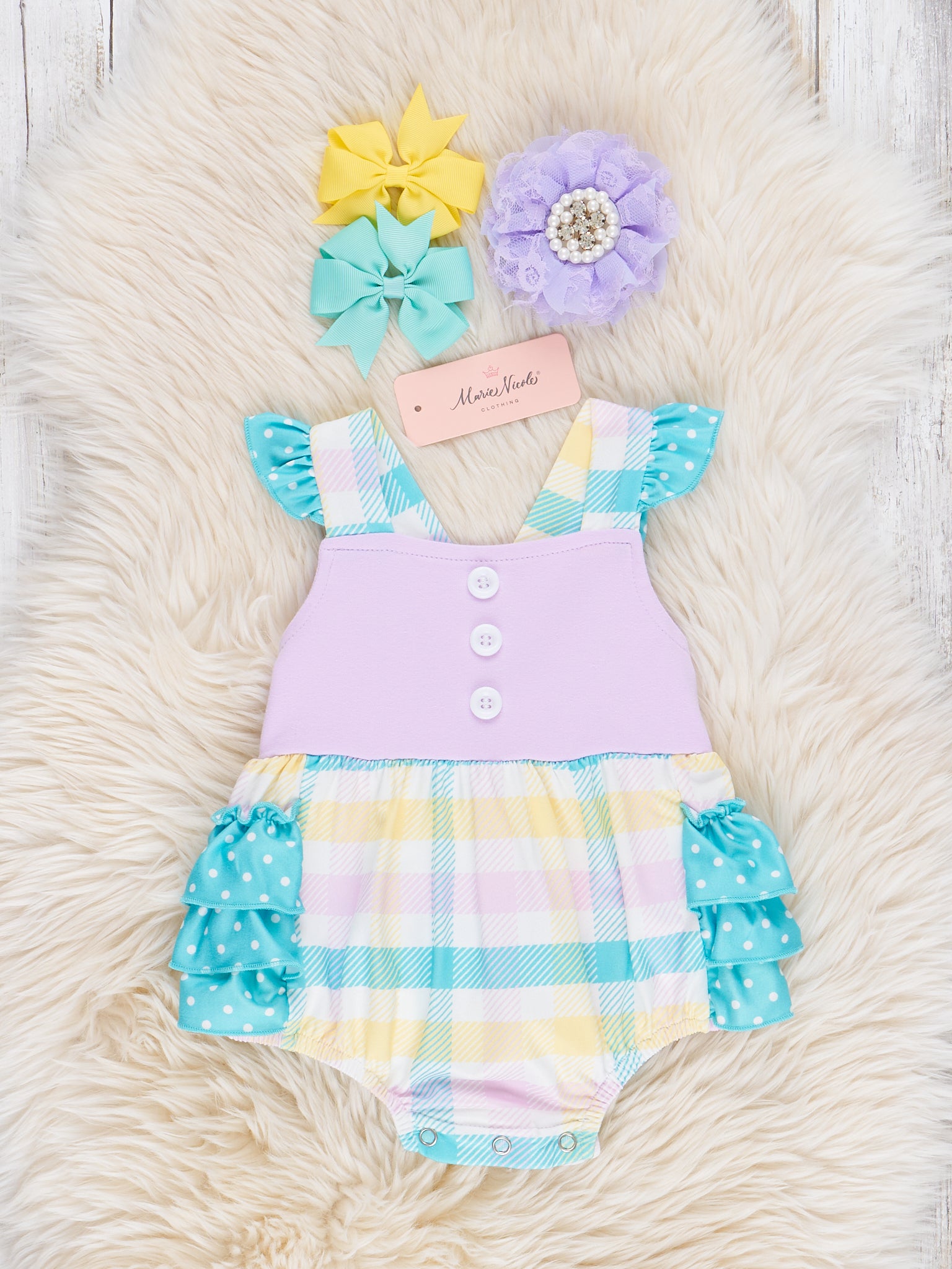 A special spring set for your lovely girls! This bubble by Marie Nicole Clothing features lavender plaid, decorative buttons, a polka dot ruffle butt, flutter trim, & adjustable straps.