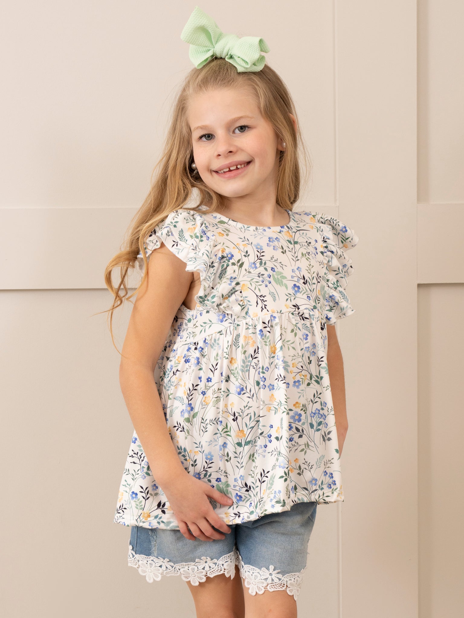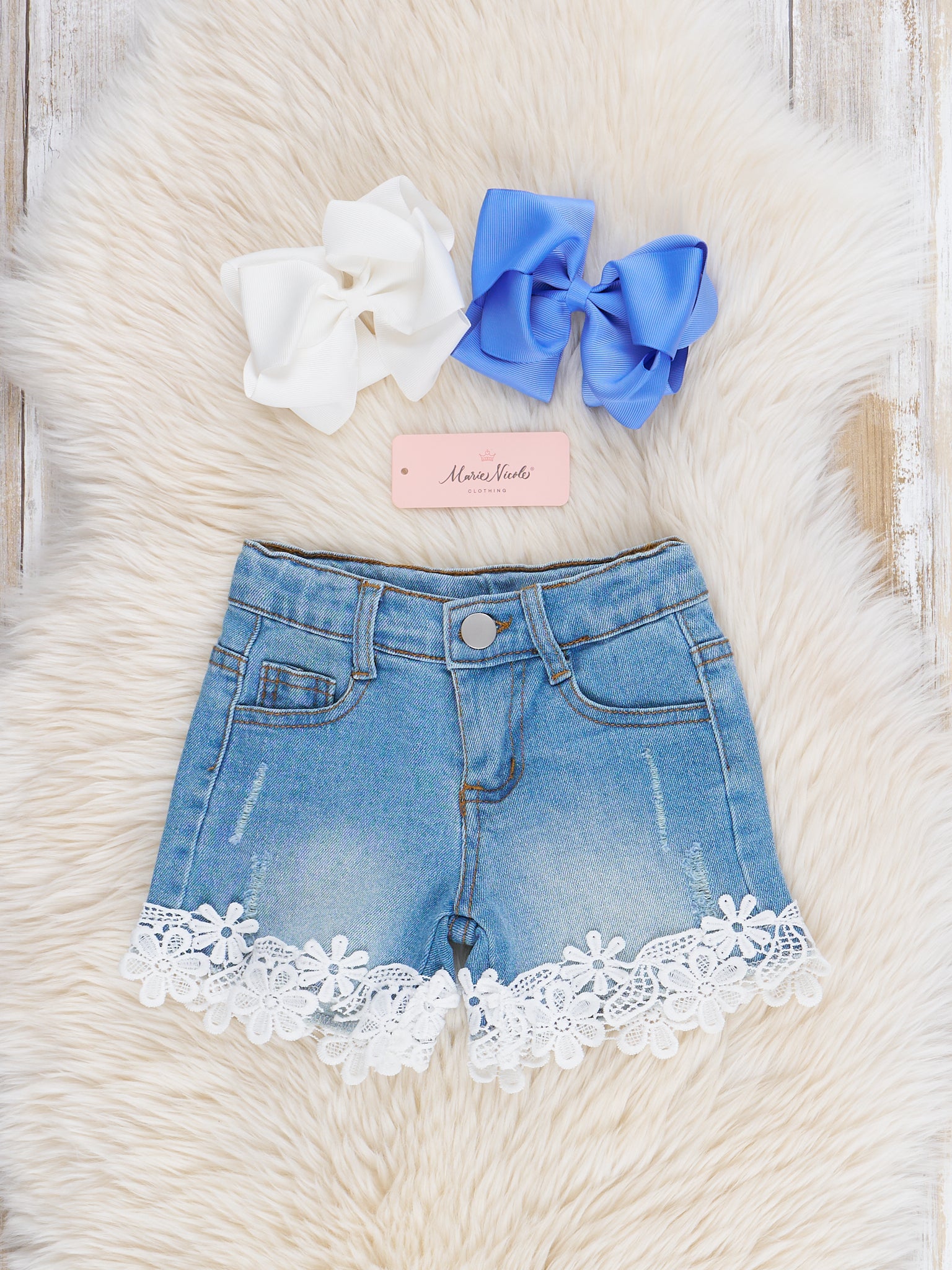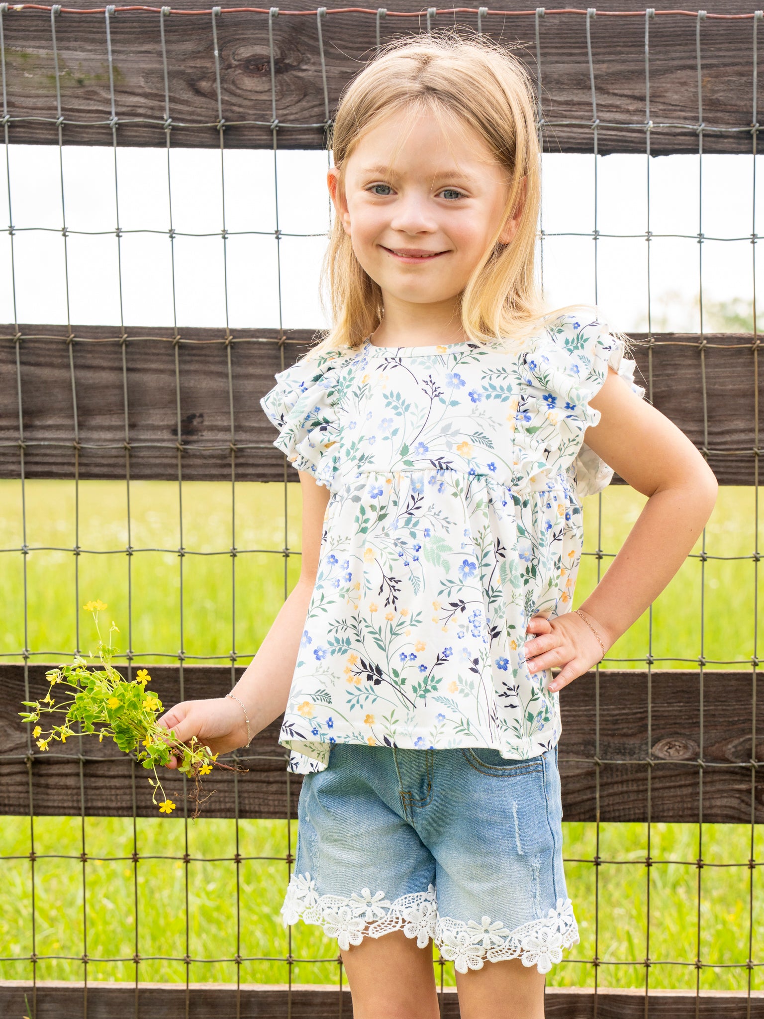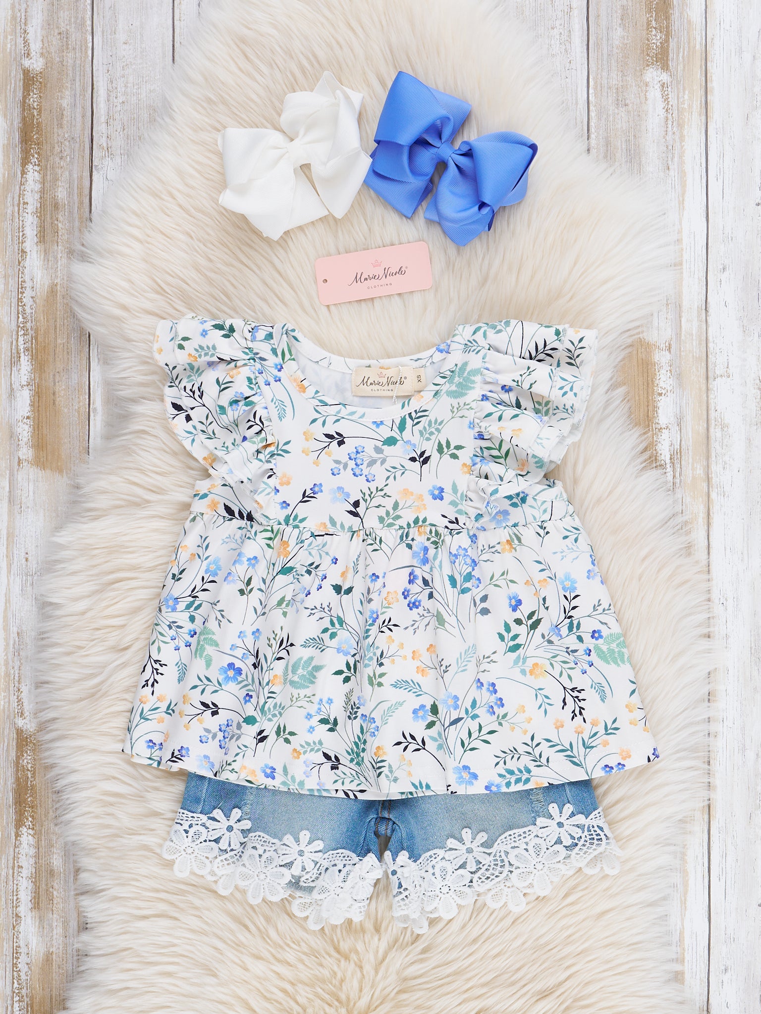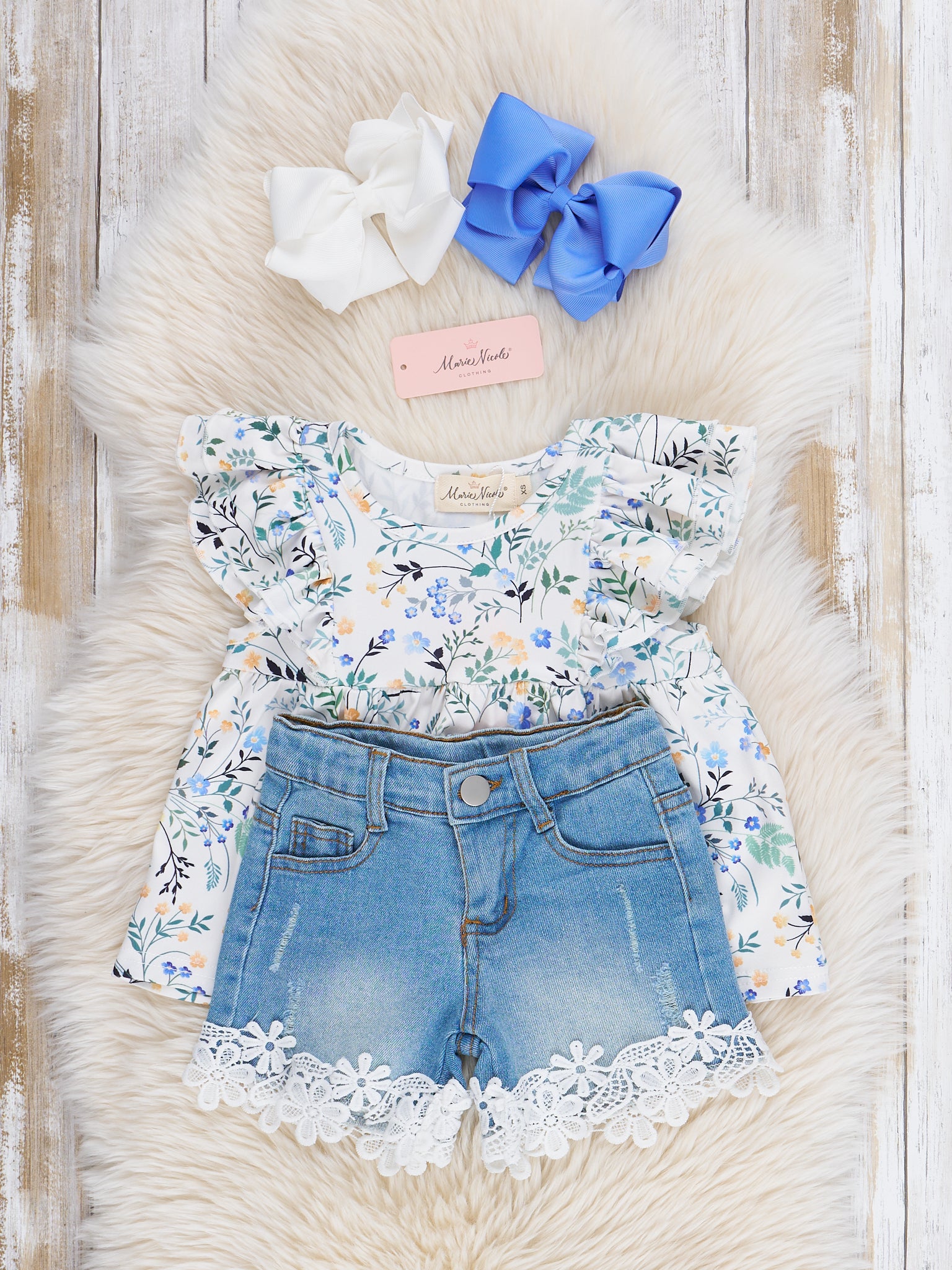 Get ready for playful adventures with our Lavender Blooms Lace Hem Denim Outfit. This charming ensemble features ruffle sleeves and a floral printed top, paired with darling denim shorts adorned with lace hem. Perfect for your little fashionista and her fun-loving spirit!