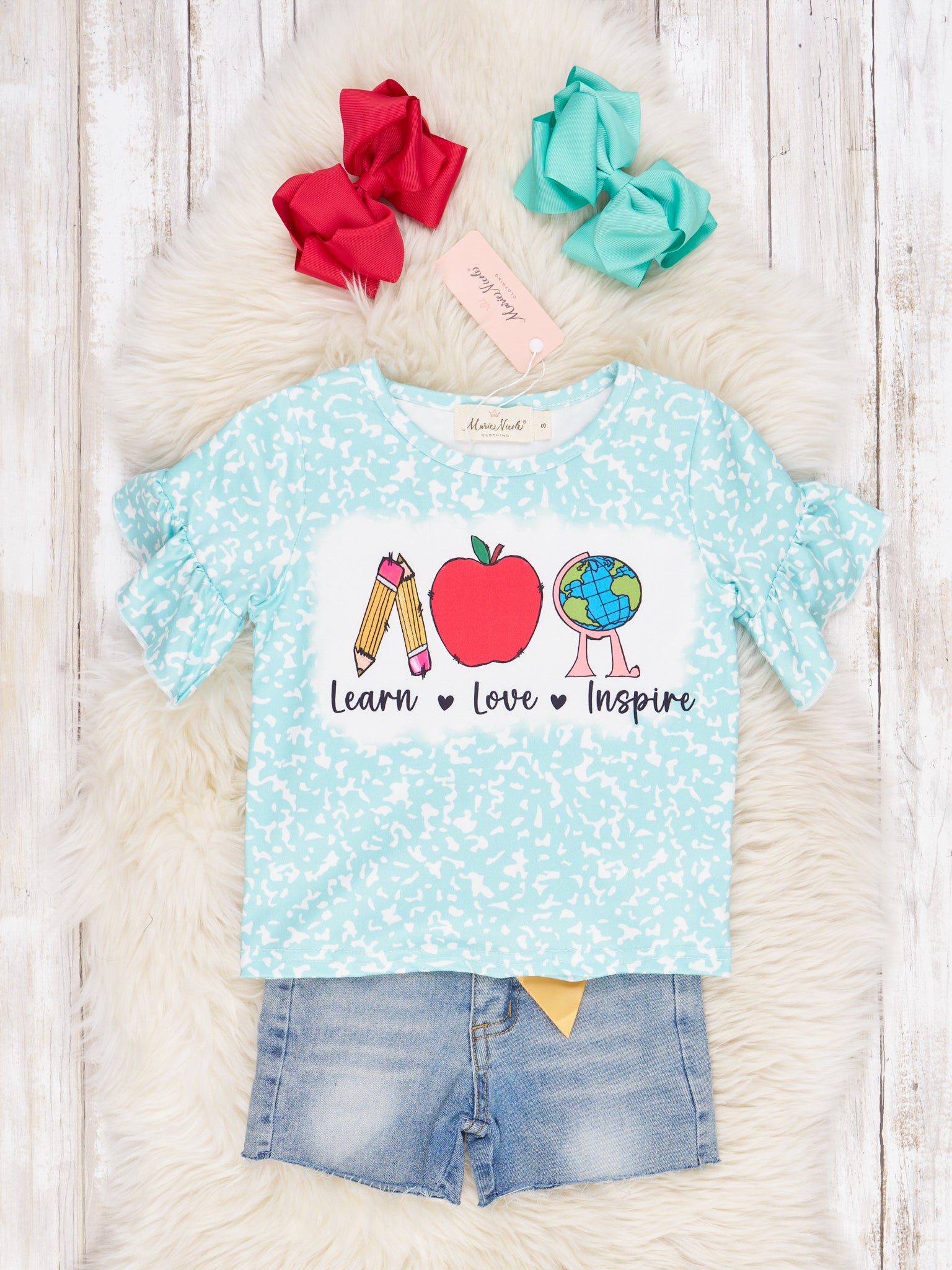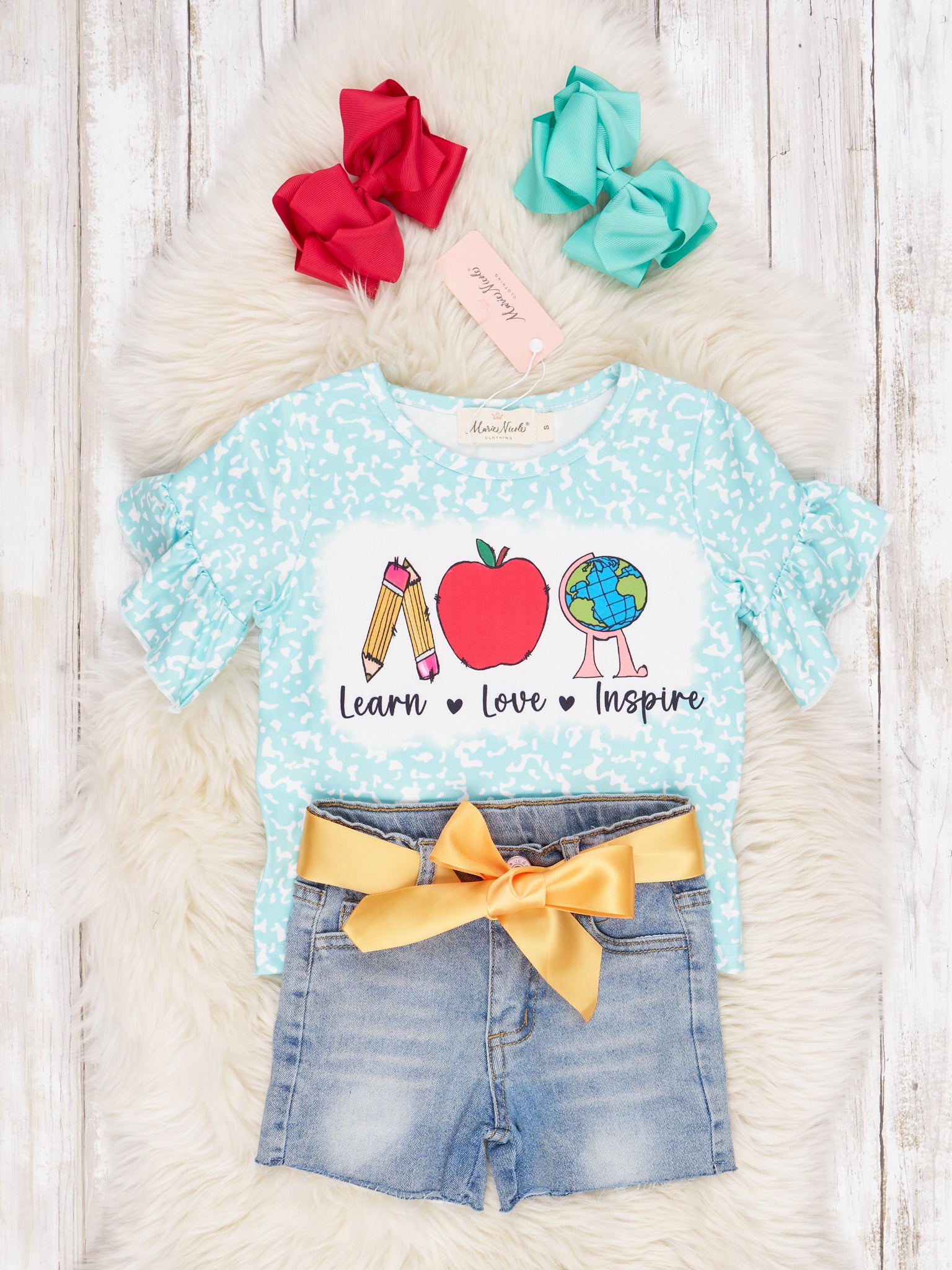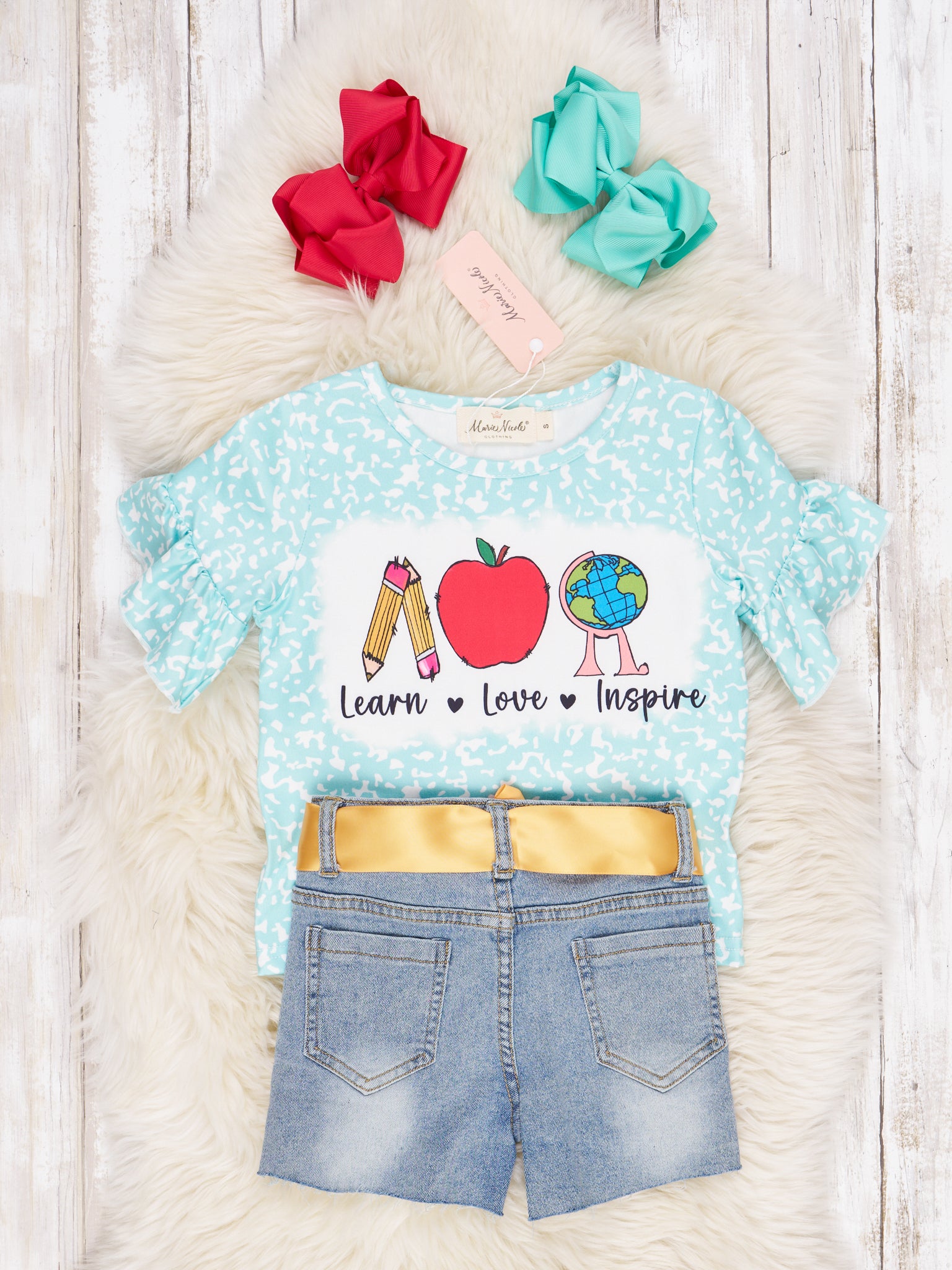 Dress your little one up in this fashionable and fun "Learn, Love, Inspire" Ruffle Denim Outfit! With its cute blue top, an inspiring message, and comfy denim shorts complemented by a ribbon belt, it's the perfect blend of learning, love, and style!