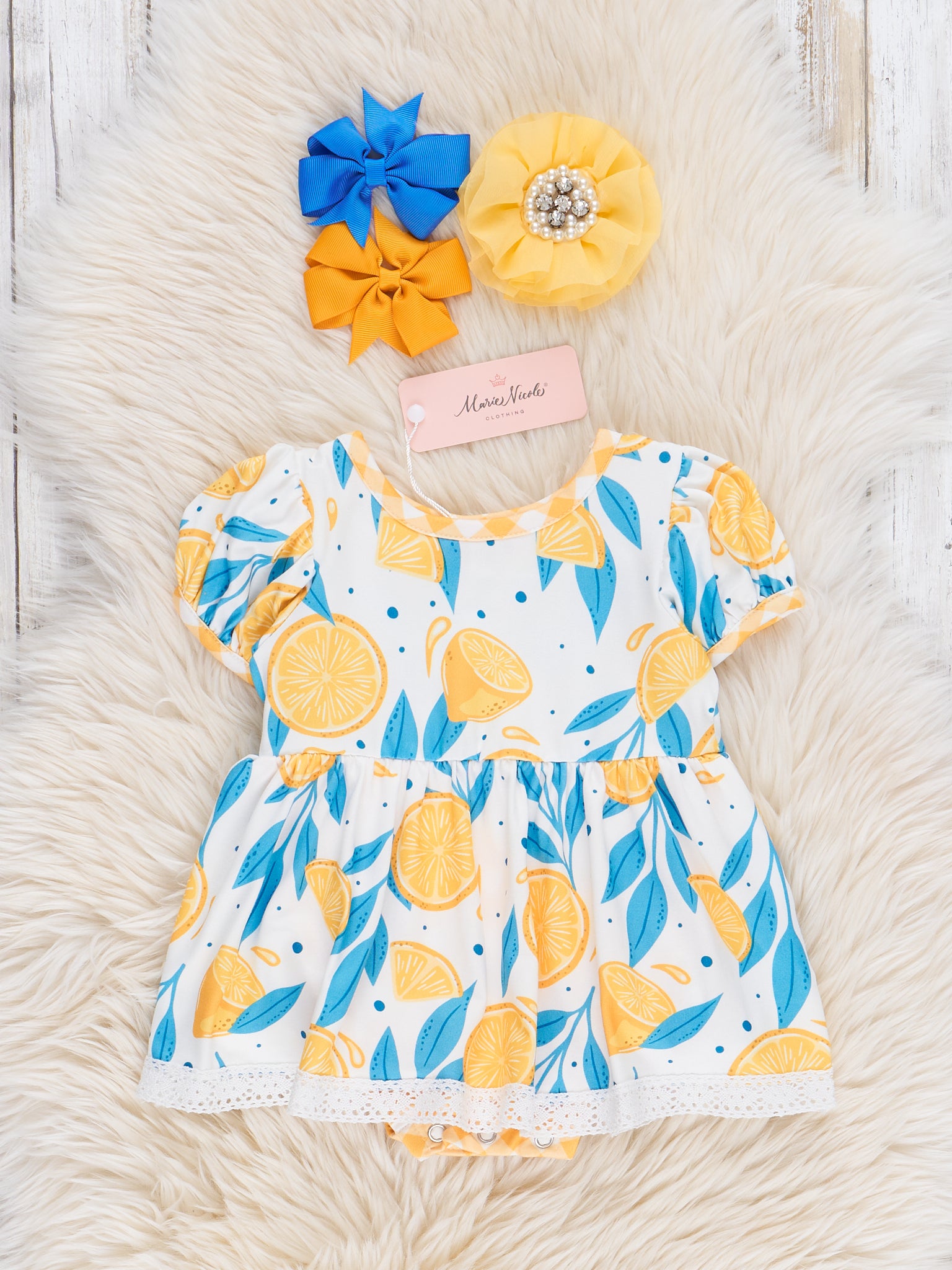 Let your little one bloom in this Lemons & Floral Lace Ruffle Bubble from Marie Nicole Clothing. Perfect for summer, the vibrant lemon print and delicate lace trim add a touch of sweetness to any occasion. Sister sets available for twinning fun!