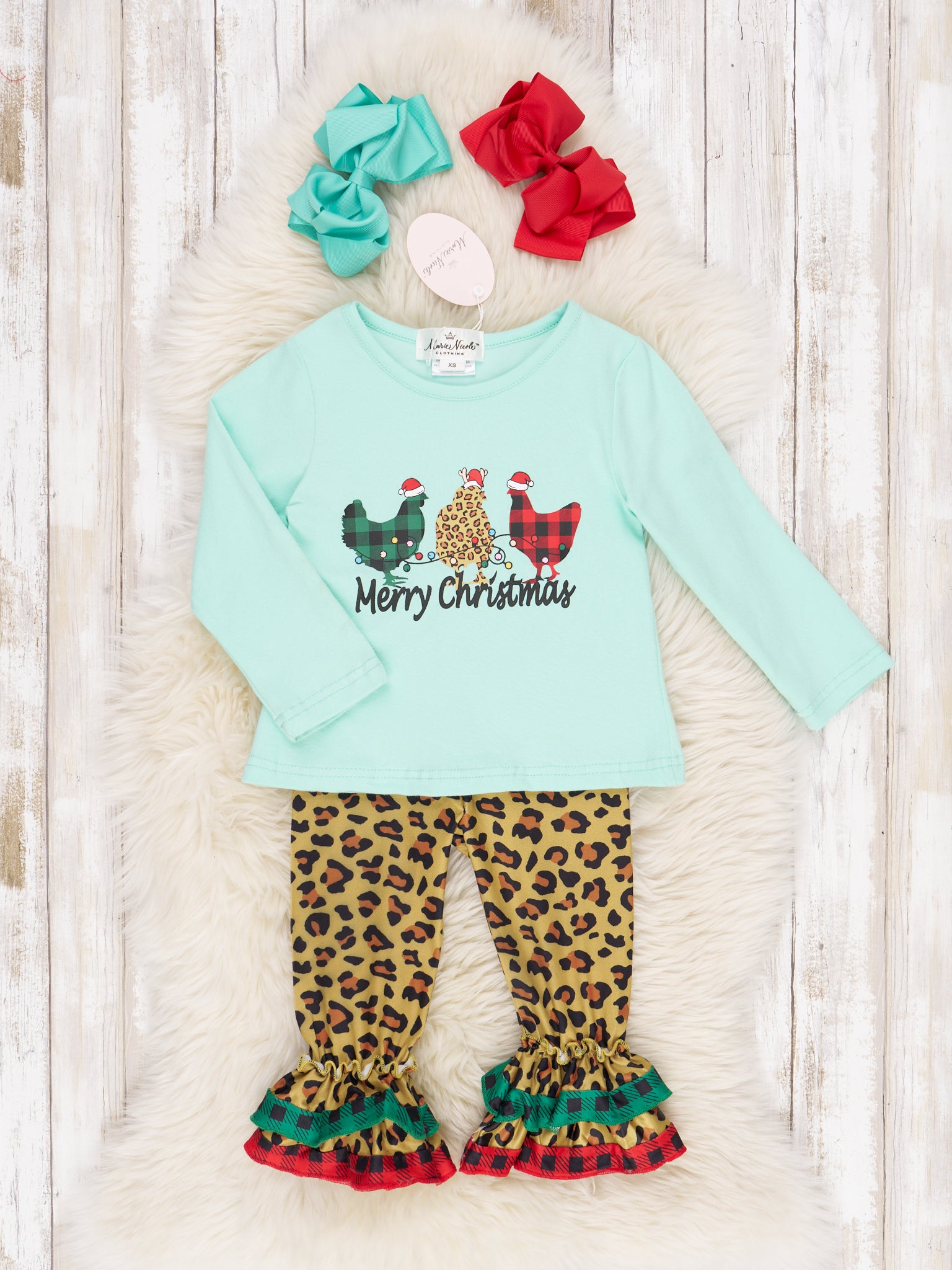 This merry sister set is an absolute showstopper! Featuring a turquoise top, chickens (yes, chickens!), a "Merry Christmas" sentiment, leopard pants, buffalo plaid, and ruffles, your little ones will be the talk of the town!