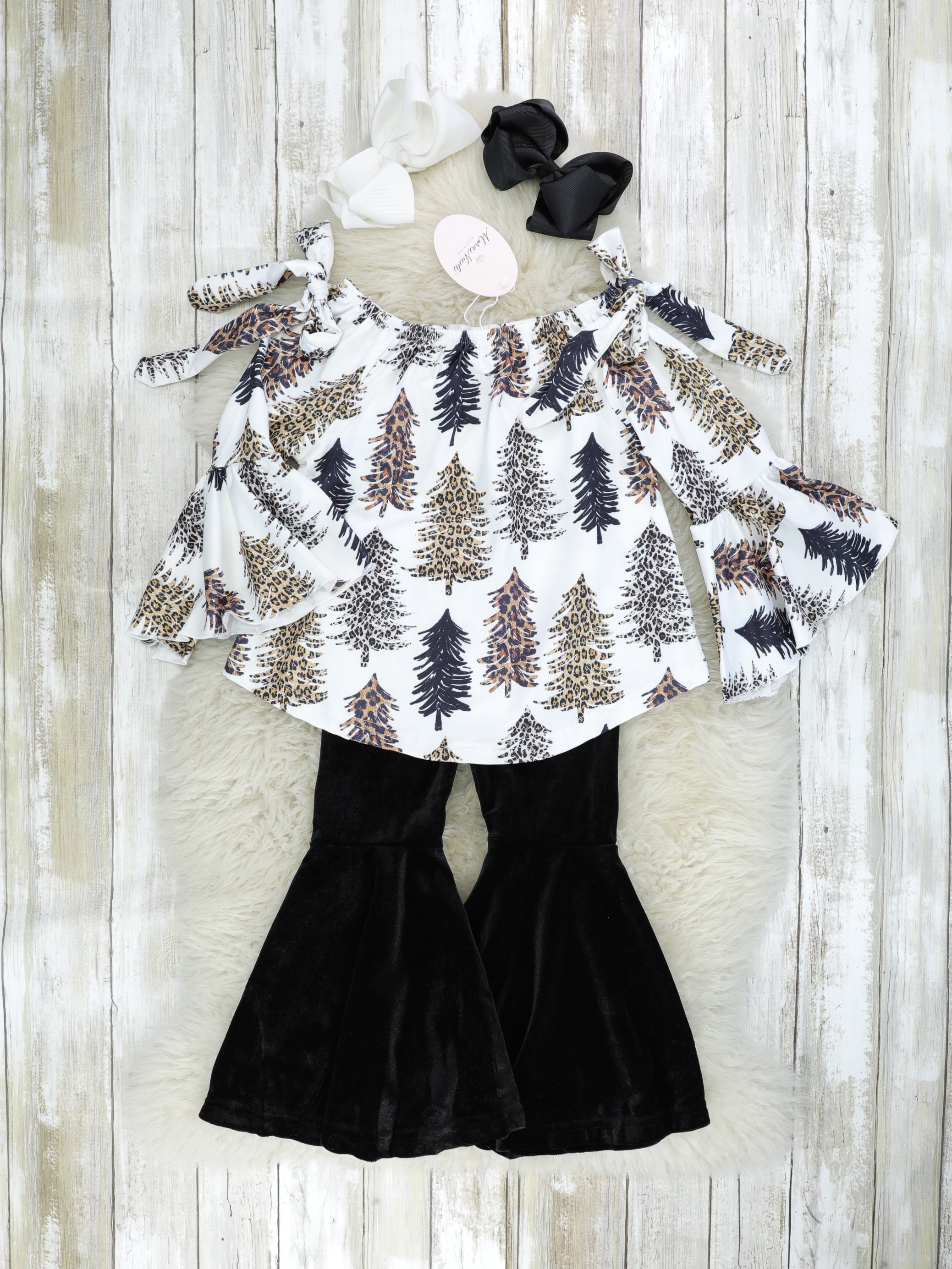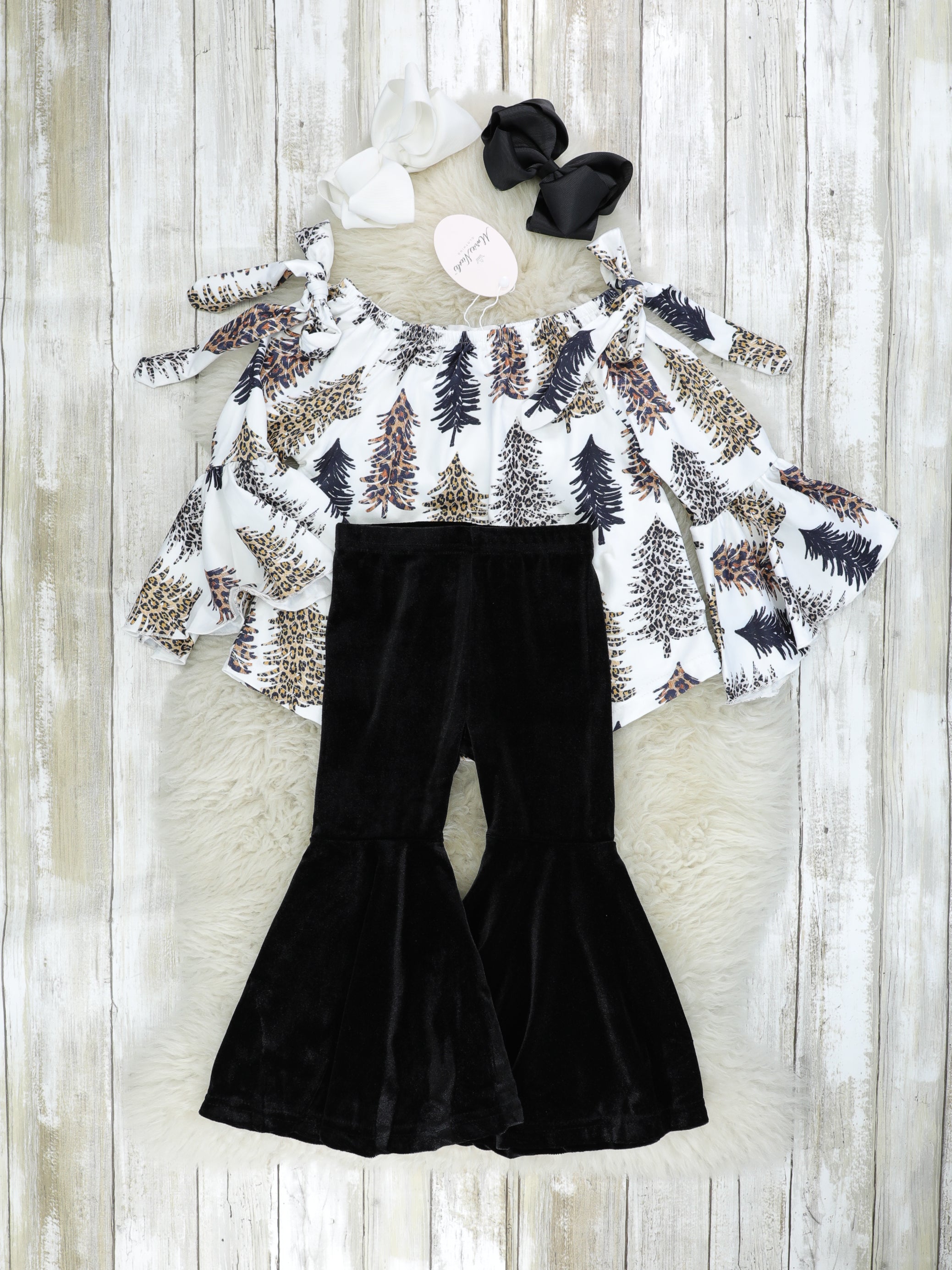 This darling outfit is fir sure a favorite! This outfit features an on or off the shoulder top with leopard Christmas tree details, bell sleeves, tie details, & black velvet bell bottoms.