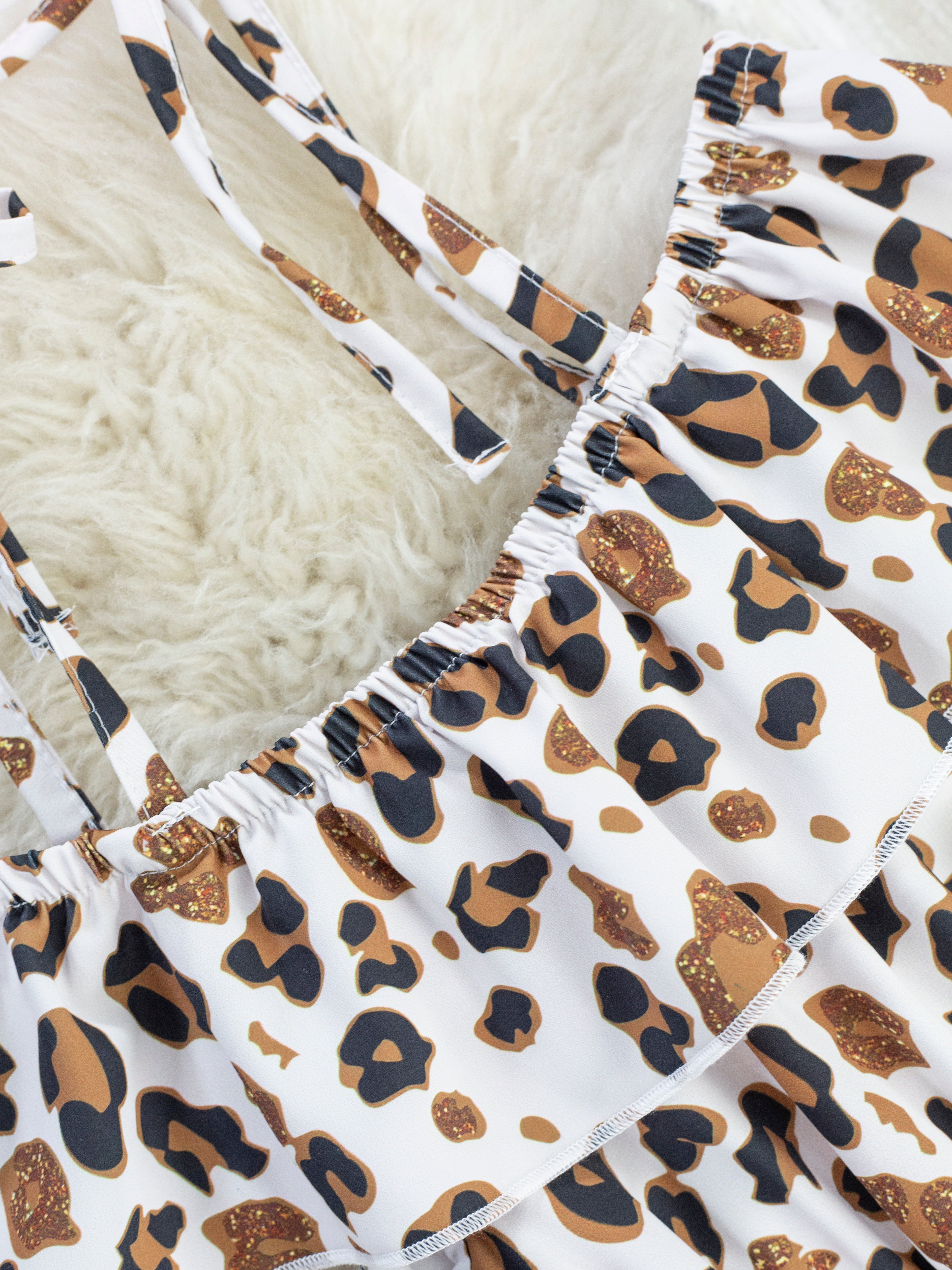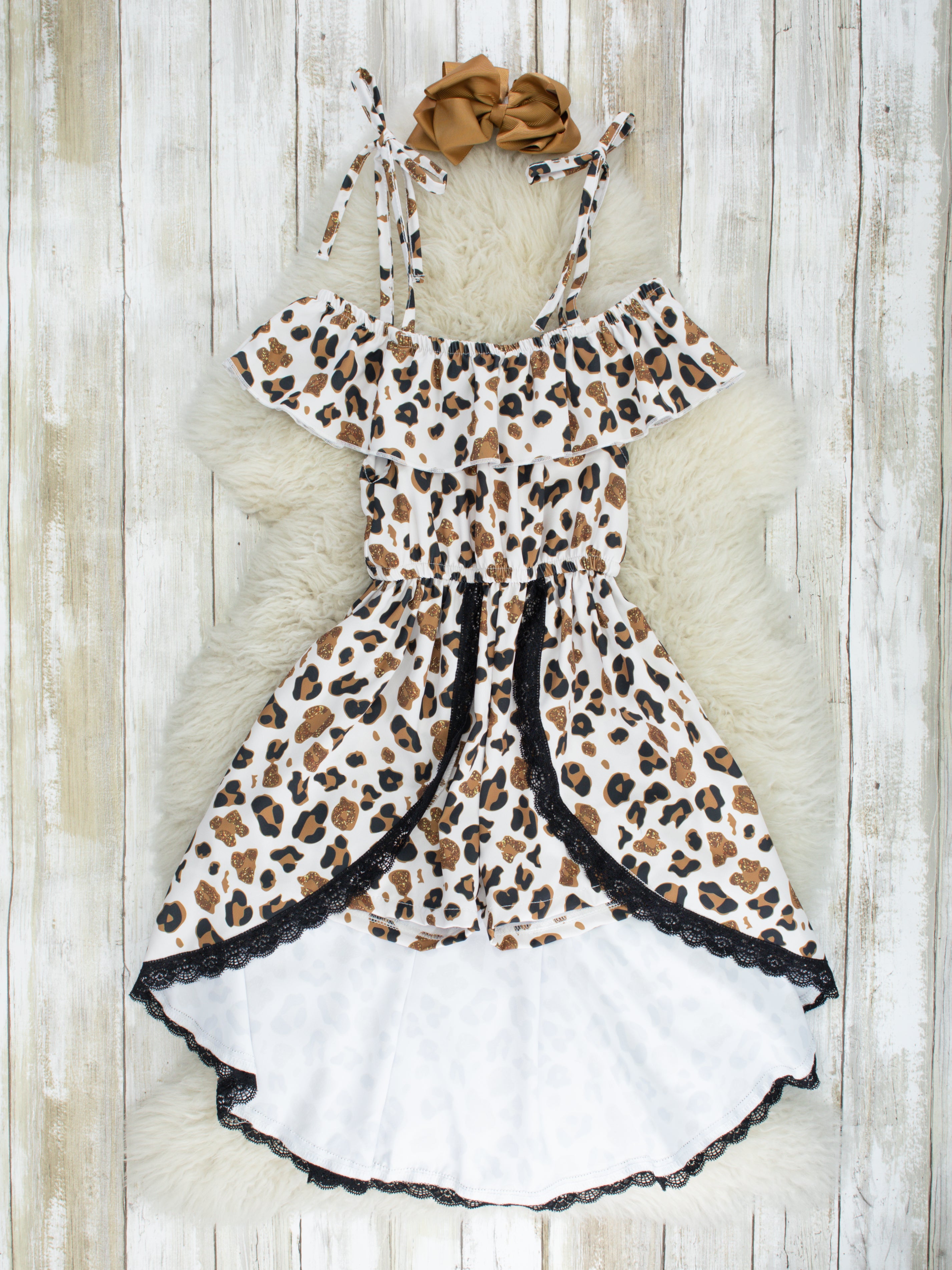 You've spotted the sweetest jumpsuit for your sassy girl! This jumpsuit features leopard print, ruffles, lace trim, a hi-low skirt, & adjustable tie straps.
