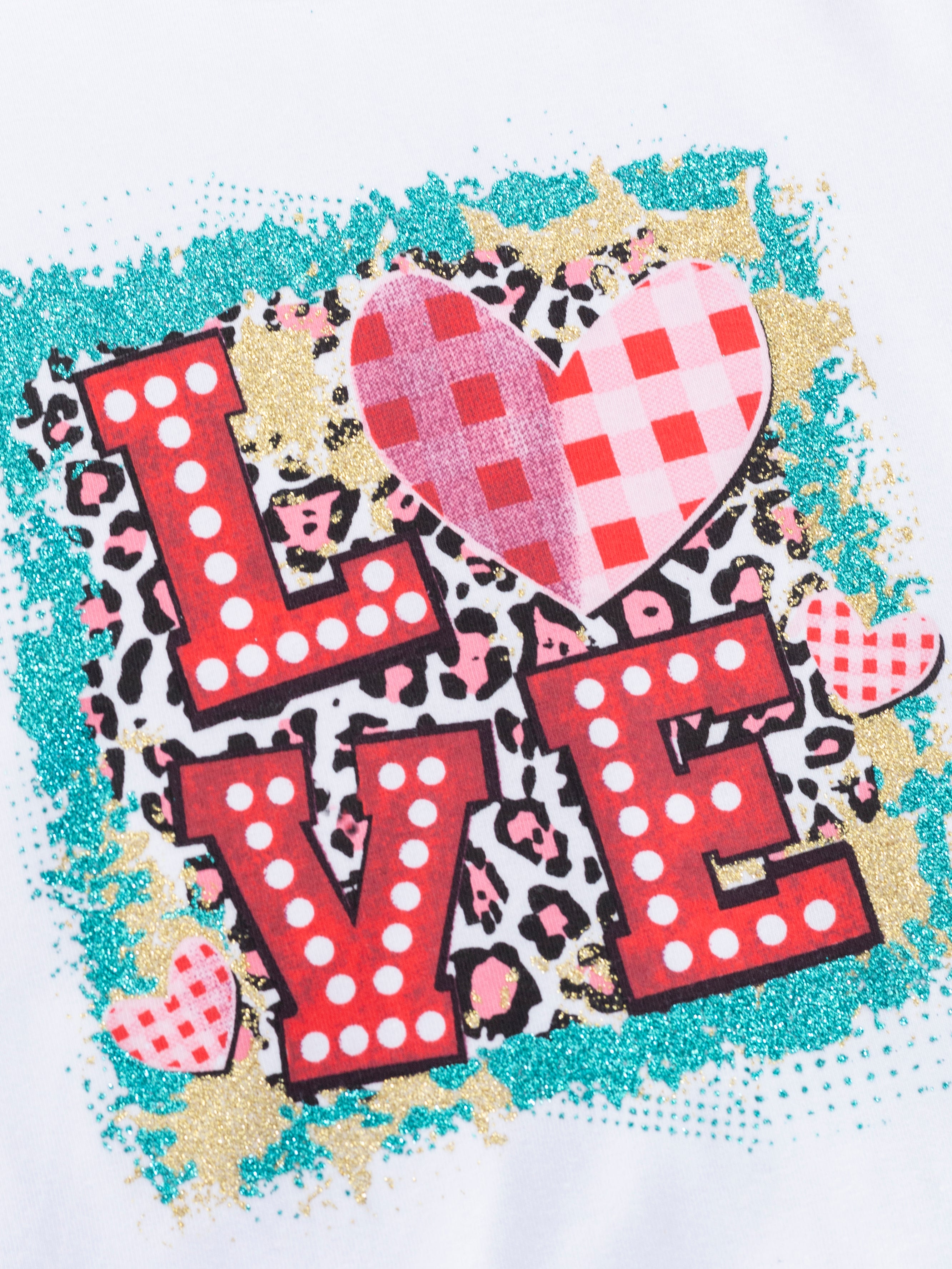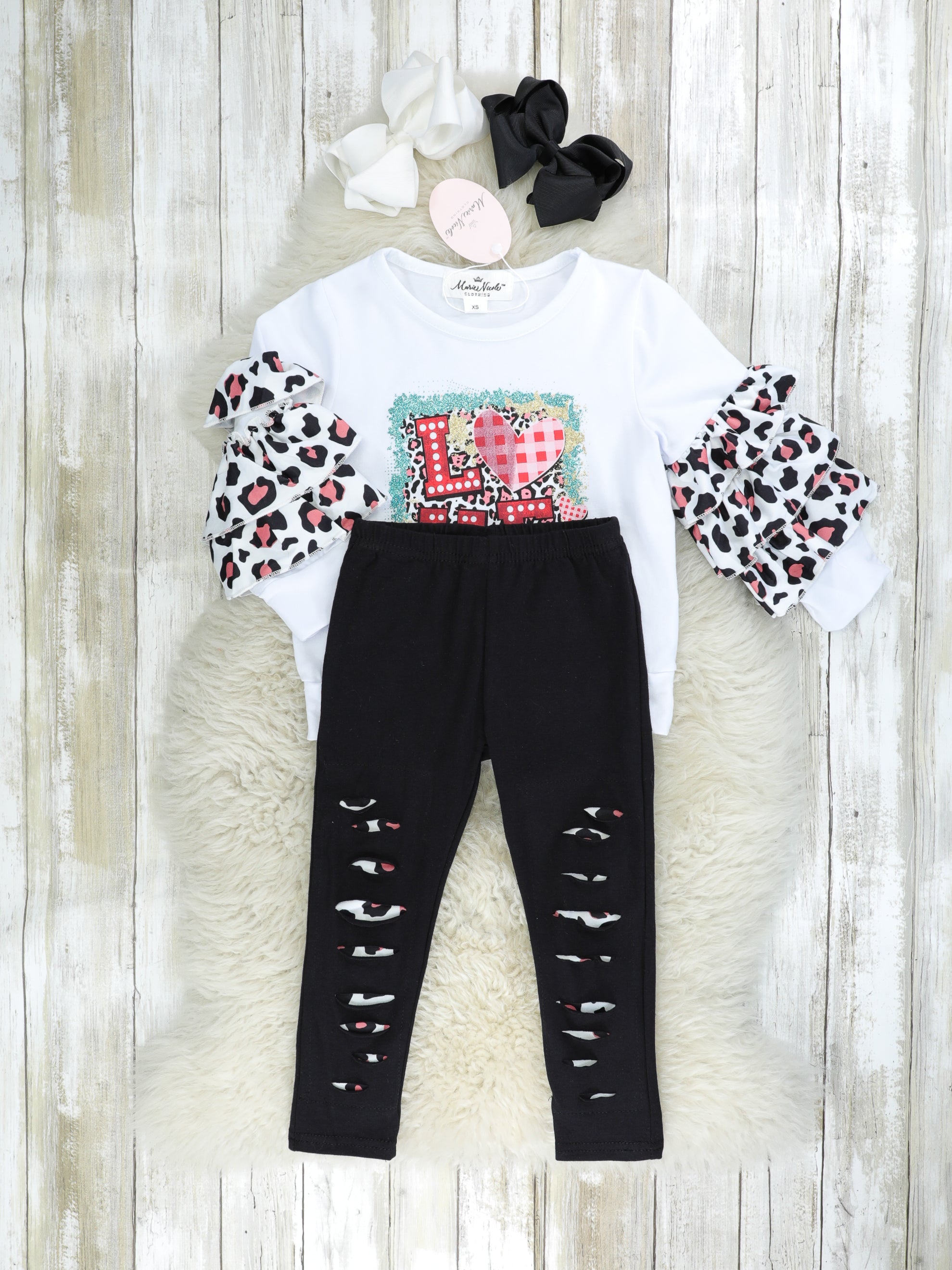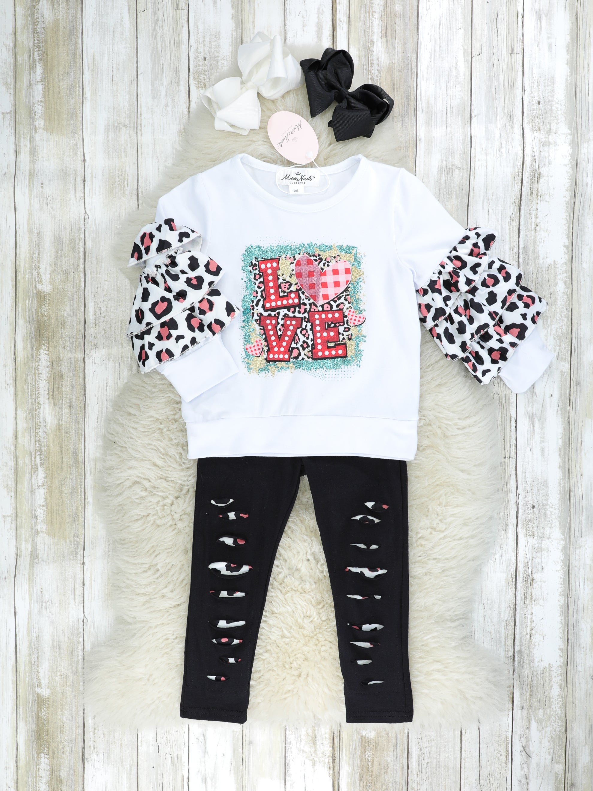 A charming outfit to see your little ones sparkle! This outfit features a white top with an adorable "LOVE" detail, leopard ruffles on the sleeves, & distressed leggings with leopard patches.