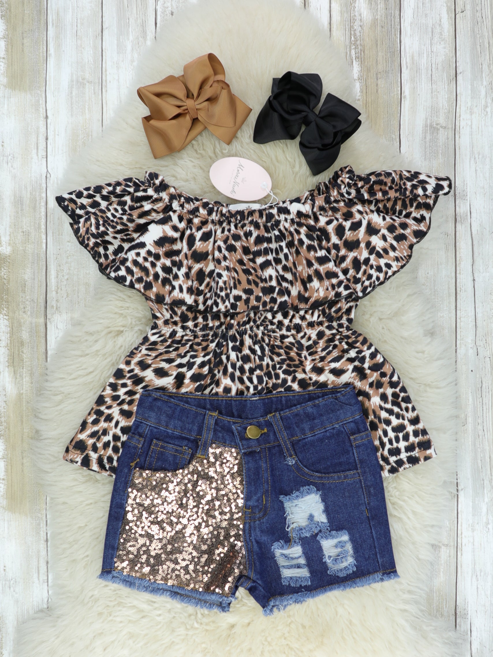 Leopard Off The Shoulder Top & Denim Sequin Shorts Outfit