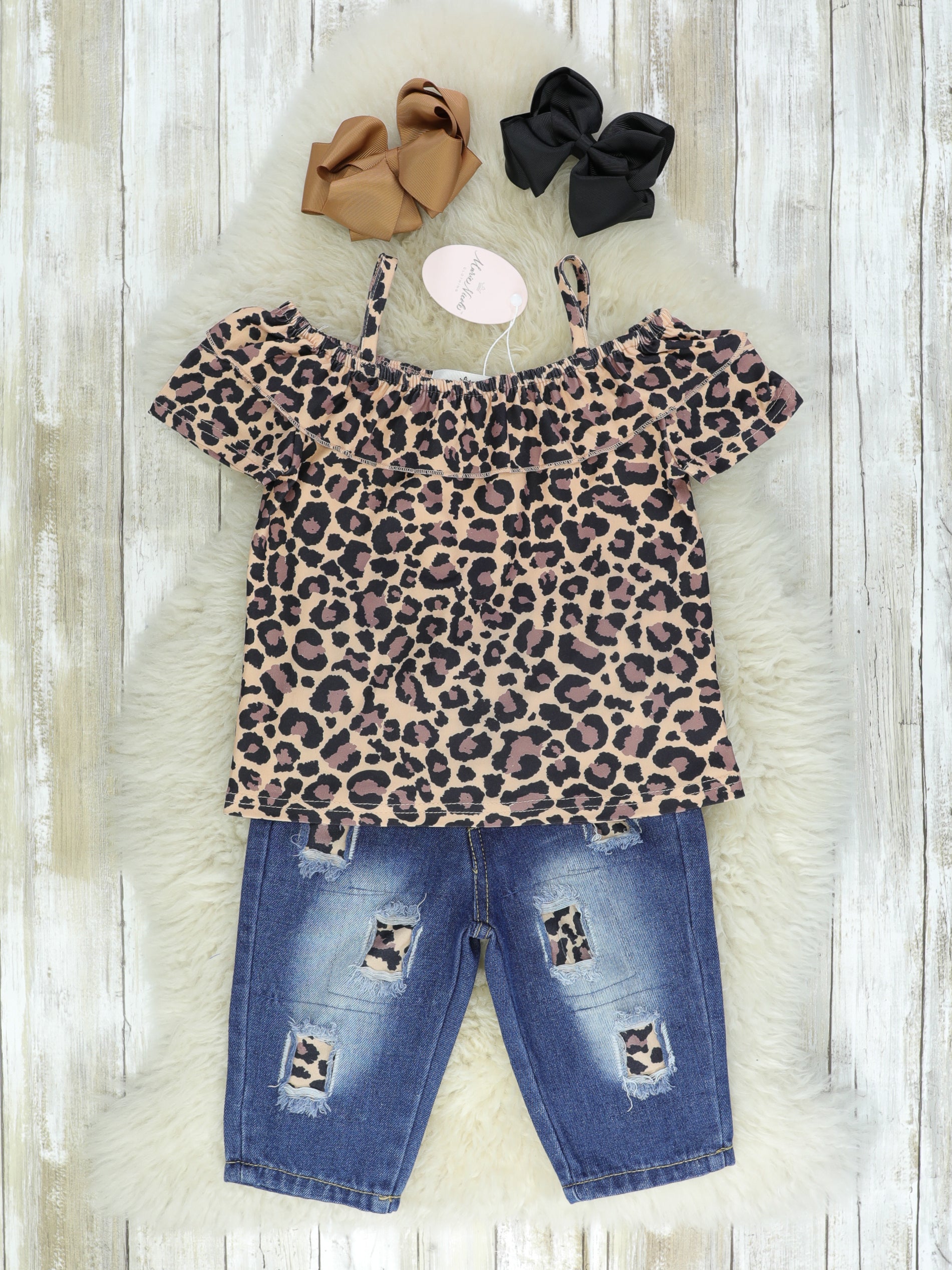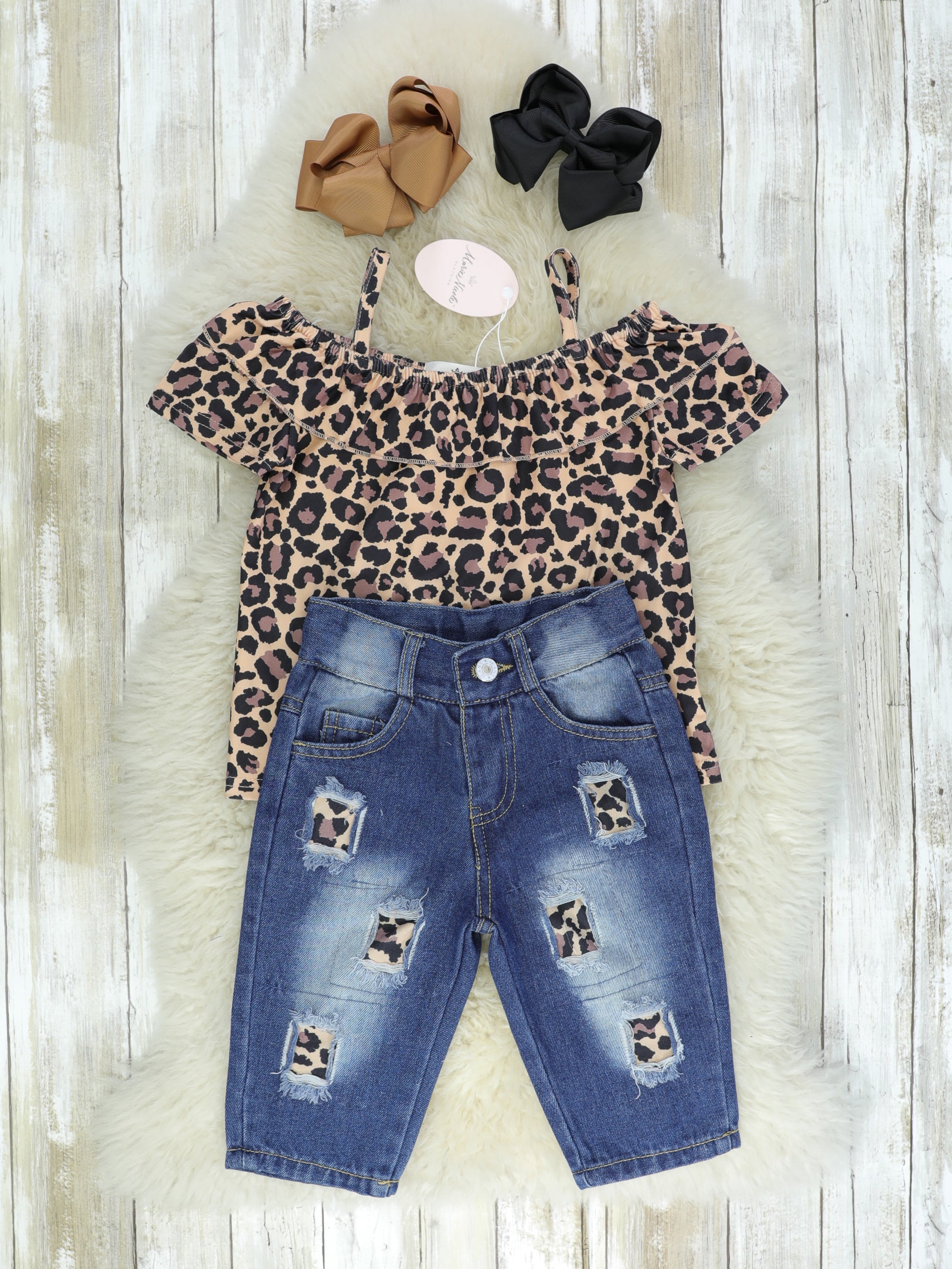 A cute outfit for a day at the zoo! This outfit features a cold-shouldered ruffle leopard top & Bermuda styled shorts with matching leopard patches.