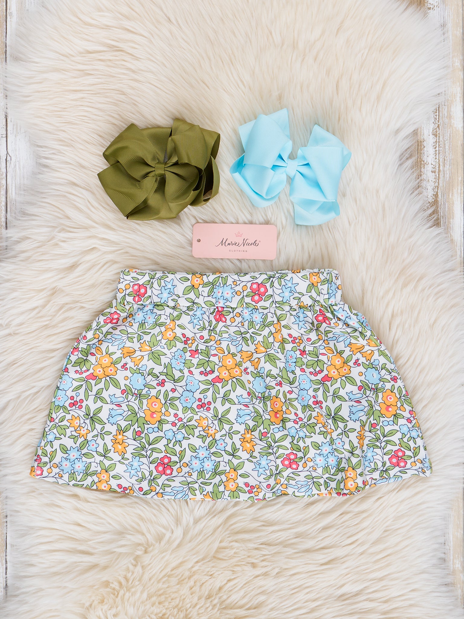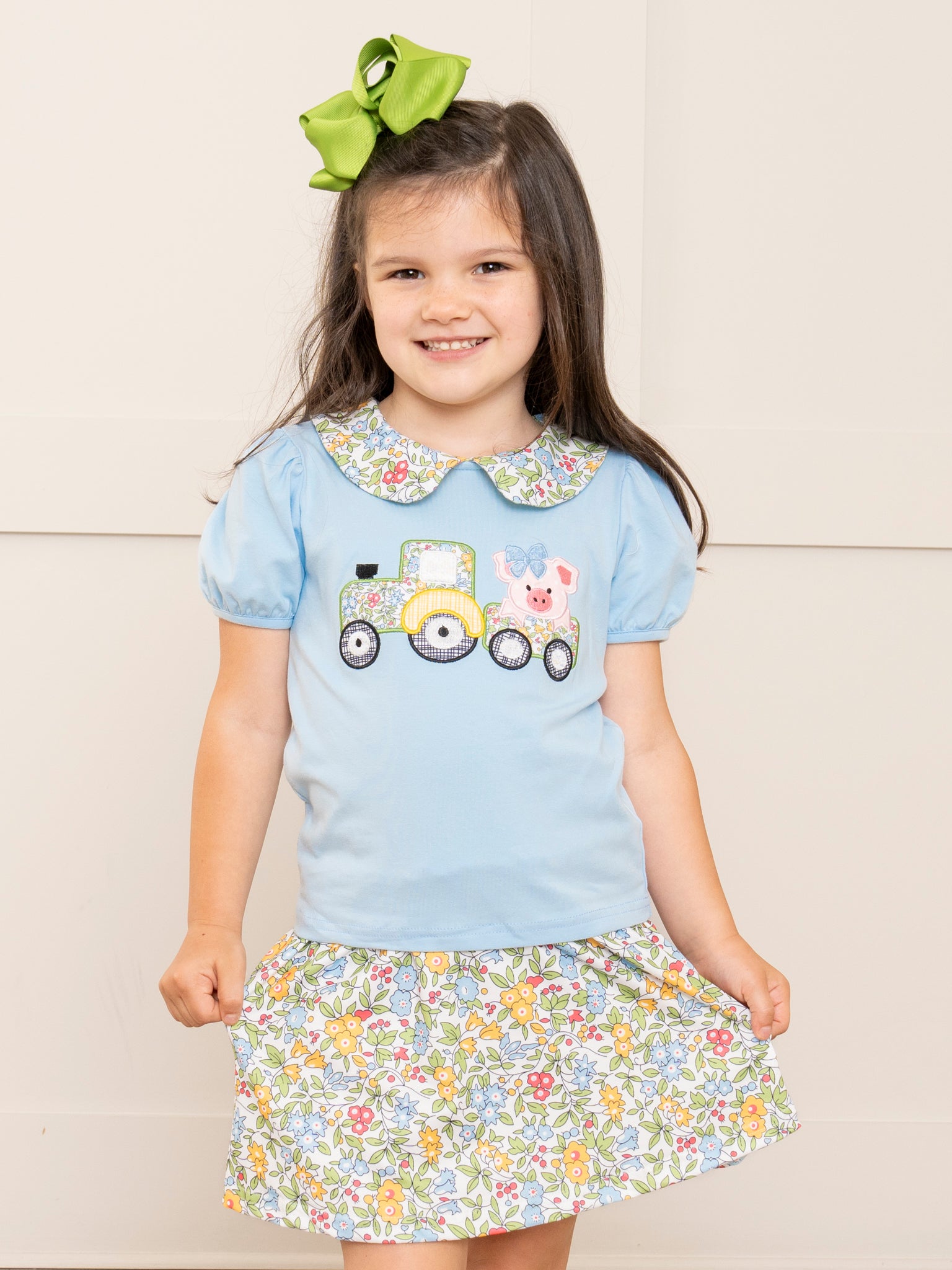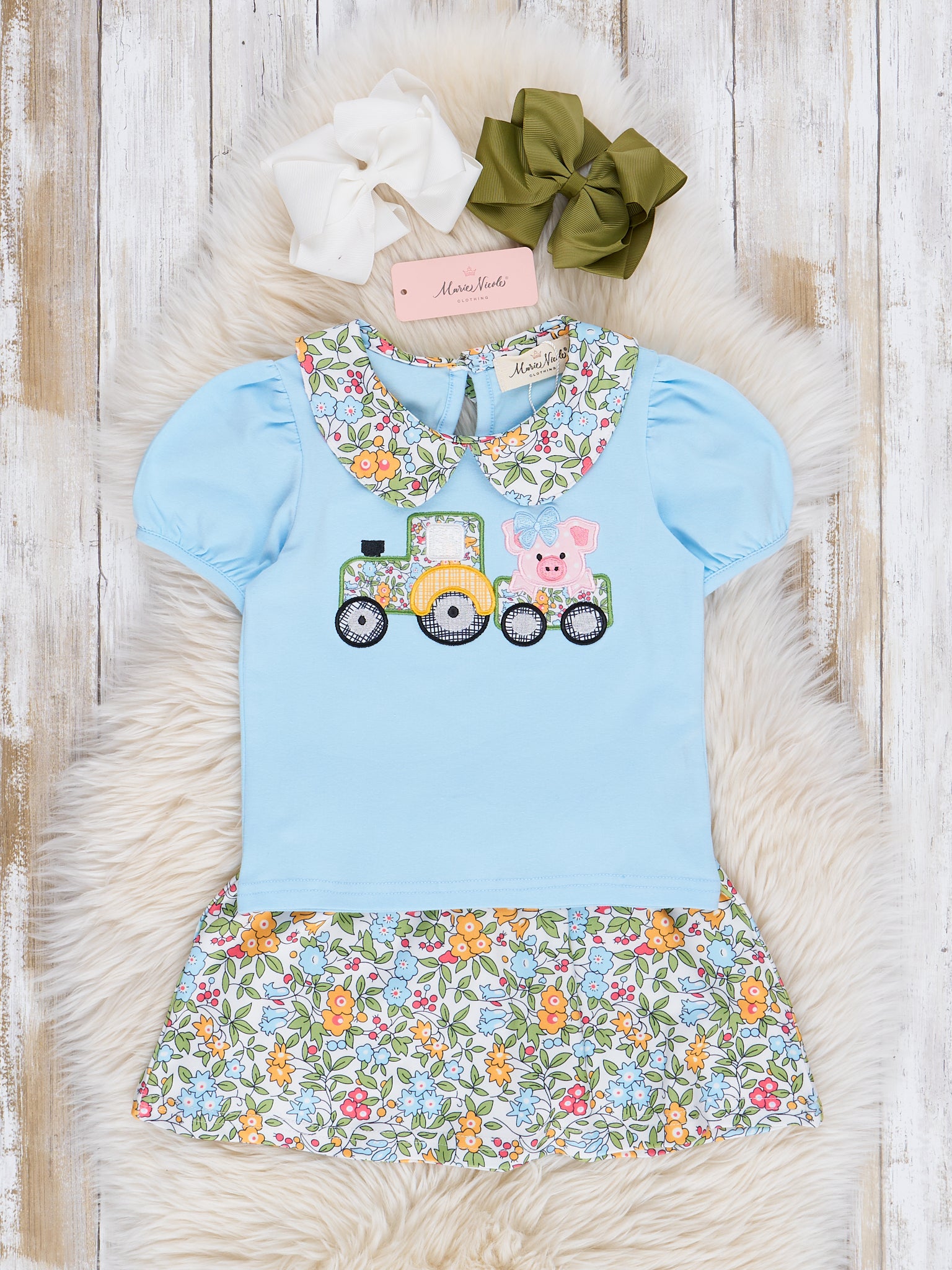 Light Blue Floral Embroidered Piggy Tractor Outfit w/ Skirt