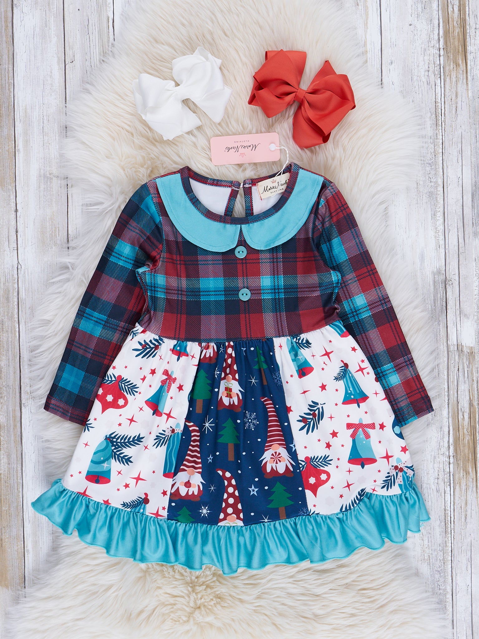 Light Blue & Red Plaid Holiday Ruffle Dress