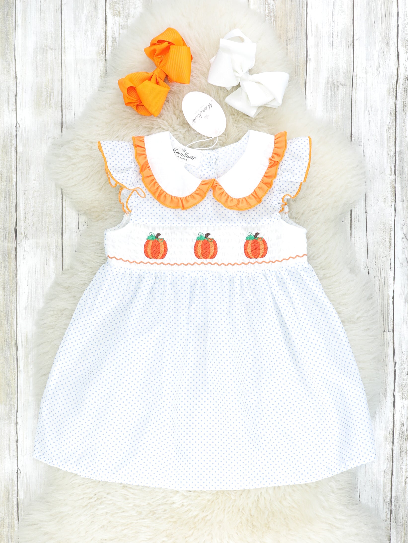 This sister set is perfect for your dainty pumpkin lovers! This light blue dress features smocking, embroidered pumpkins, a peter pan collar, flutter sleeves, & ruffle trim. This set is wonderful on warm fall days!