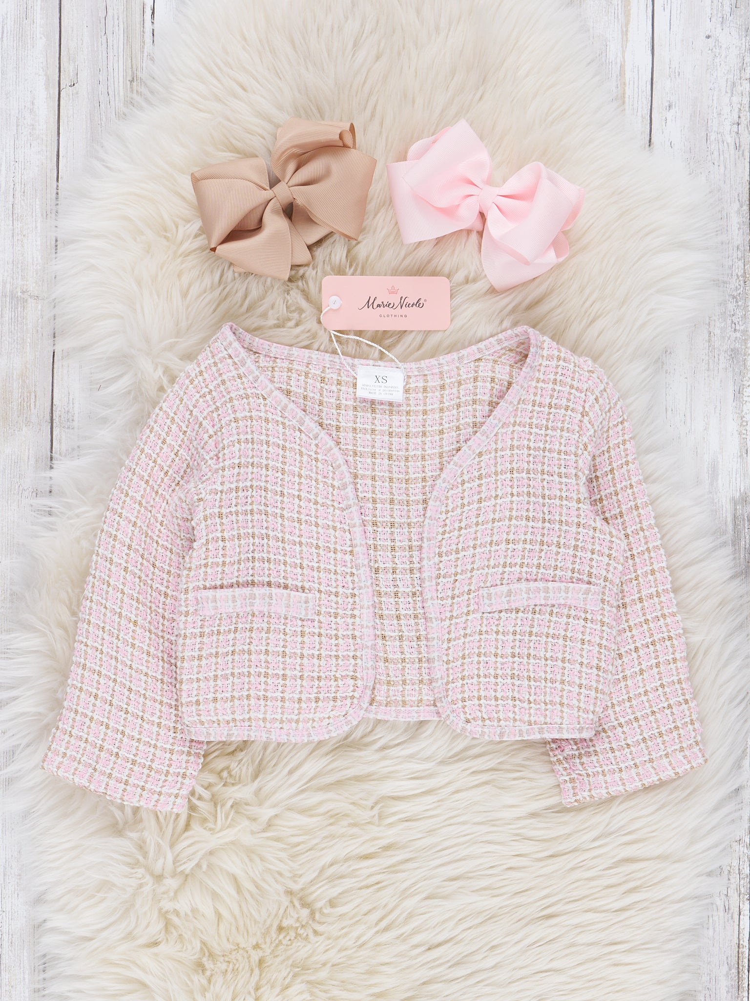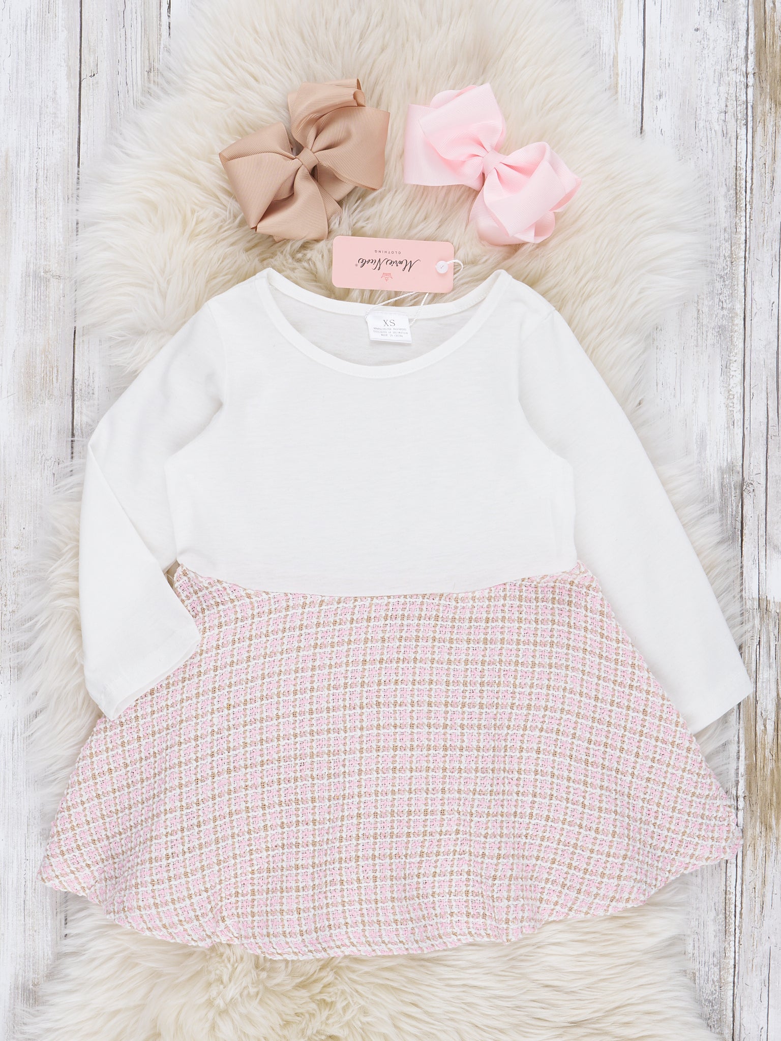 This darling dress is bound to keep your girls extra warm this season! This woven light pink checked dress and cardigan is so soft and comfortable.