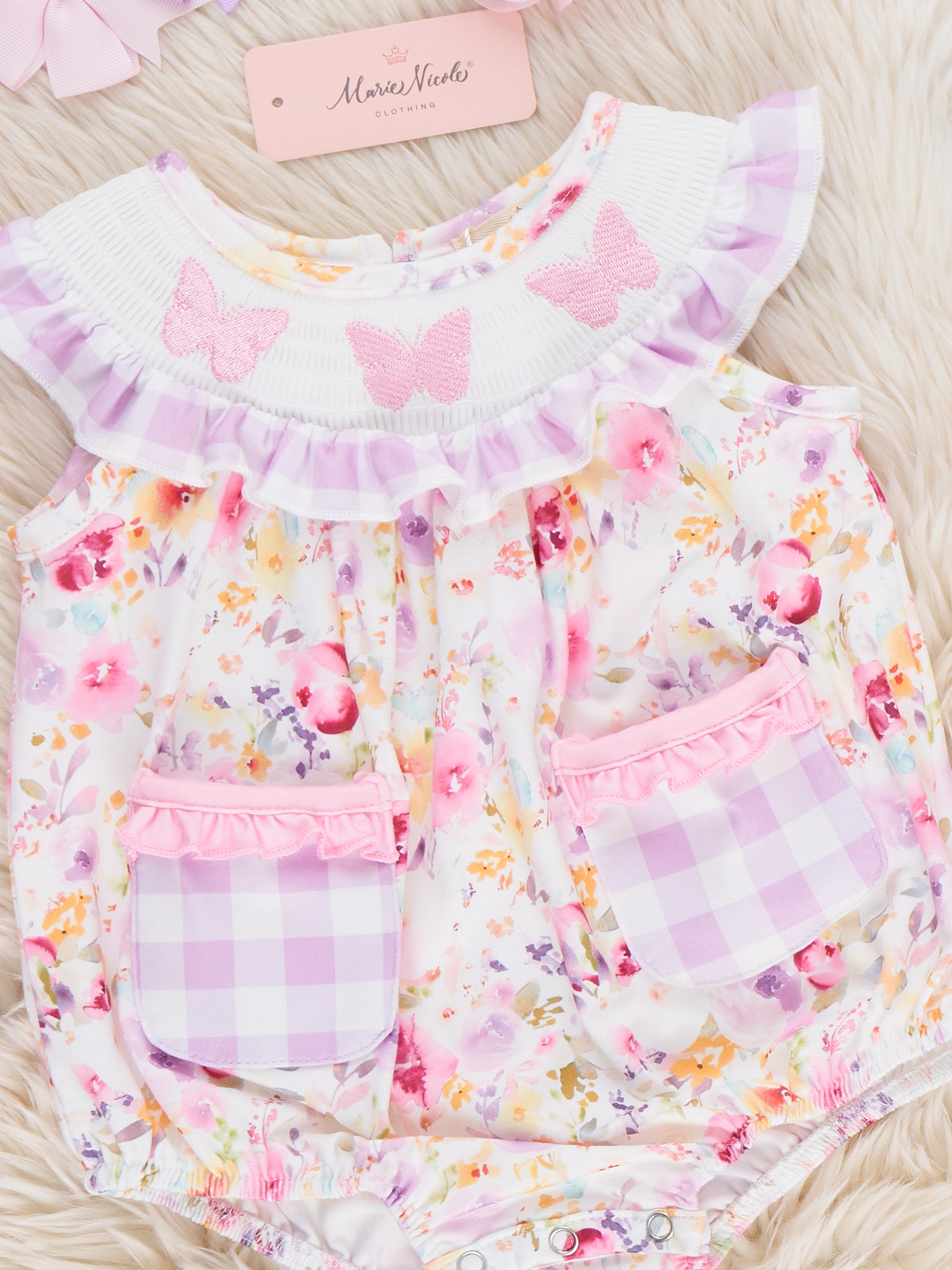 Lilac Butterfly Garden Smocked Bubble Romper