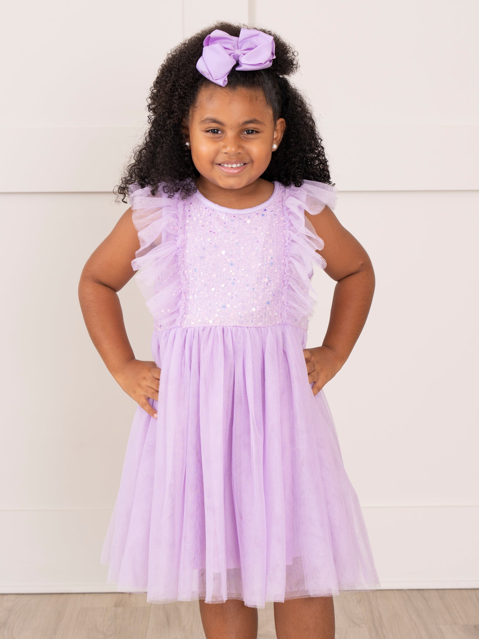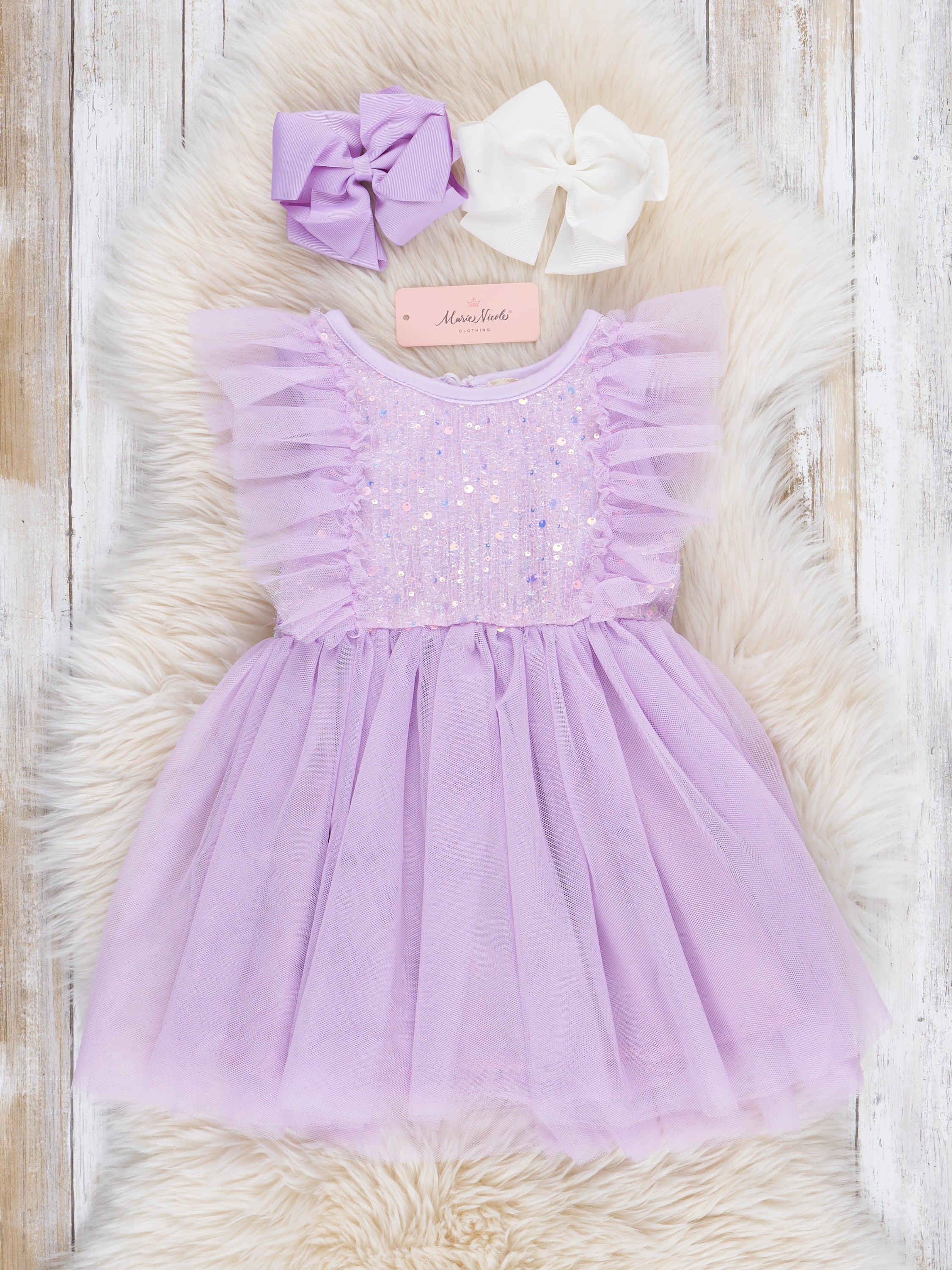 This sweet Lilac Flutter Tulle Dress will have your little girl twirling with joy! Designed specially for MNC, the delicate flutter sleeves and lined tulle skirt add a whimsical touch, while the sparkling sequin bodice adds a fun and glamorous element. Perfect for any special occasion, this dress will make your little one feel like a princess!