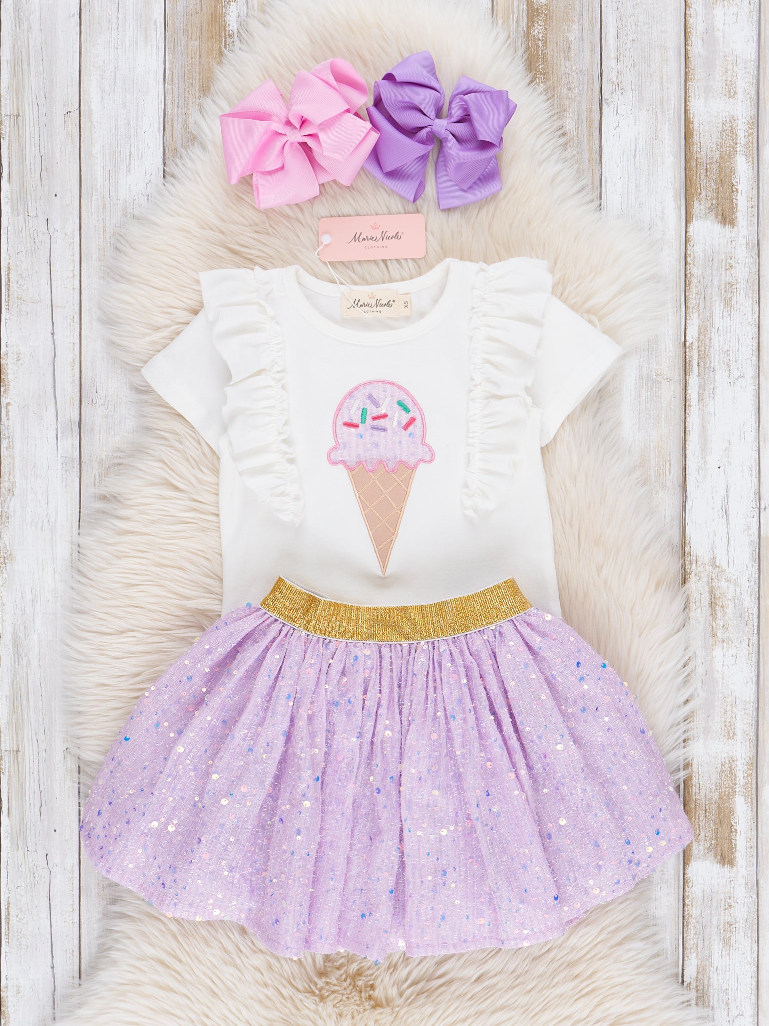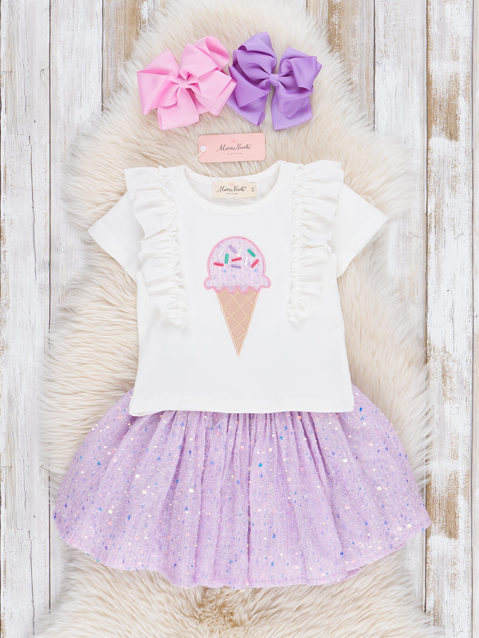 This summer, dress your little girl in this fun and quirky Lilac Ice Cream Cone Outfit from Marie Nicole Clothing. The white ruffle top features an embroidered ice cream cone, while the lilac tulle skirt is adorned with beaded sequins for a touch of whimsy. Perfect for any summer day (or ice cream shop visit!)