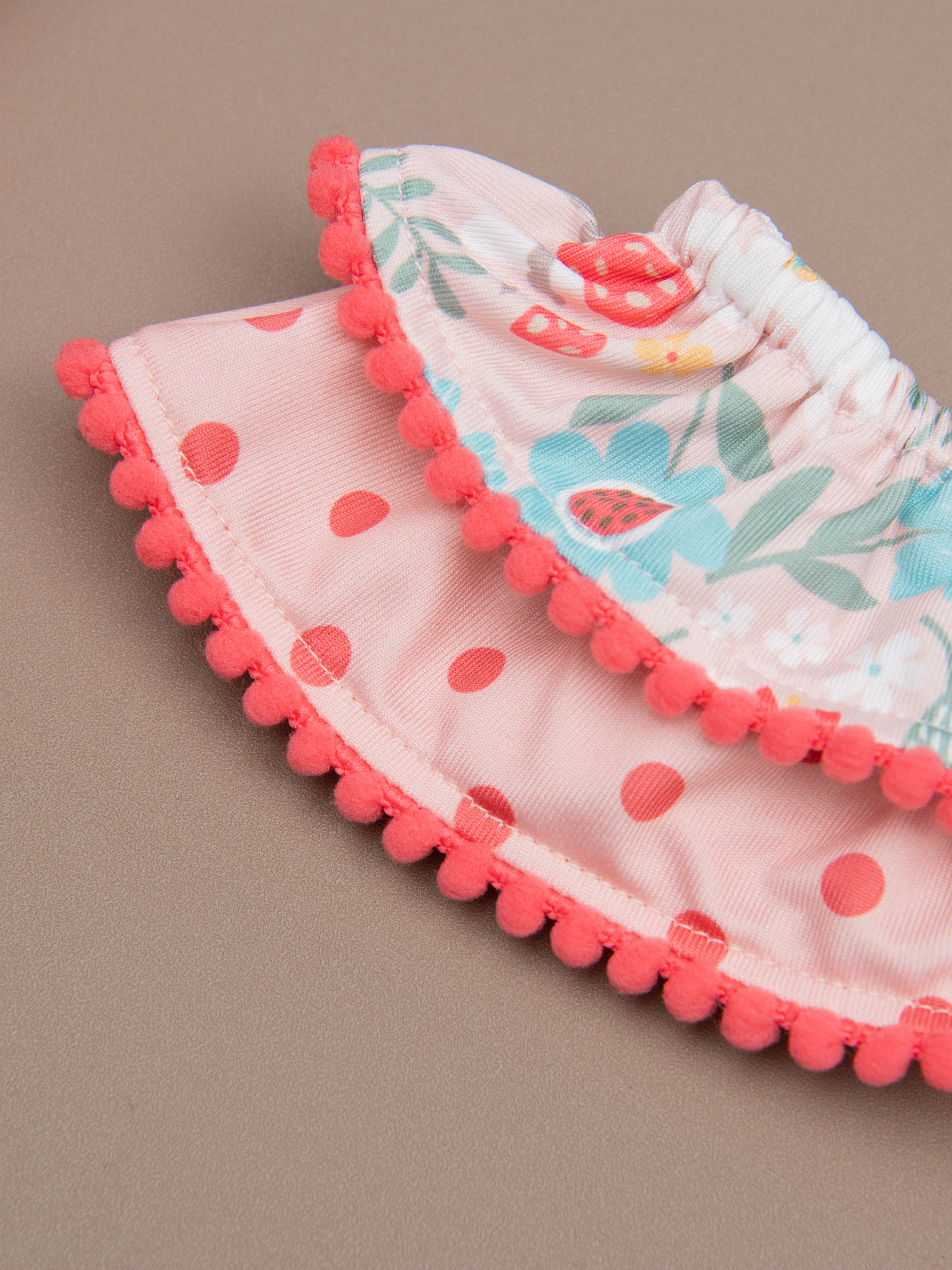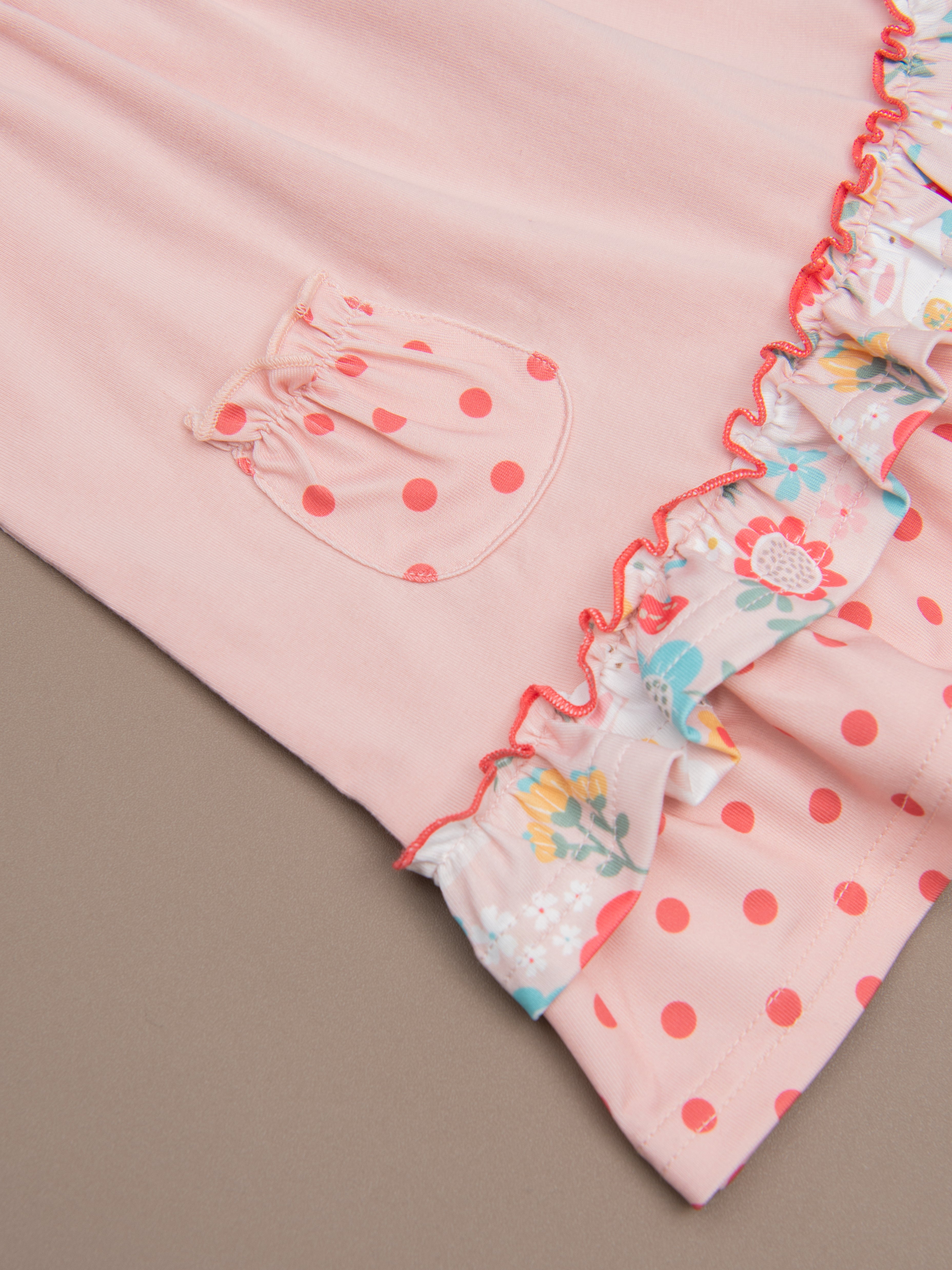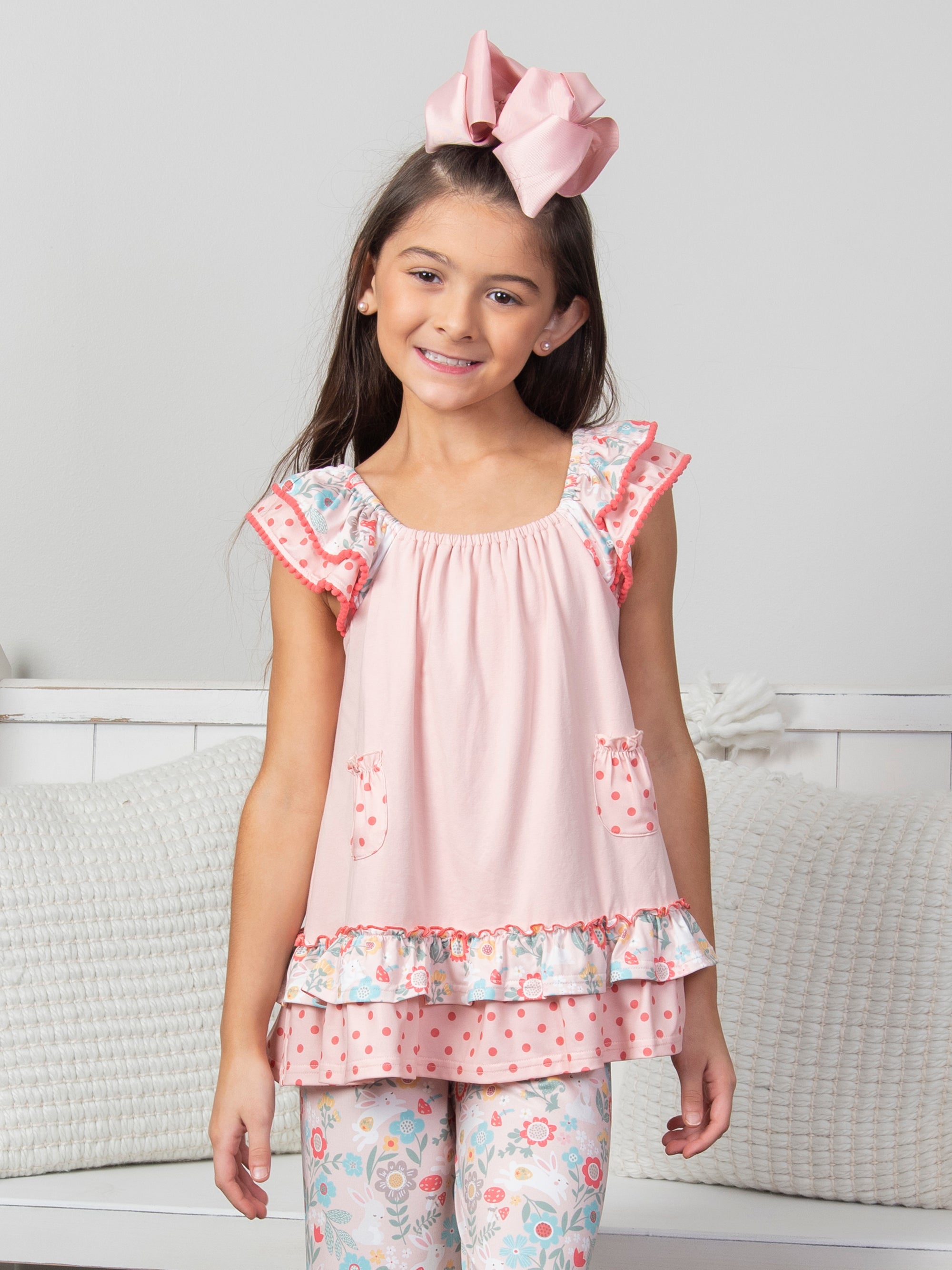 Watch all your little bunnies hop into spring with this elegant MNC exclusive collection! This high-quality collection has the softest material & is made to grow with your little one! This tunic features ruffle trim in our Lilly Belle Cottontail print, polka dot ruffle trim, pockets, pom pom trim, & can be worn on or off the shoulder.