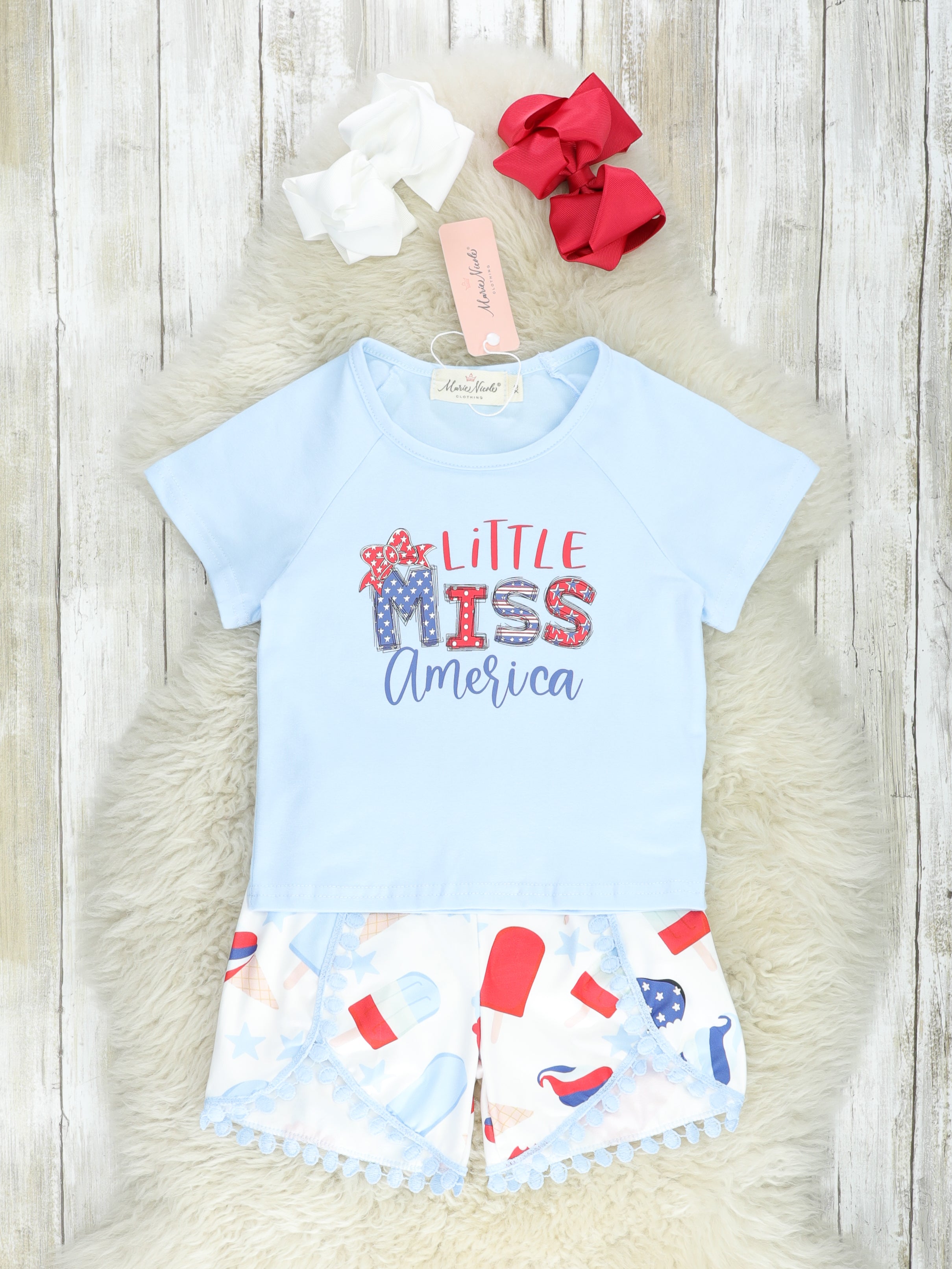 Introducing the cutest little outfits around-"Little Miss America" Sister Set! Featuring a blue shirt and popsicle-print shorts with an elastic waistband, your little one will look oh-so-sweet and ready for a hot summer day. Let your little one add a spark of patriotism to her wardrobe with this cutie-pie set!