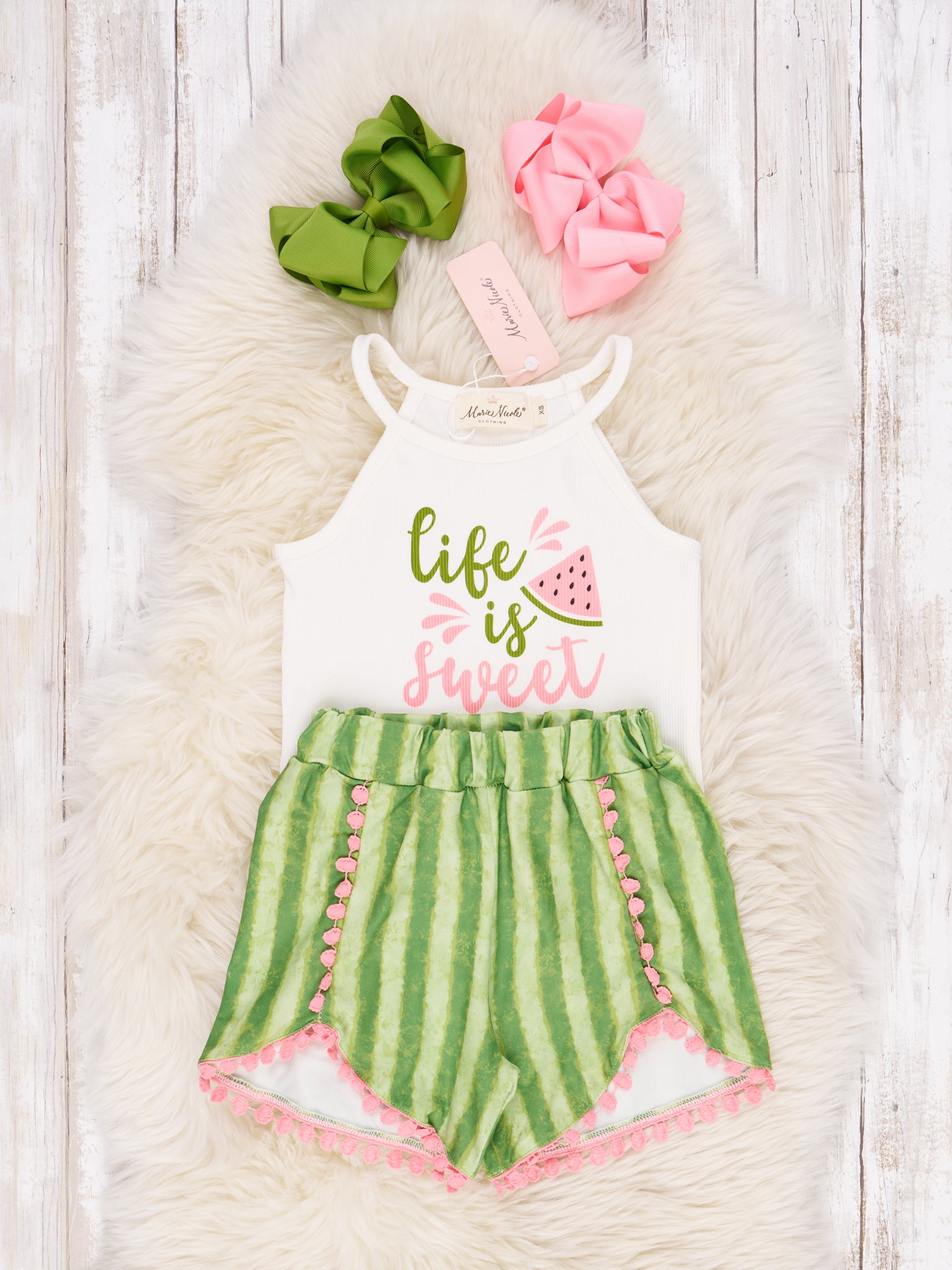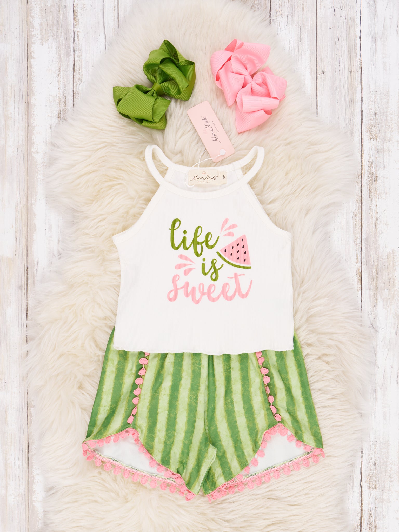 This cute "Life Is Sweet" Watermelon Outfit is the perfect addition to your child's wardrobe. Featuring a ribbed tank with a "Life Is Sweet" detail and shorts with an elastic waistband, your little one will look like a melon!