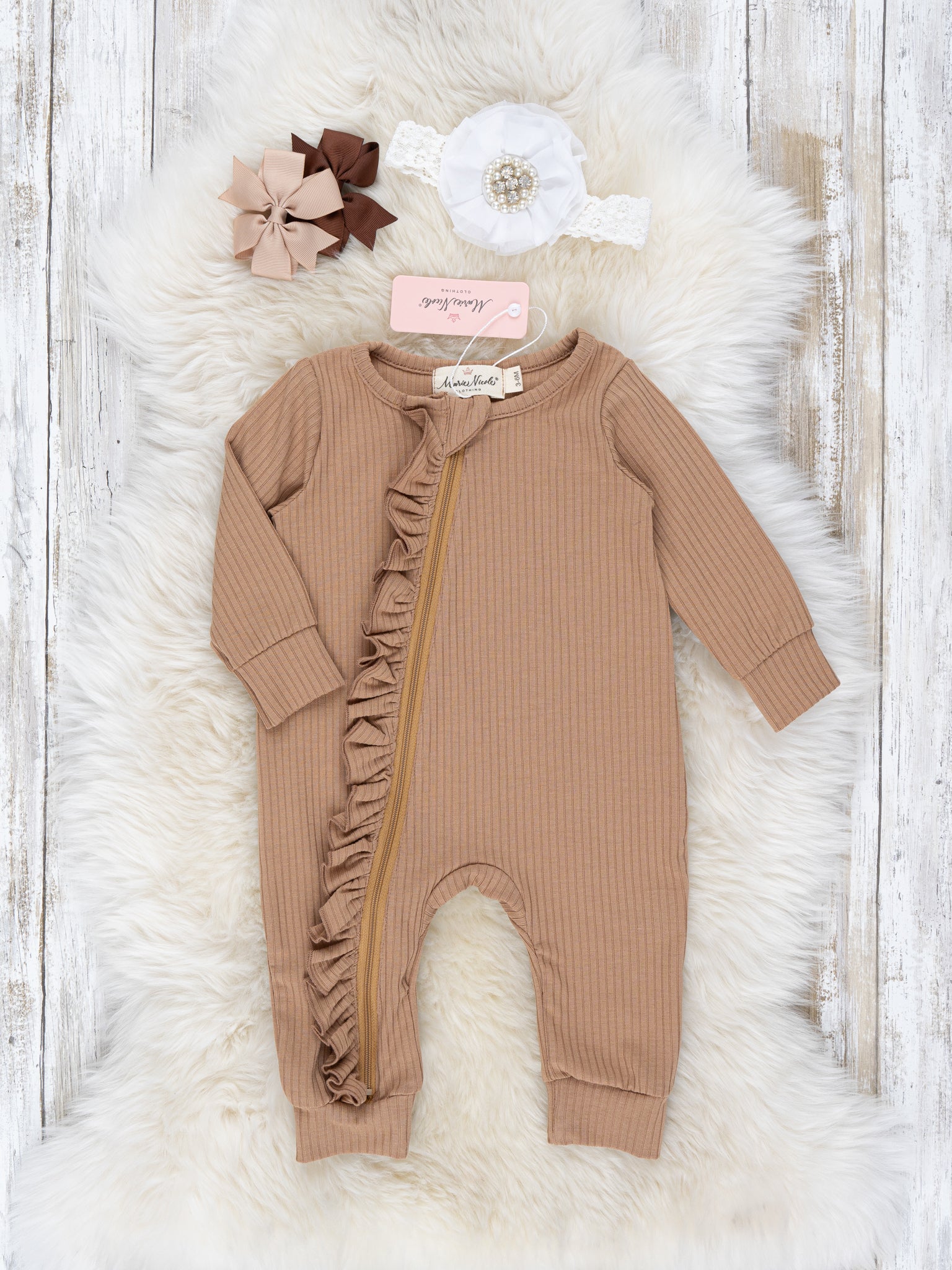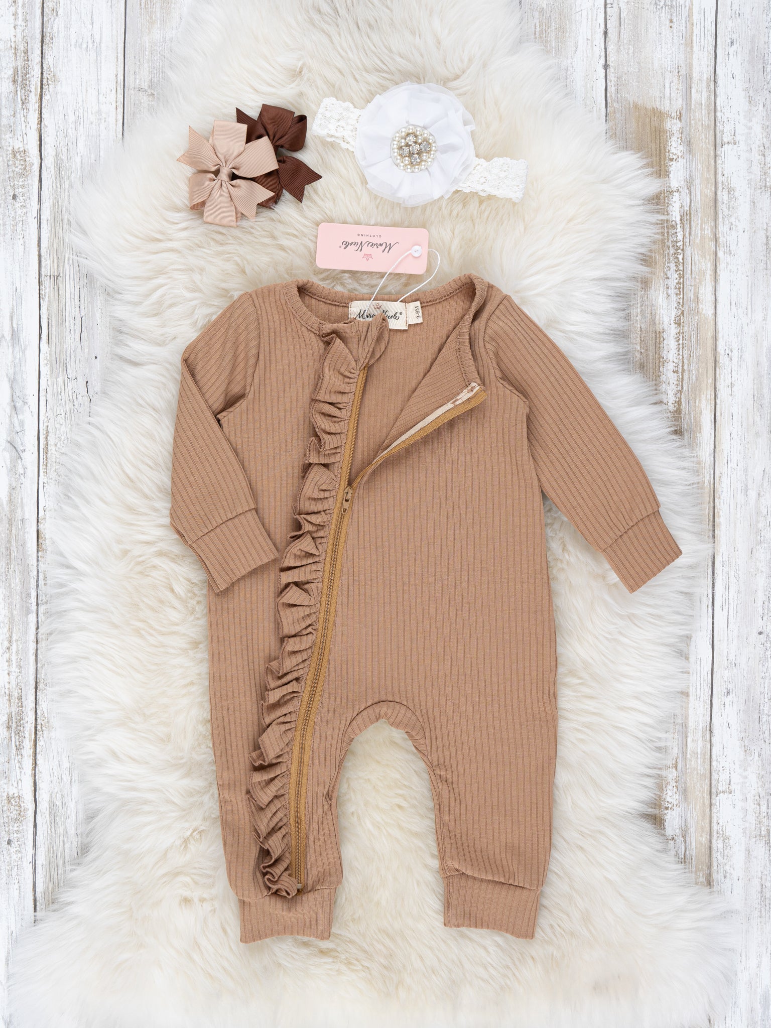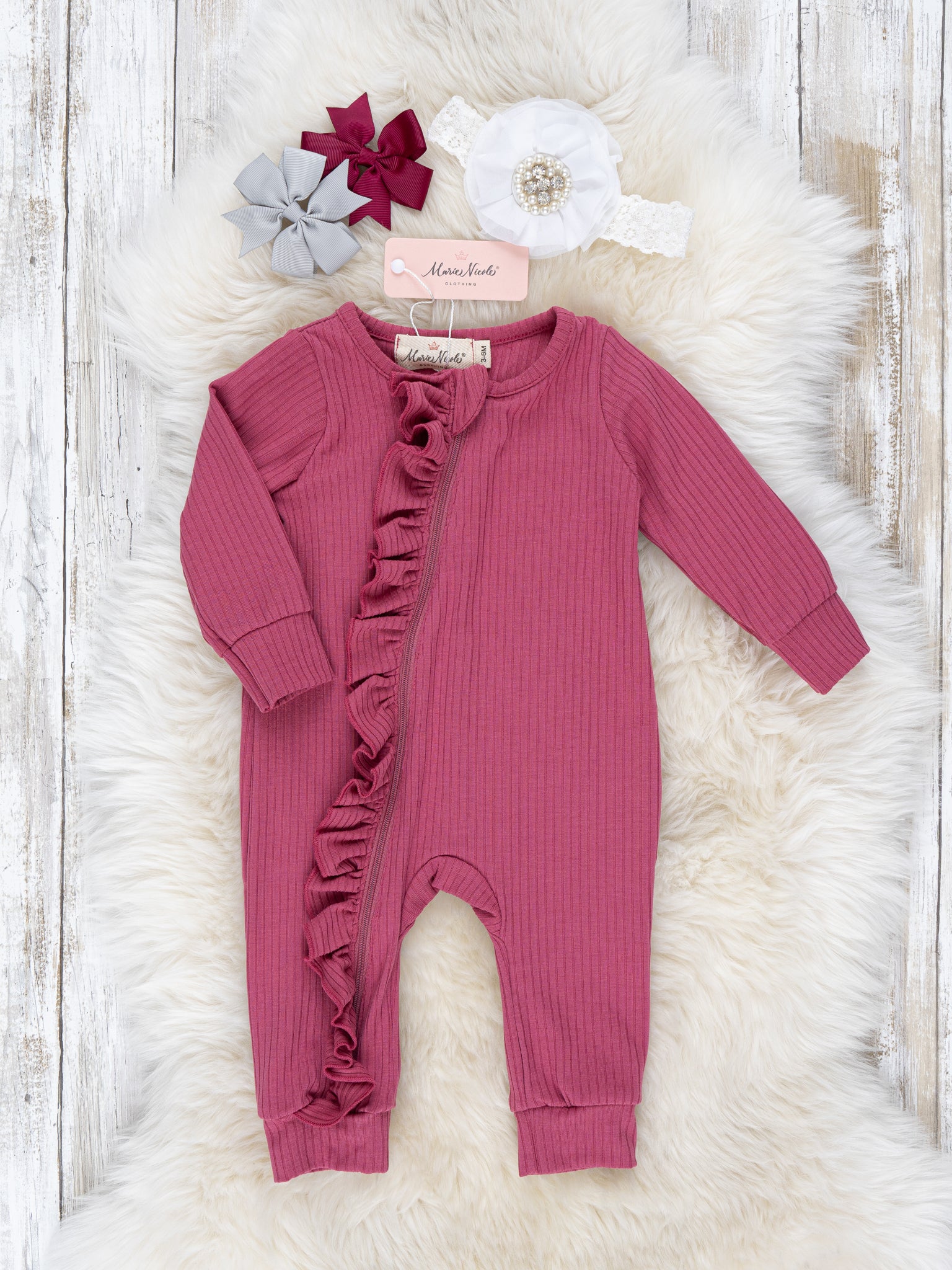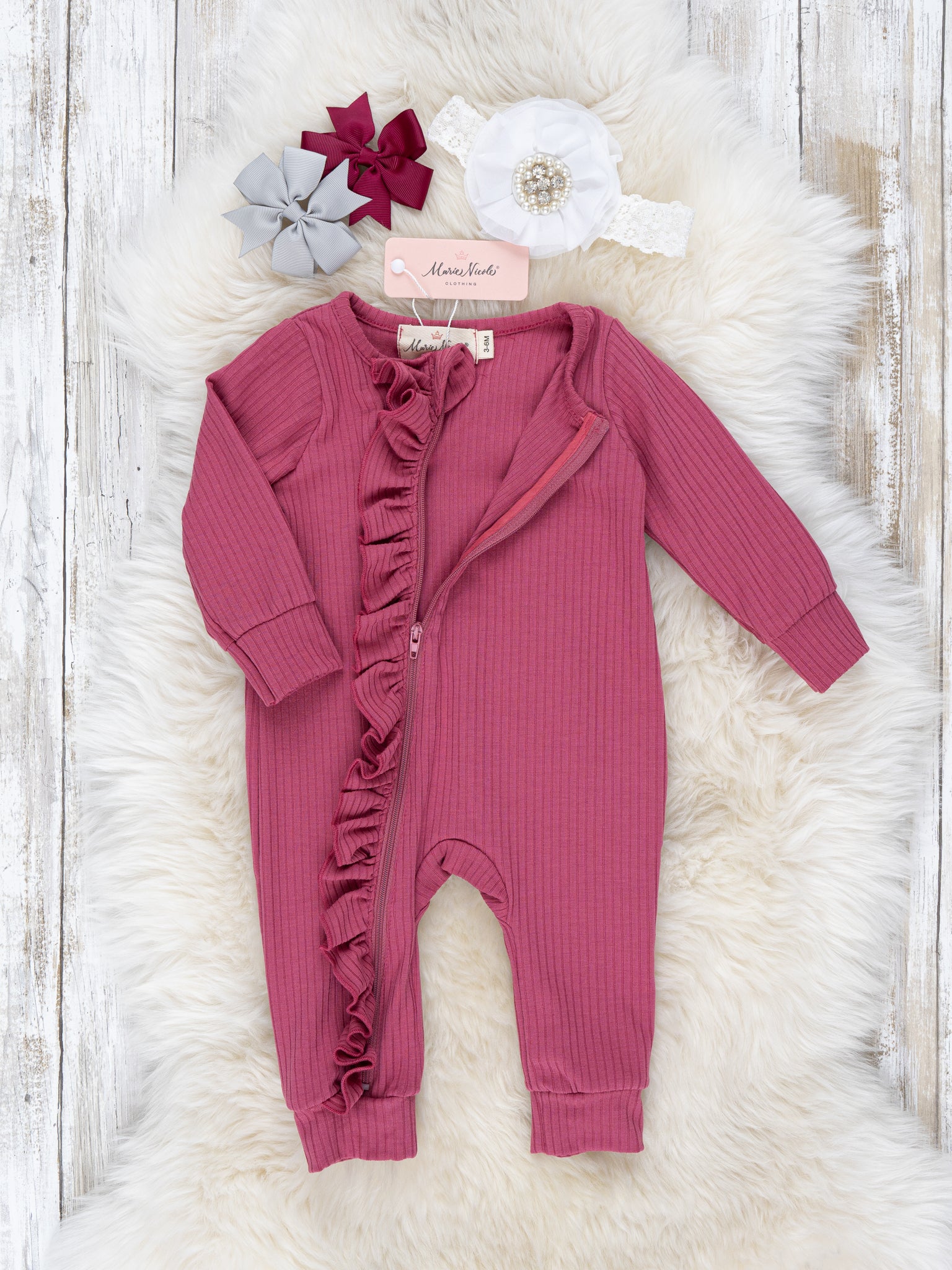 Bring on sweet dreams with this adorable sleep romper featuring an asymmetrical zipper closure, ruffle detail, and calming fall colors. Available in Sand and Magenta.