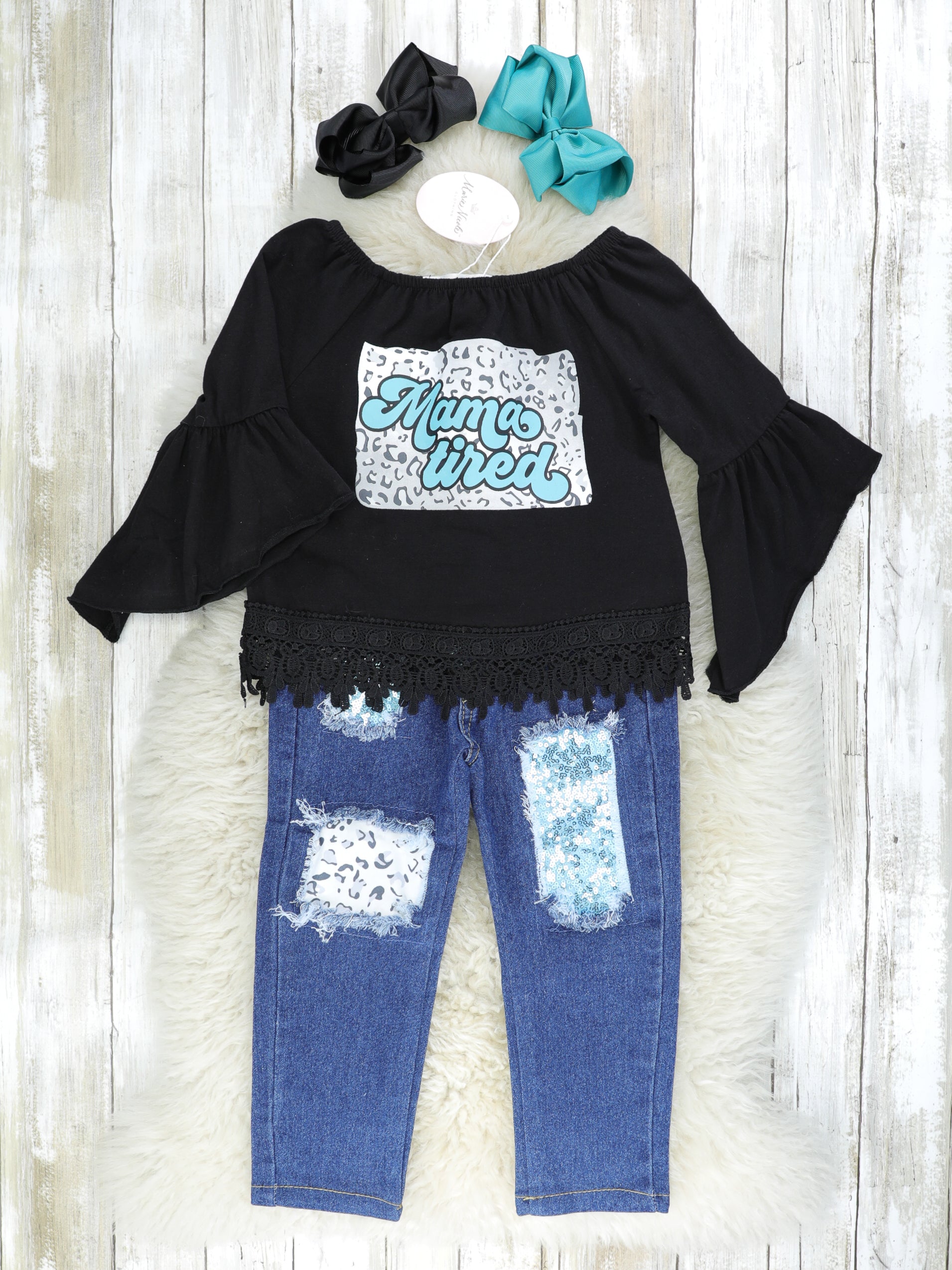 A darling outfit for your always on the go girls! This outfit features a black bell sleeve top with "Mama Tired" leopard print detail & lace trim. The distressed denim pants have a leopard print patch, blue sequin patch, & matching blue ribbon belt.