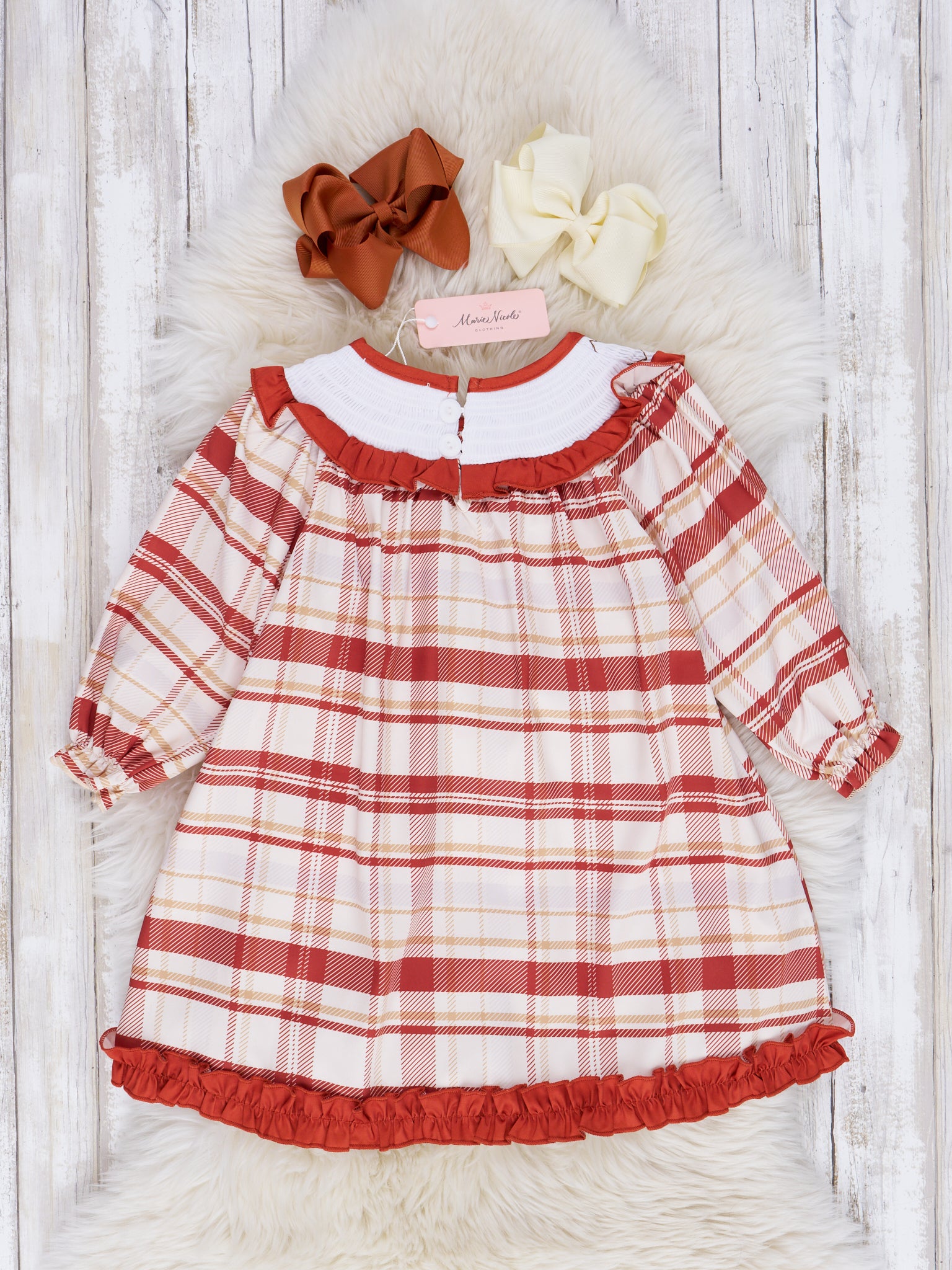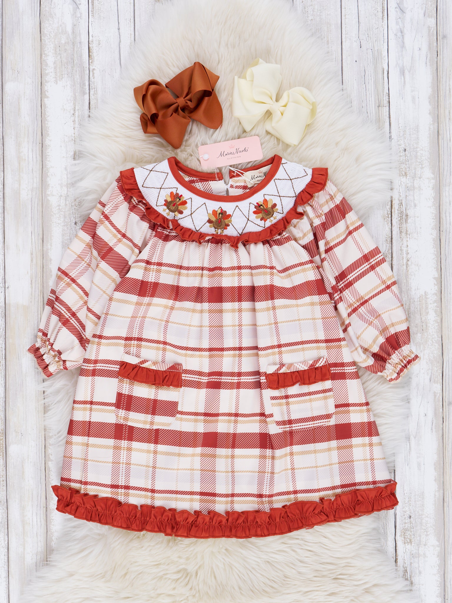 Maroon Plaid Smocked Turkey Ruffle Dress