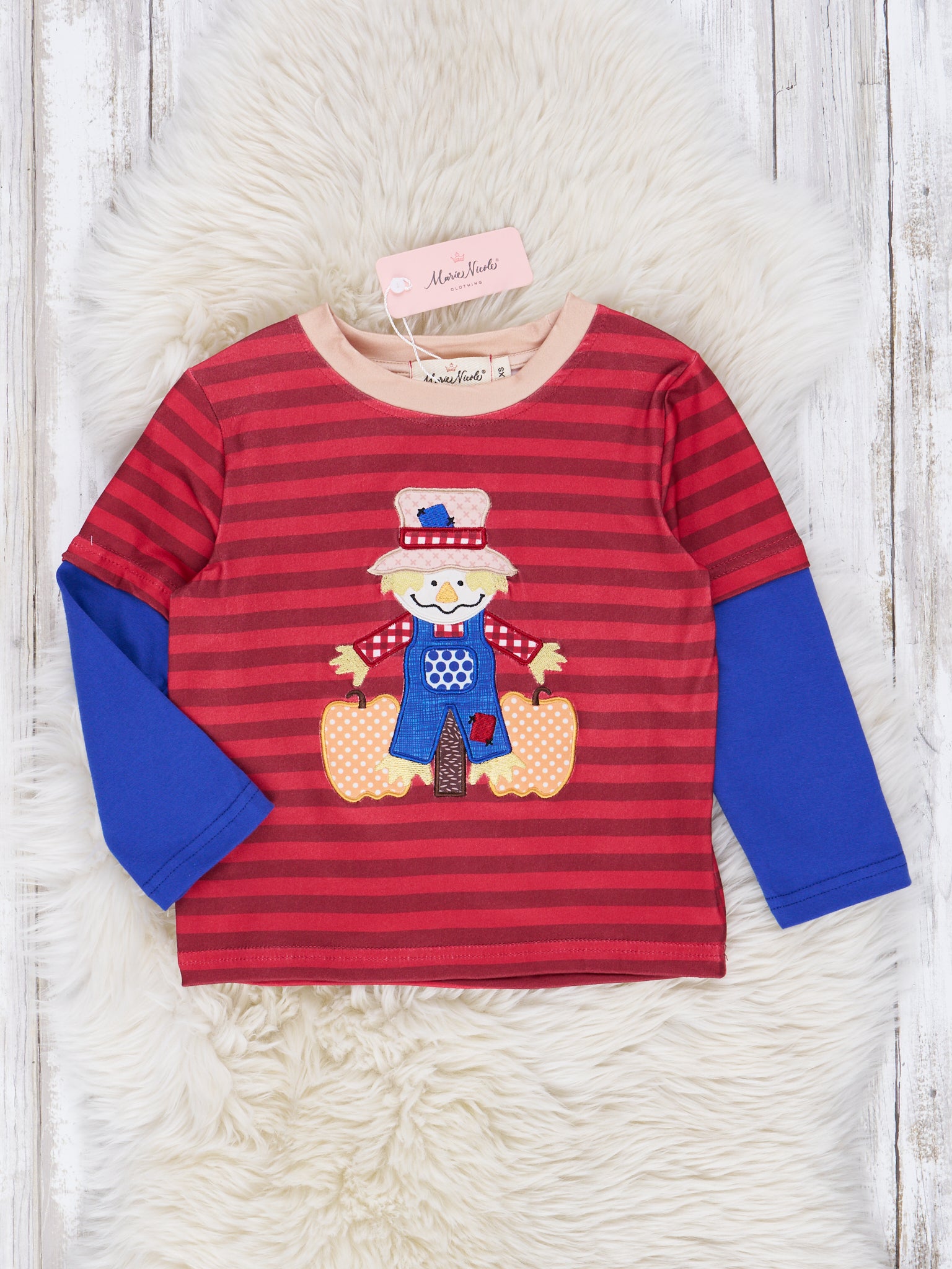 Gather 'round 'cause here's a brother set sure to be a hit this fall! Give your little ones an adorable autumn look with the Maroon Stripe Scarecrow Shirt. Featuring scarecrow and pumpkin details, it'll keep your kids cozy and cute!