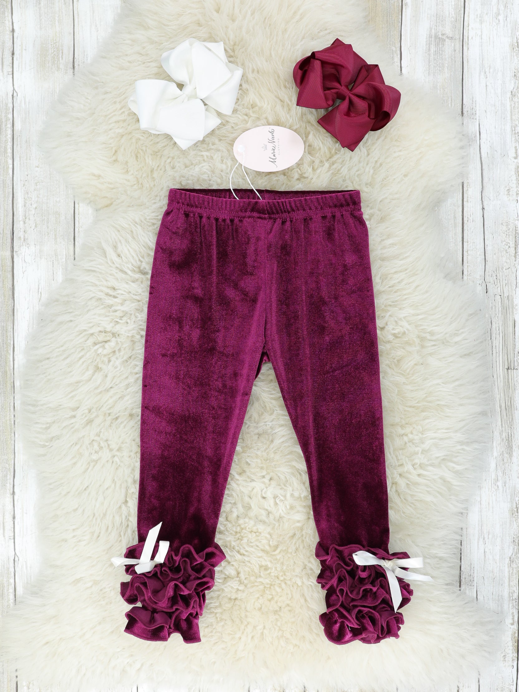 Keep your girls warm & cozy with the loveliest velvet icing leggings. These maroon leggings feature an elastic waistband, icing ruffles, & white bow details at the ankles.