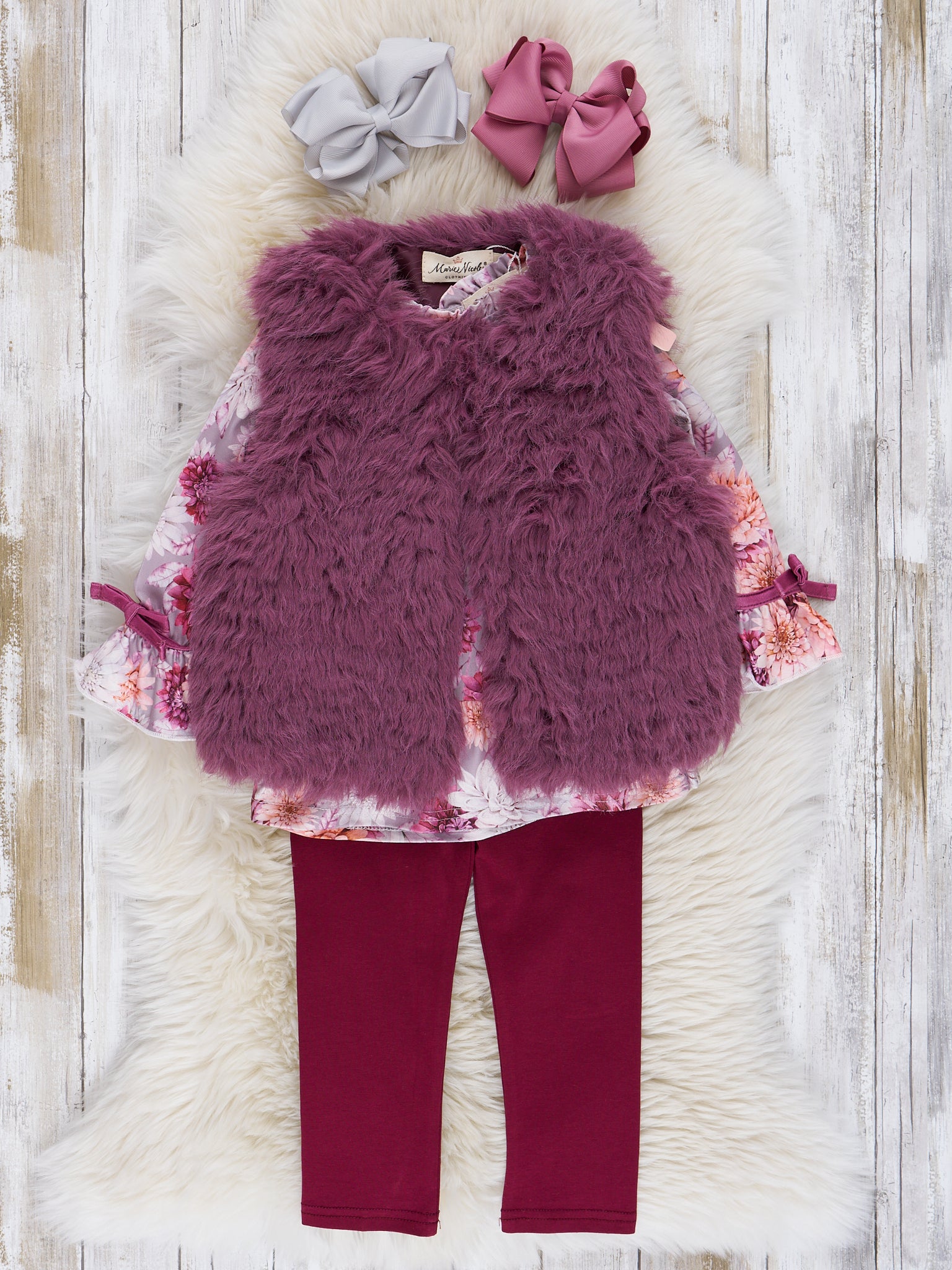 Mauve Dots & Wildflowers Outfit w/ Faux Fur Vest
