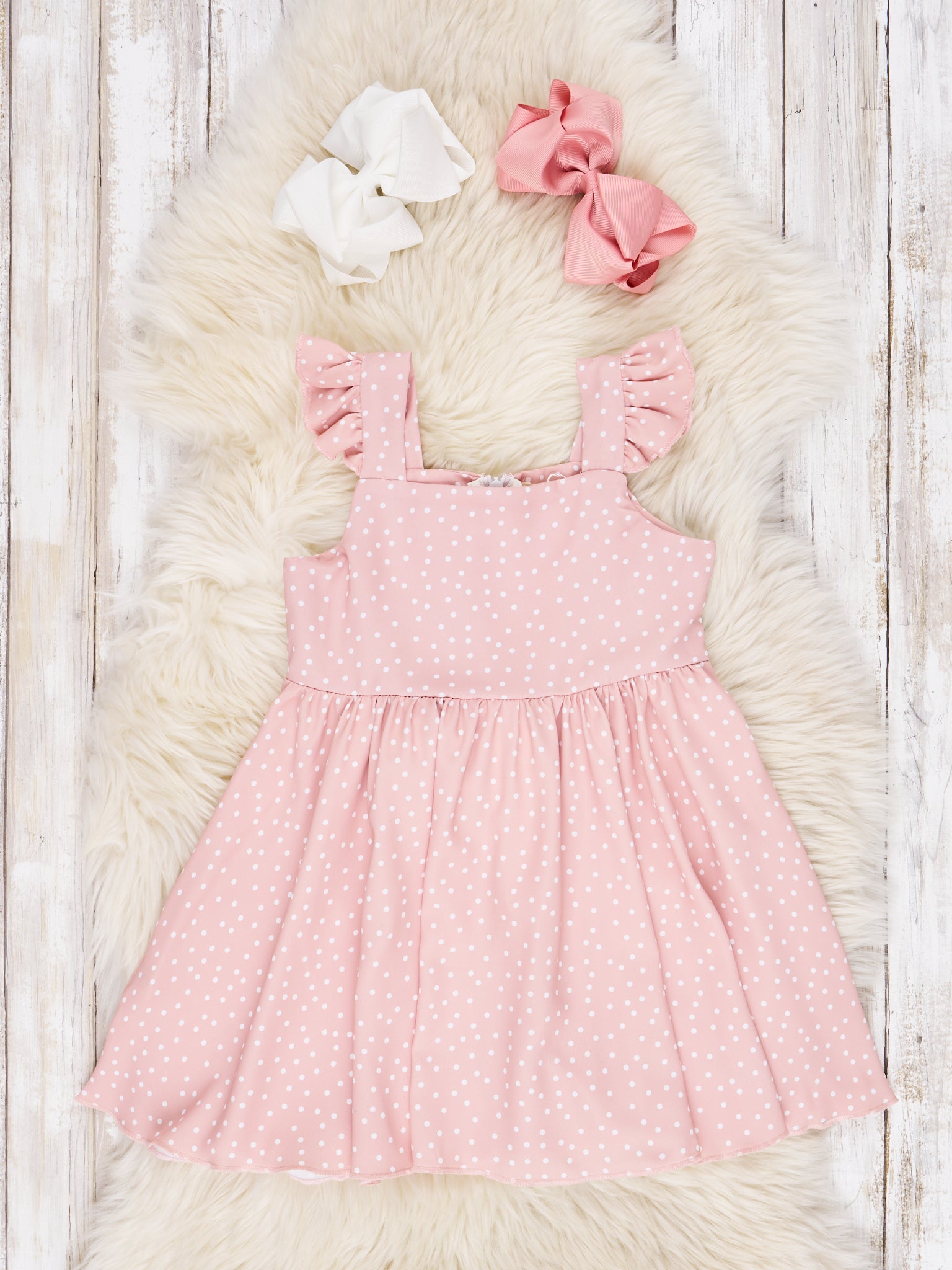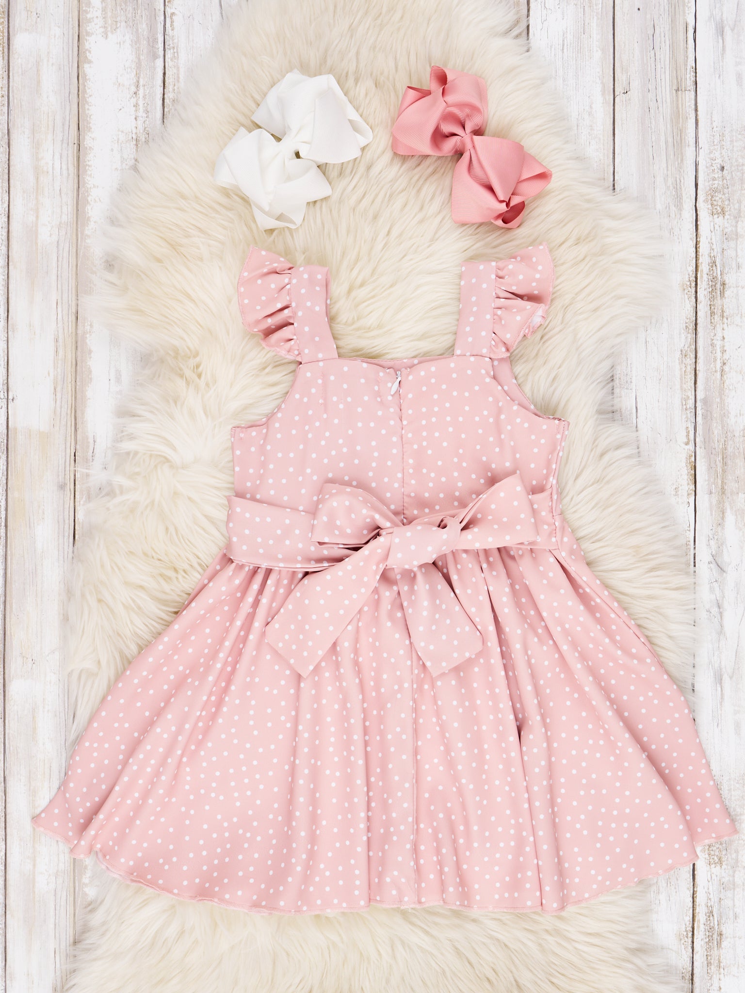 Dazzle them in this oh-so-adorable mauve dress with playful polka dots and ruffles! Perfect for any special occasion, it's sure to make your little darling the life of the party!