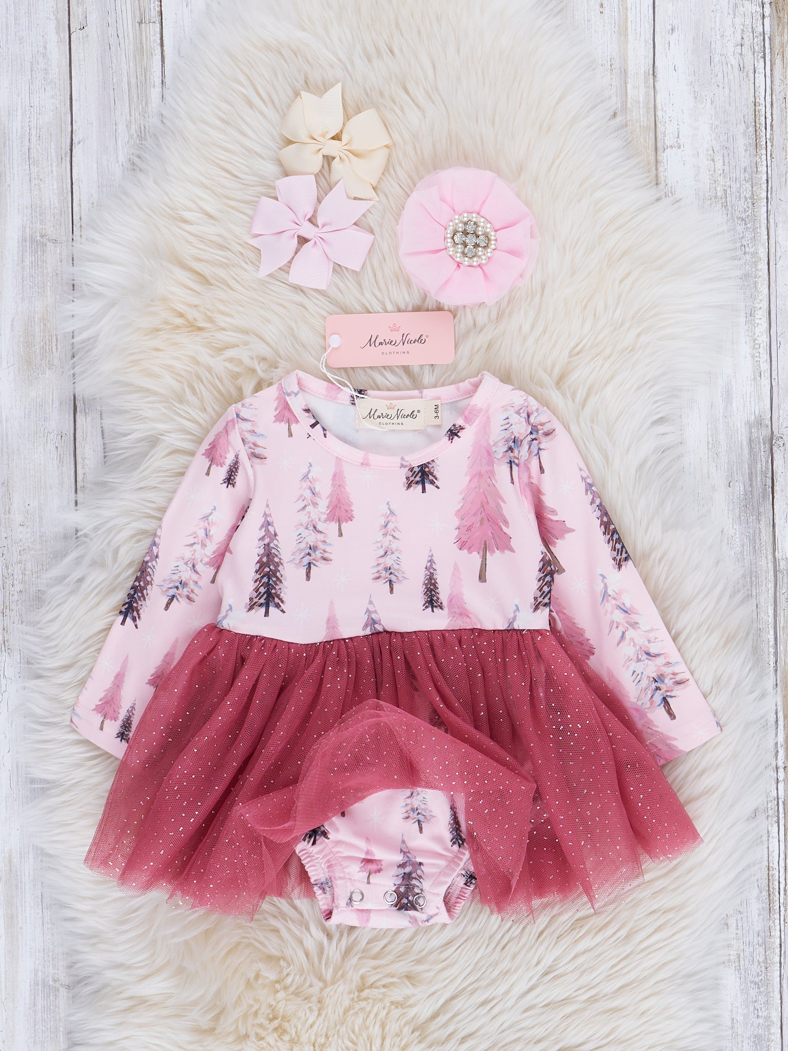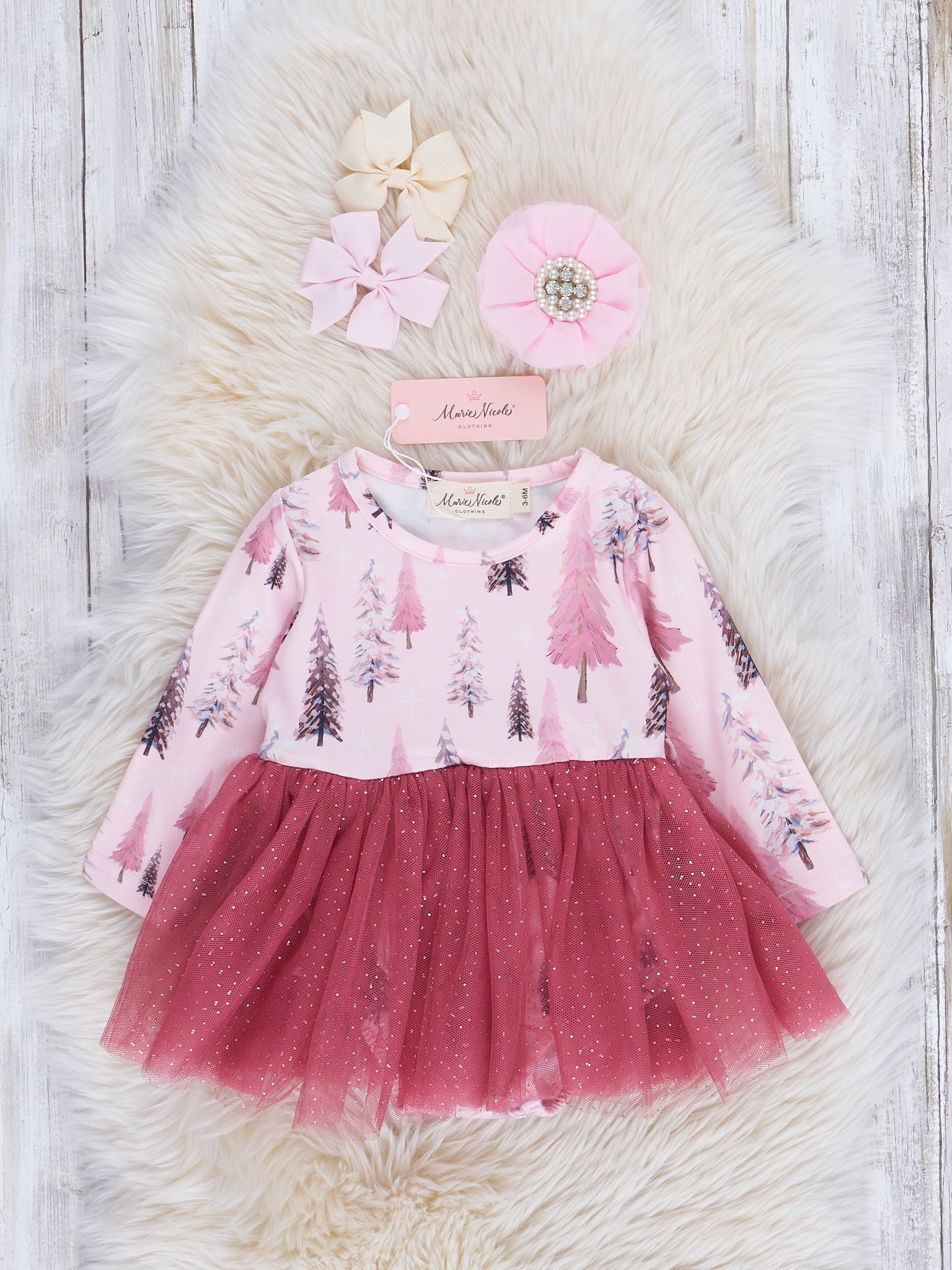 Twirl into winter with this sister set. With its MNC mauve color, this roper features a winter tree print and a full sequin sparkle tulle peplum skirt. She'll be the belle of the holiday ball!