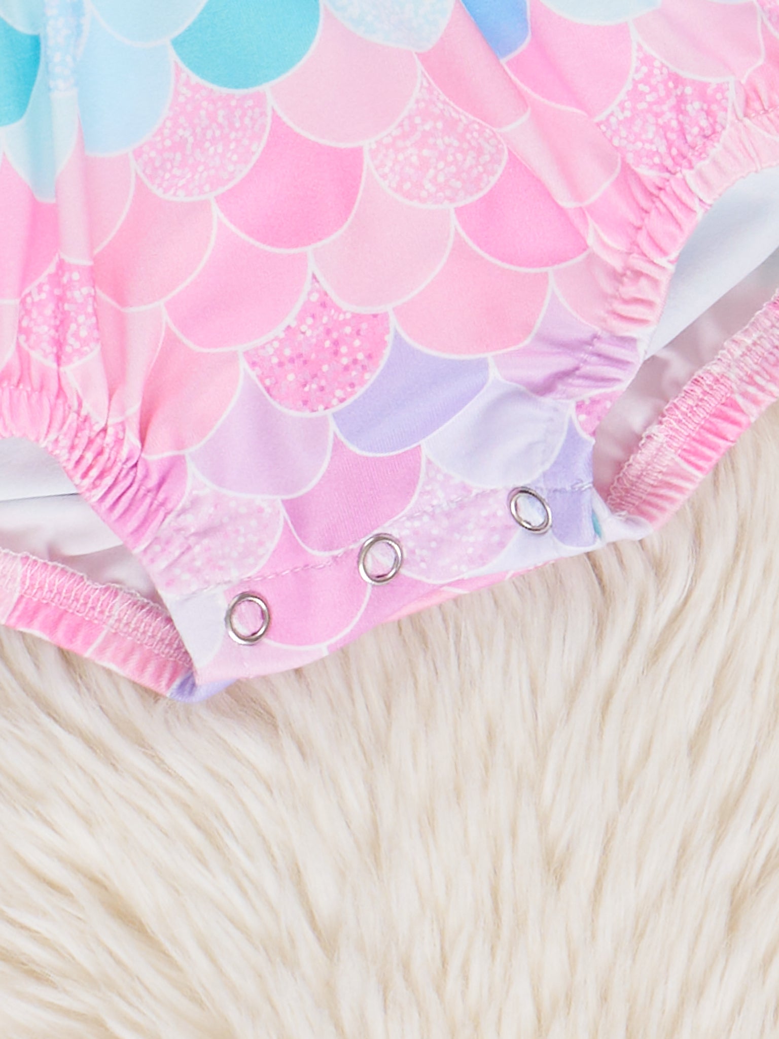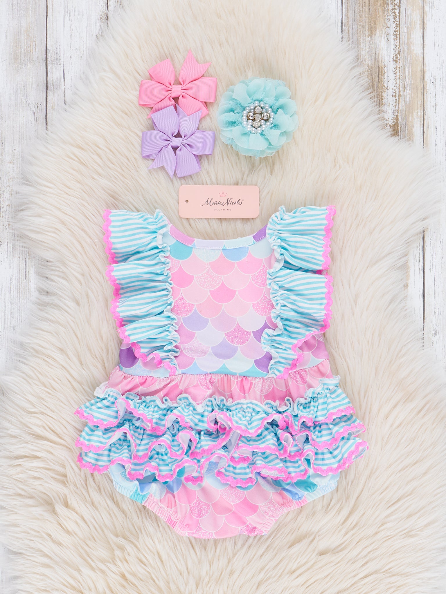 Make a splash this summer with our Mermaid Splash Ruffle Bubble! With a playful mermaid tail design and pink, purple, and blue scales printed bodice, your little girl will be the star of the beach. Plus, the ruffle shoulder detail and sister set option from Marie Nicole Clothing adds an extra touch of fun! !