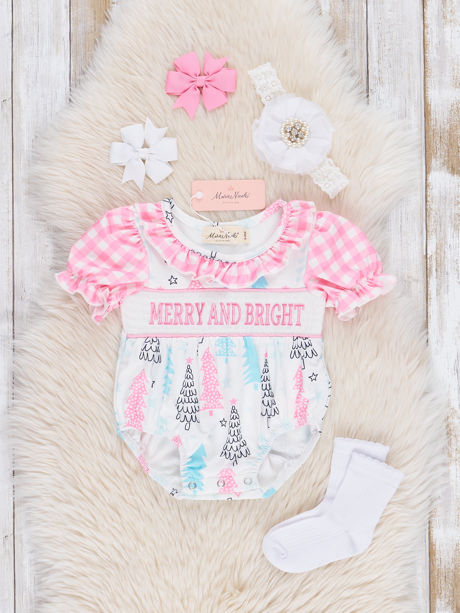 Get your little ones ready for the holiday season with our Merry & Bright Smocked Ruffle Bubble! This girls bubble features adorable pink gingham sleeves and a delicate embroidered "Merry & Bright" design over smocking. Perfect for a festive sister set, this bubbly outfit is sure to make your little ones look merry and bright!
