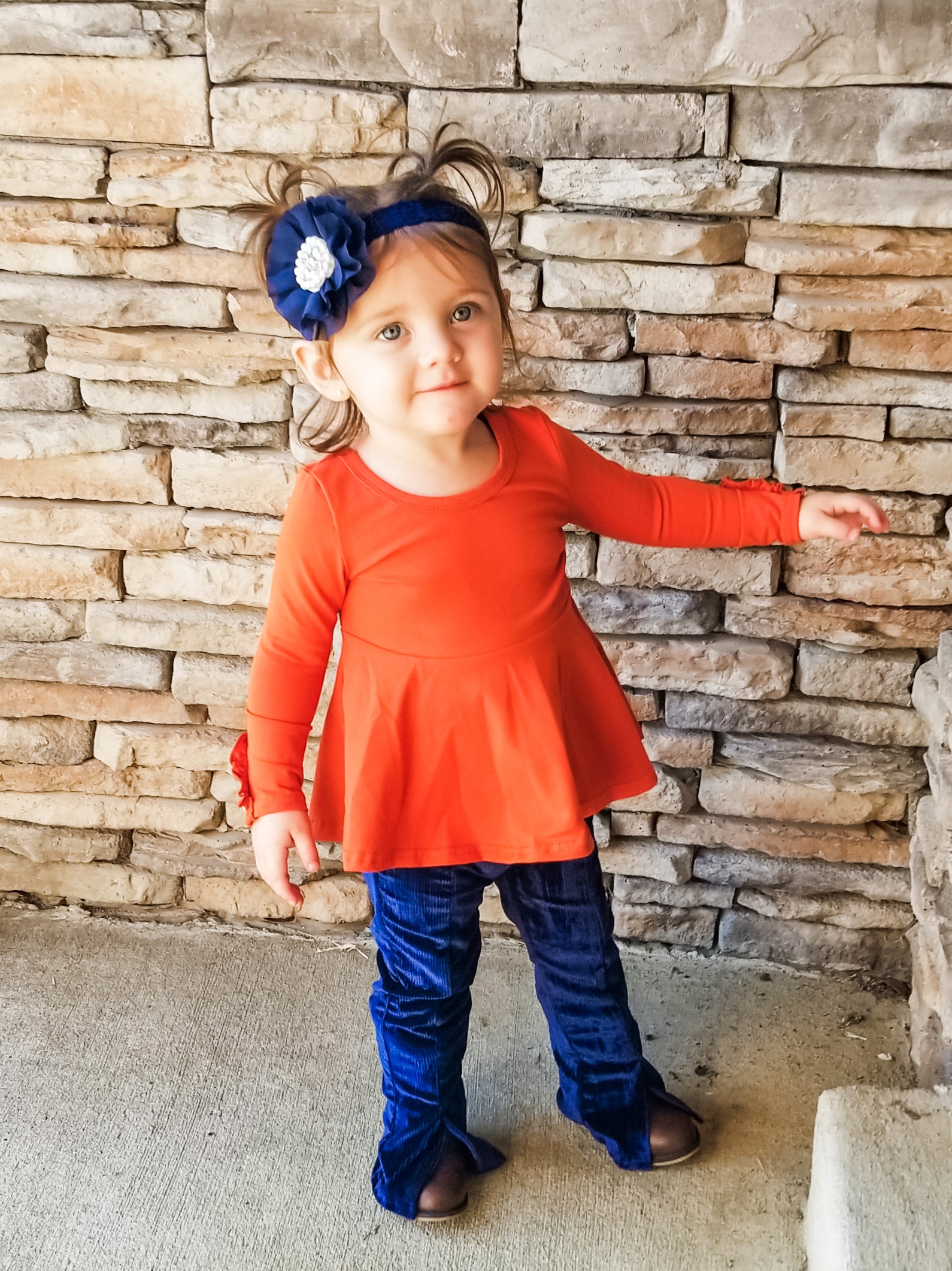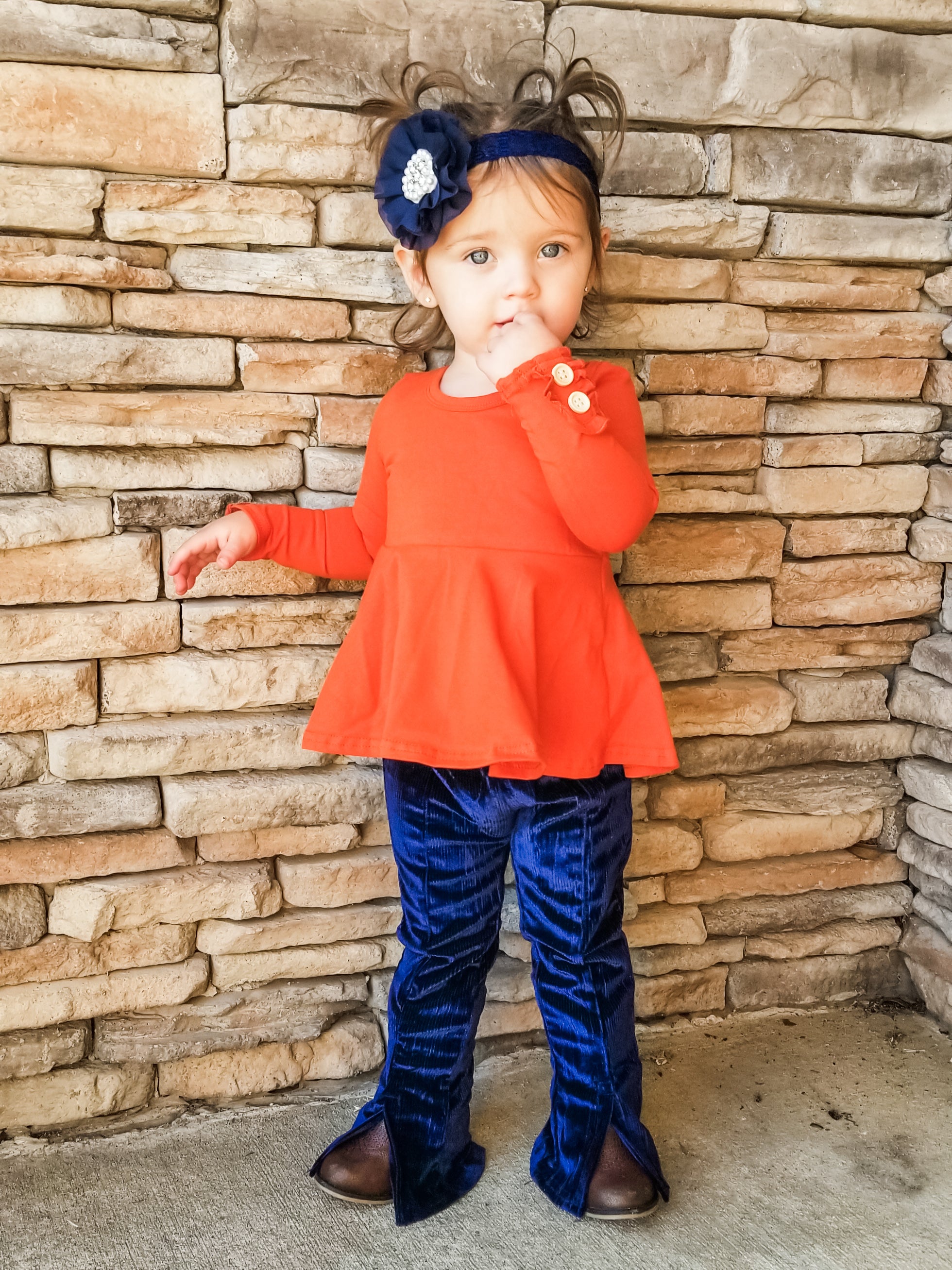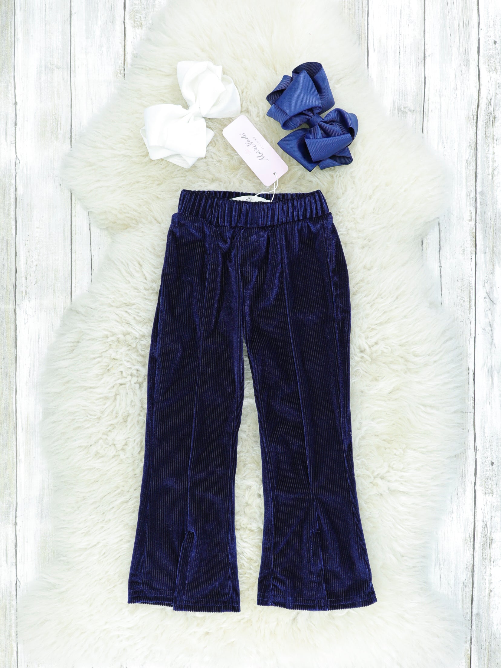A gorgeous sister set perfect for Christmas dinner or even New Year's Eve! These midnight blue velvet bell bottoms feature a split hem & elastic waistband so there's plenty of room for your little to grow!