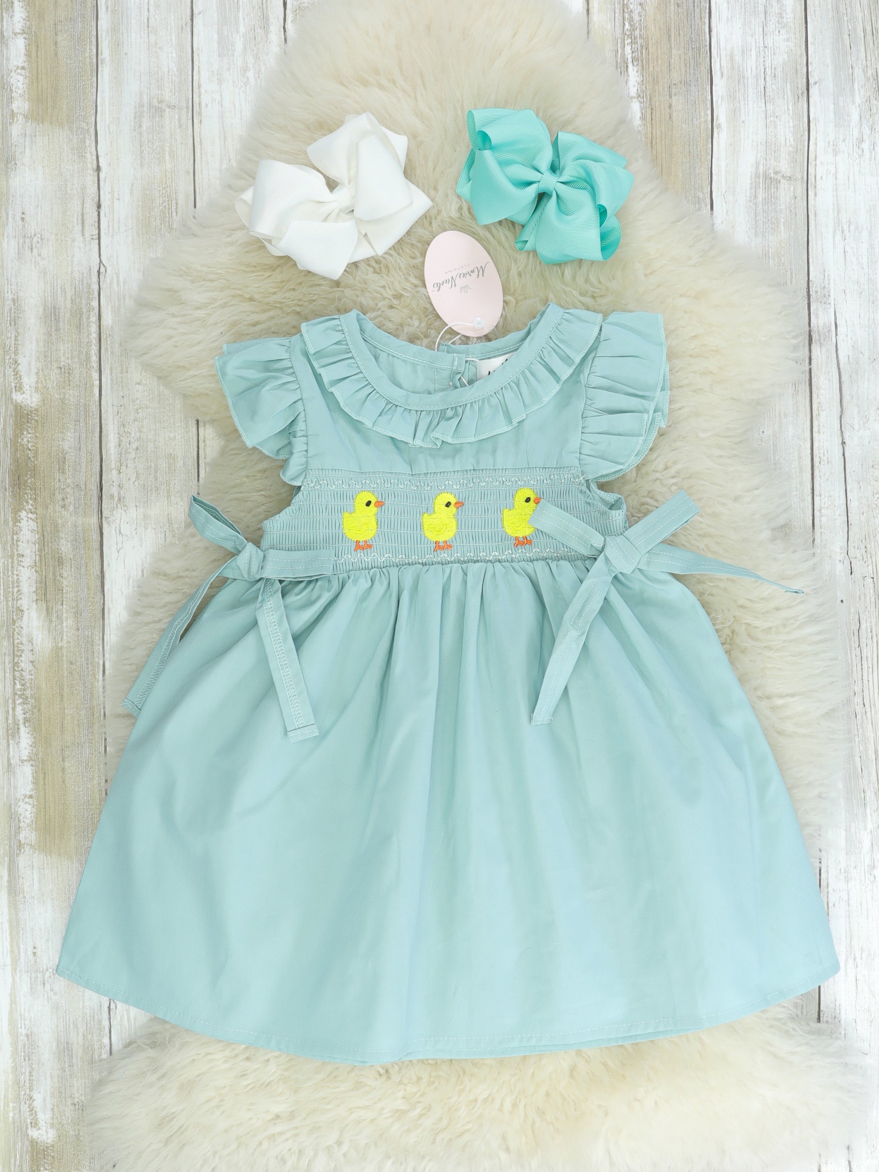 Quack Quack! This duckling sister set is too cute! This mint dress features ruffles, bows on both sides hitting right below the chest, & a smocked duck detail.