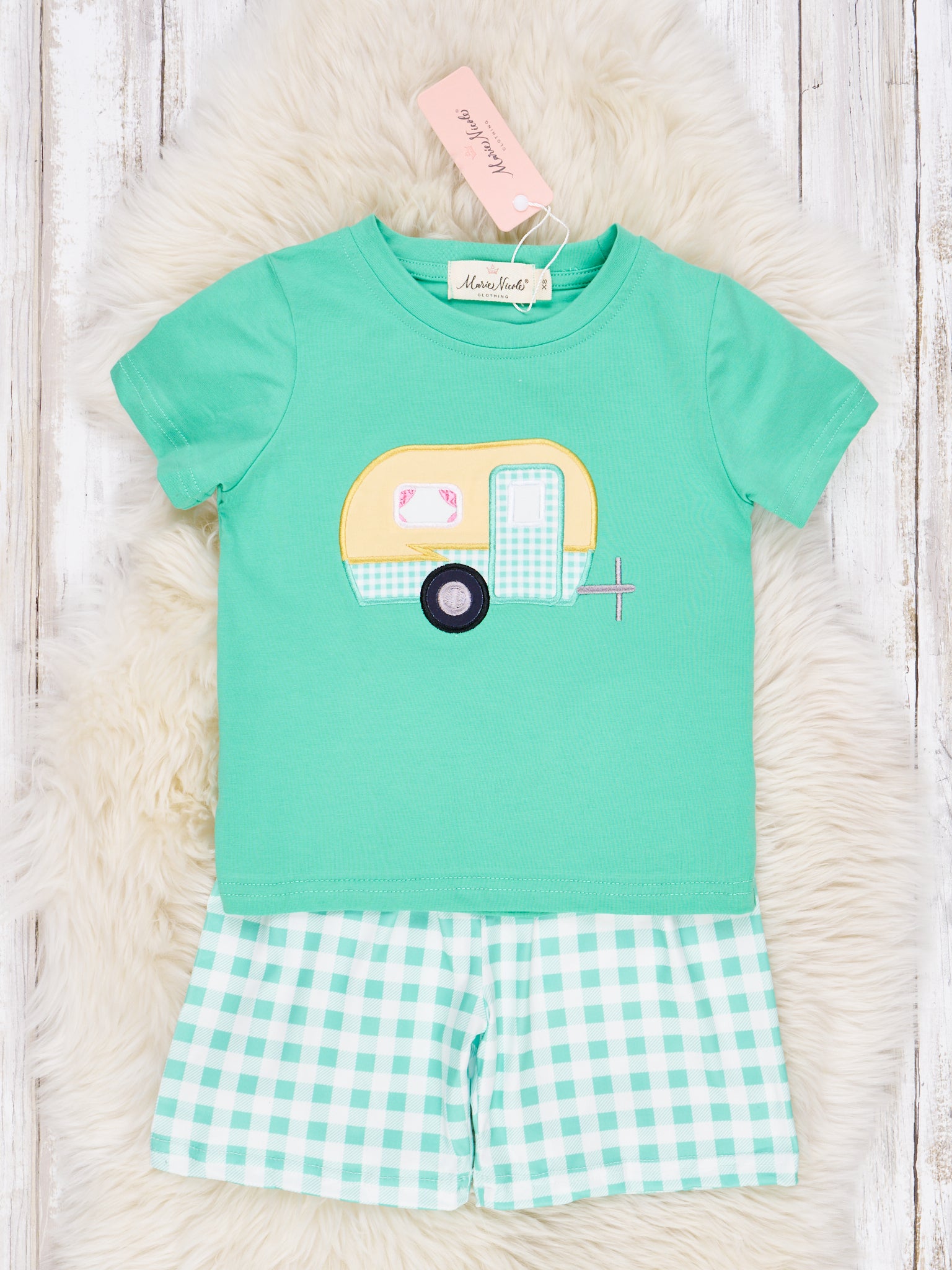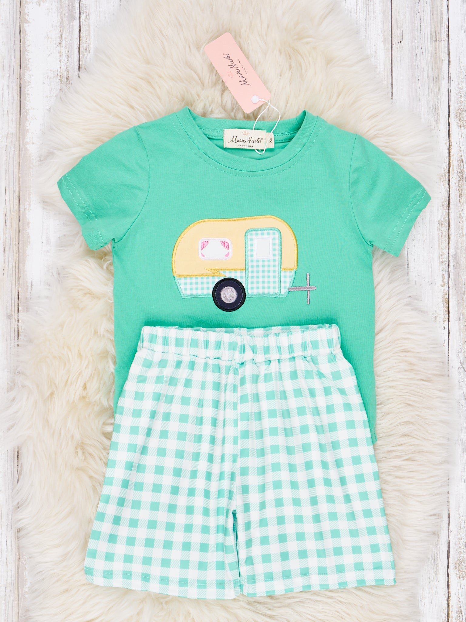 This adorable brother set lets your little ones explore the great outdoors in style! The mint outfit features a gingham pattern and an adorably detailed camper appliqué, making sure they don't miss a single adventure! Perfect for any summer outing!