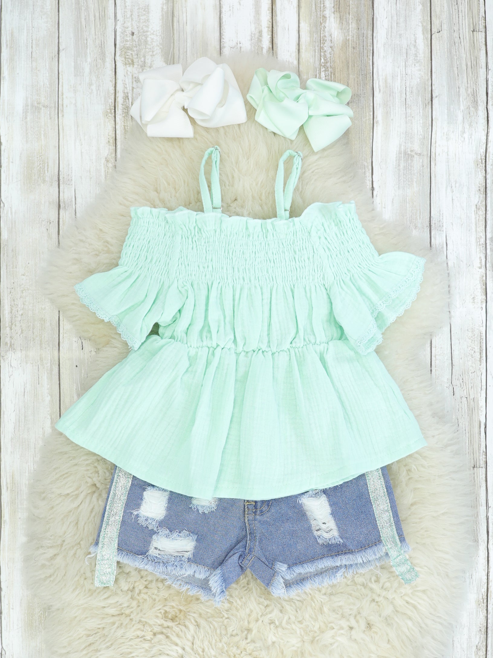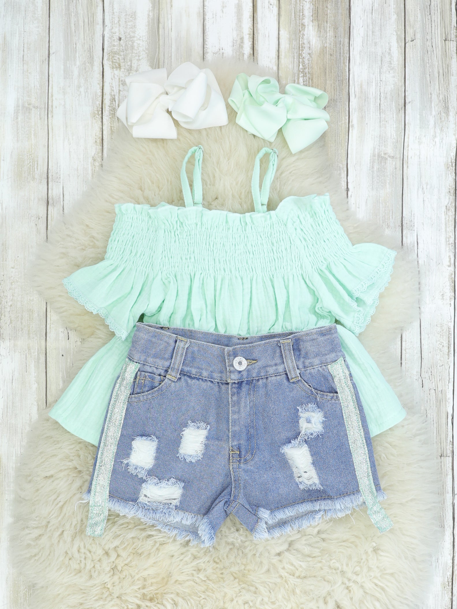 Be a trendsetter this summer! This adorable outfit features an off-the shoulder top with smocking and peplum fit and how cute are these sequin distressed shorts!