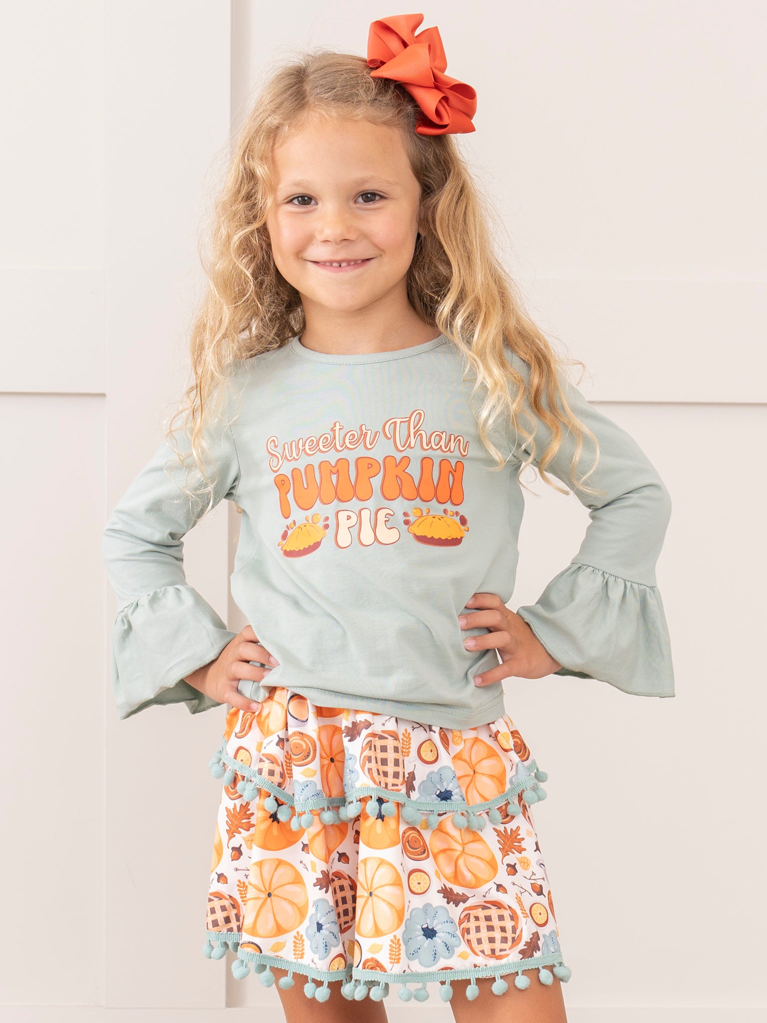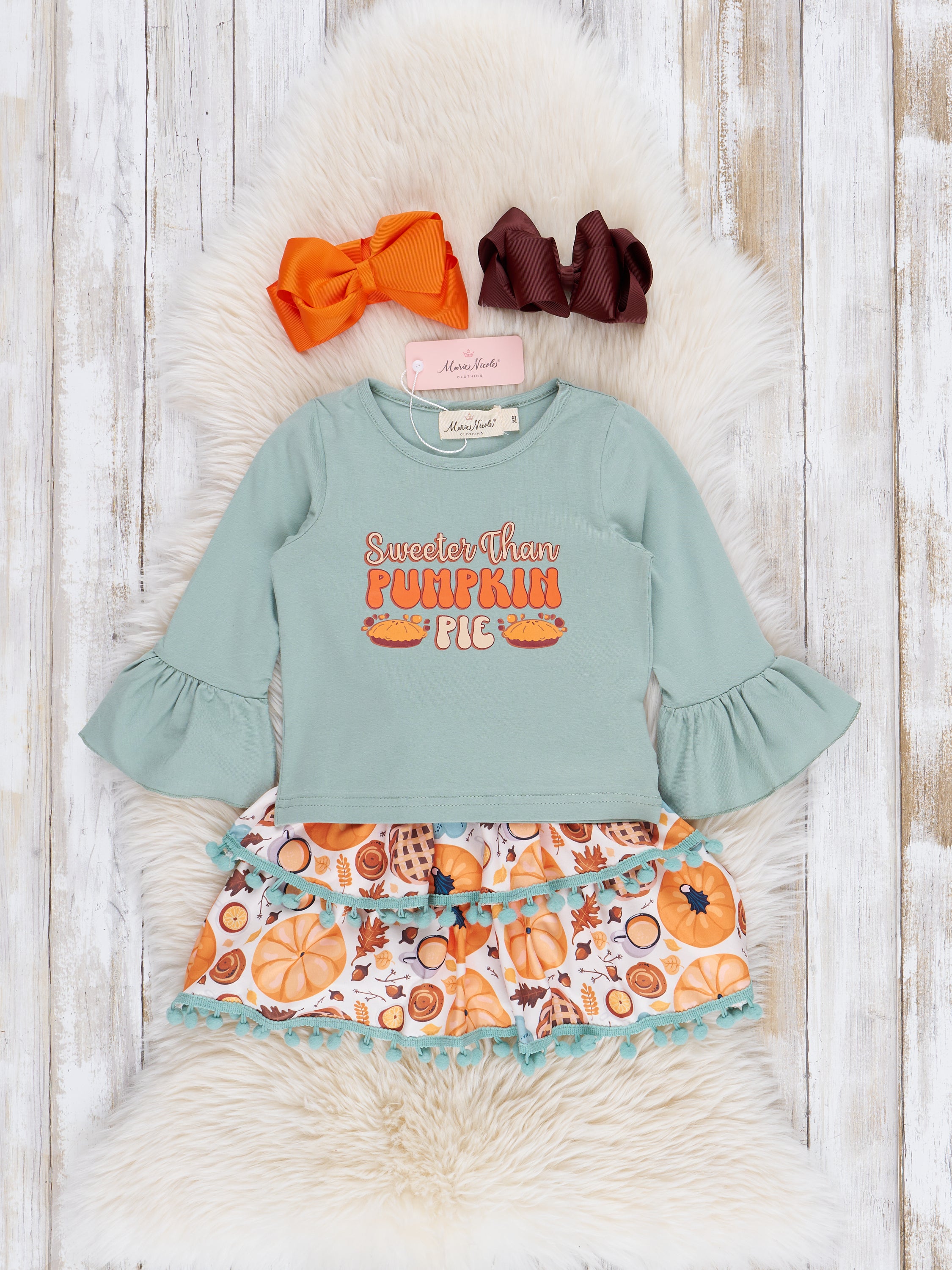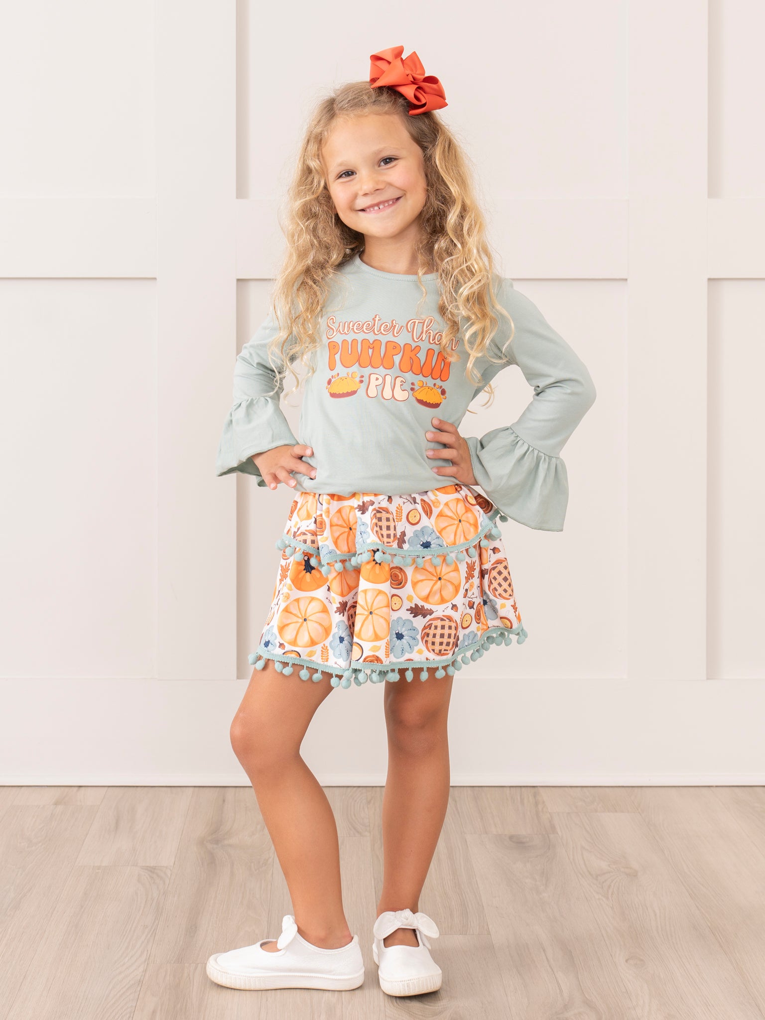 This adorable girls outfit features a mint green bell sleeve top and a playful pumpkin pie printed skirt with pom pom trim. Perfect for any sweet little one, this outfit is as cute as it is unique. Pumpkin spice and everything nice sold separately!