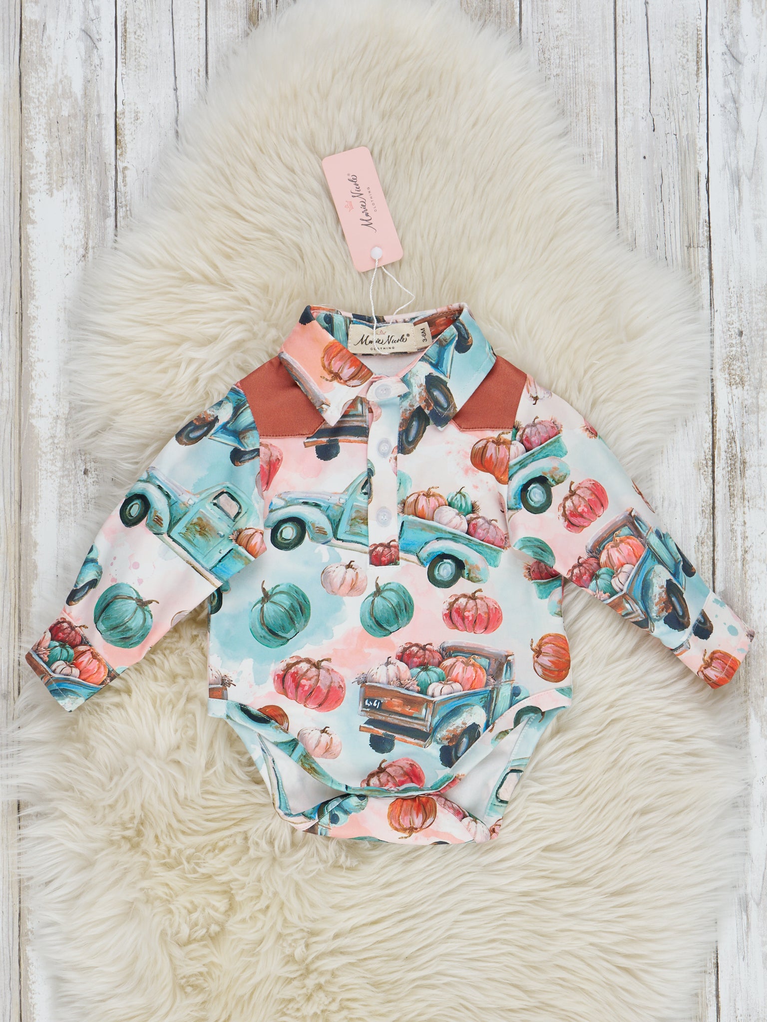 We can't get enough of this picture-perfect brother set! This collared romper features long sleeves, suede patches at the shoulders, and functioning buttons the full length.