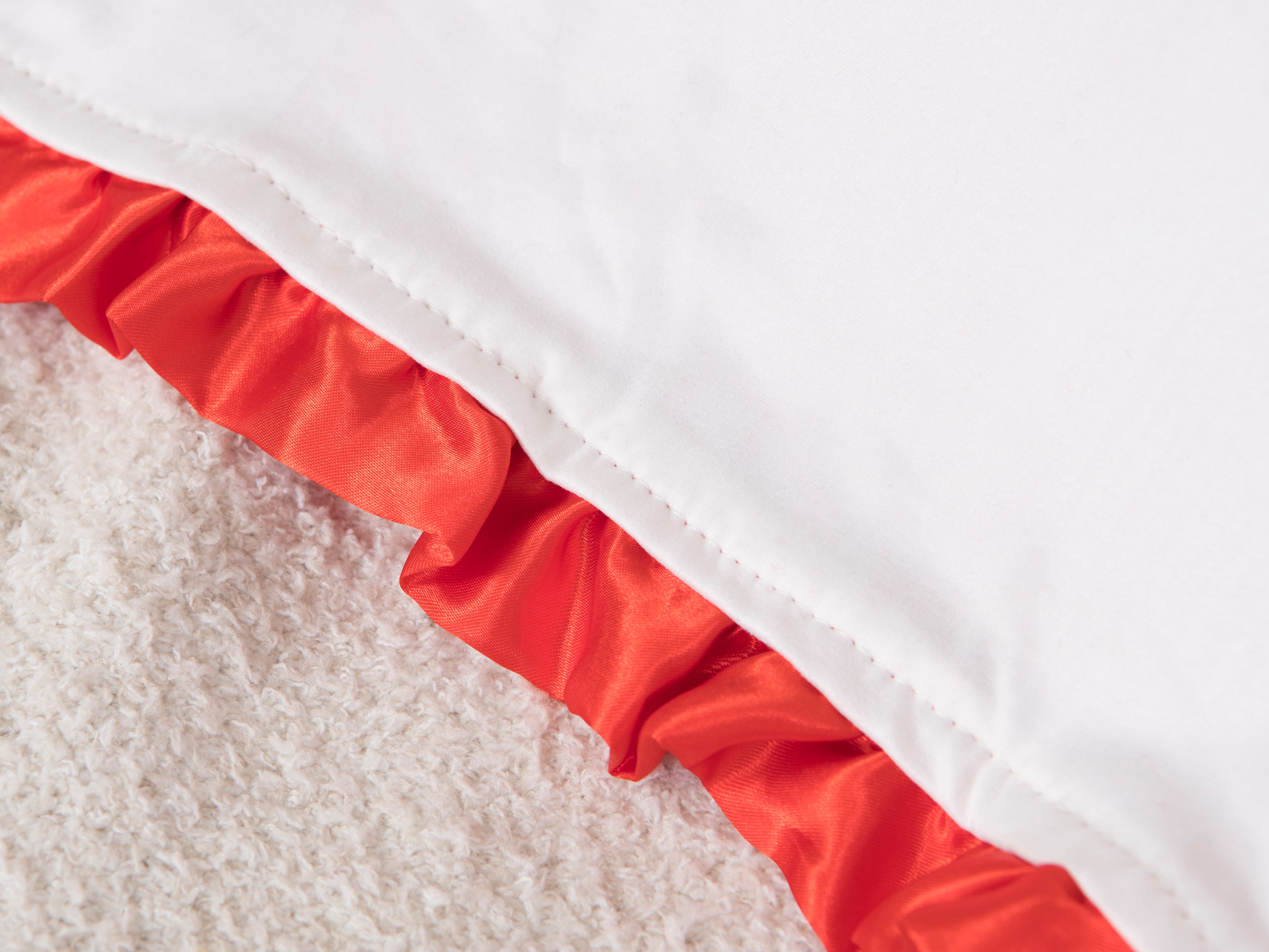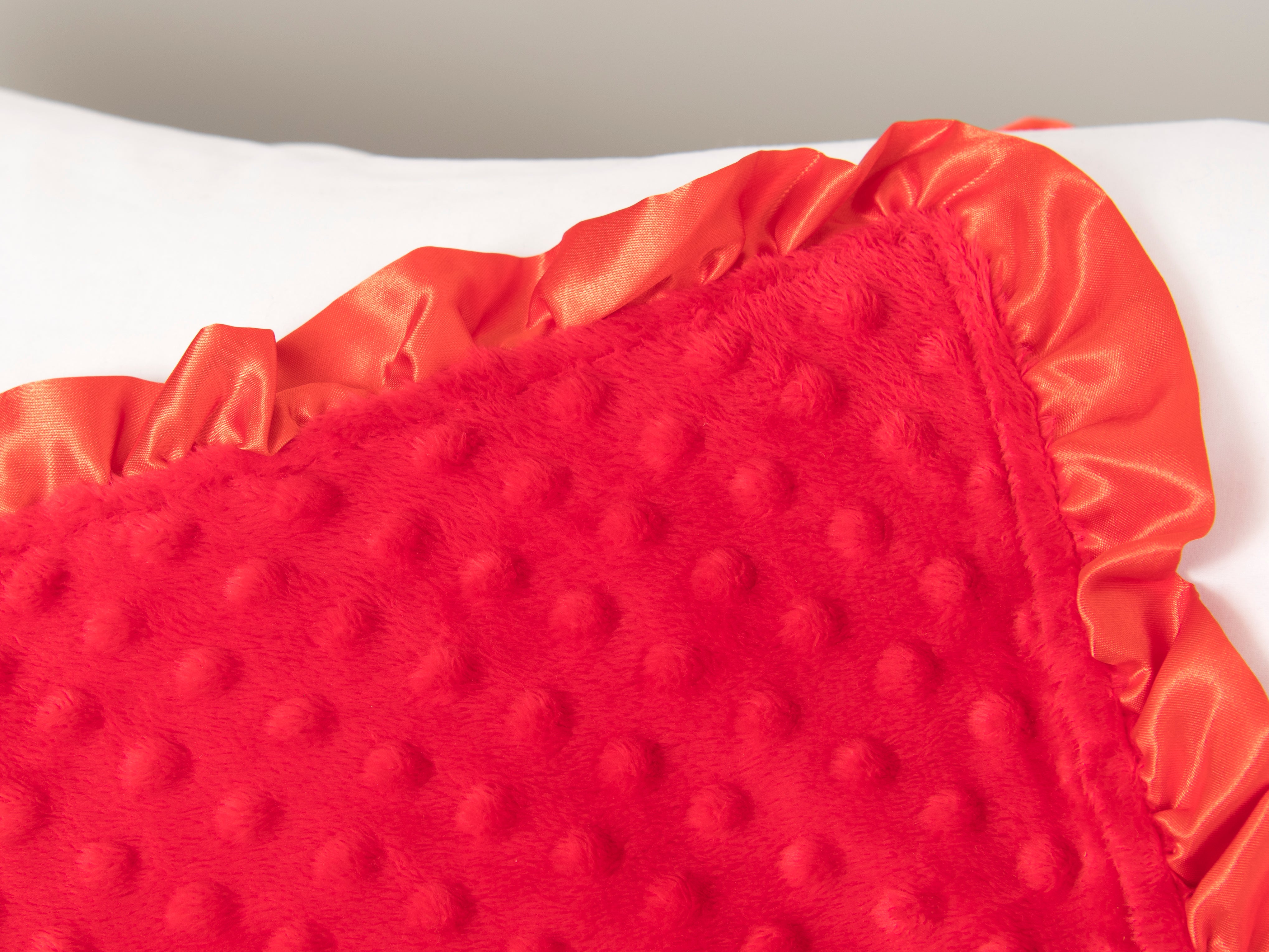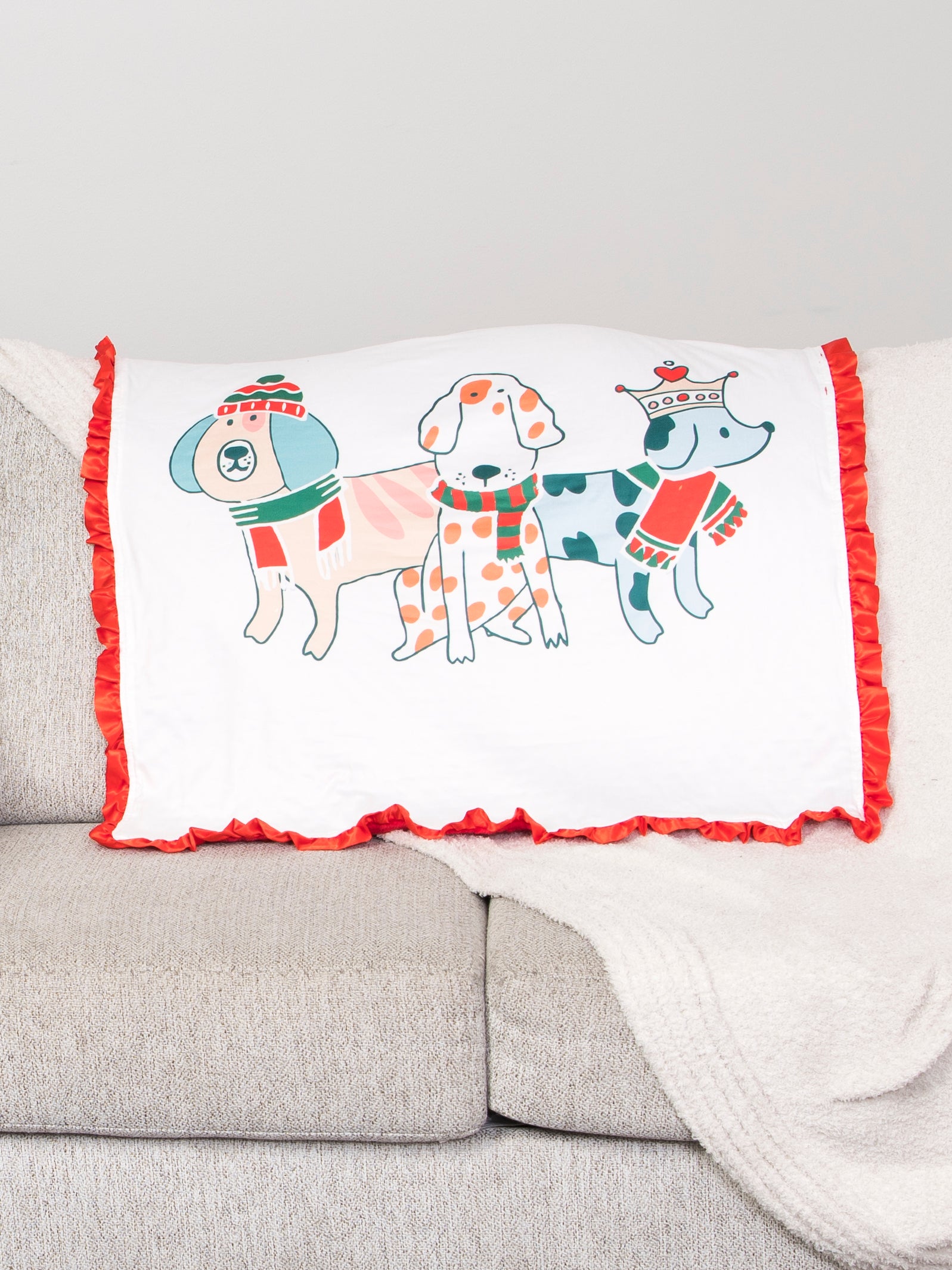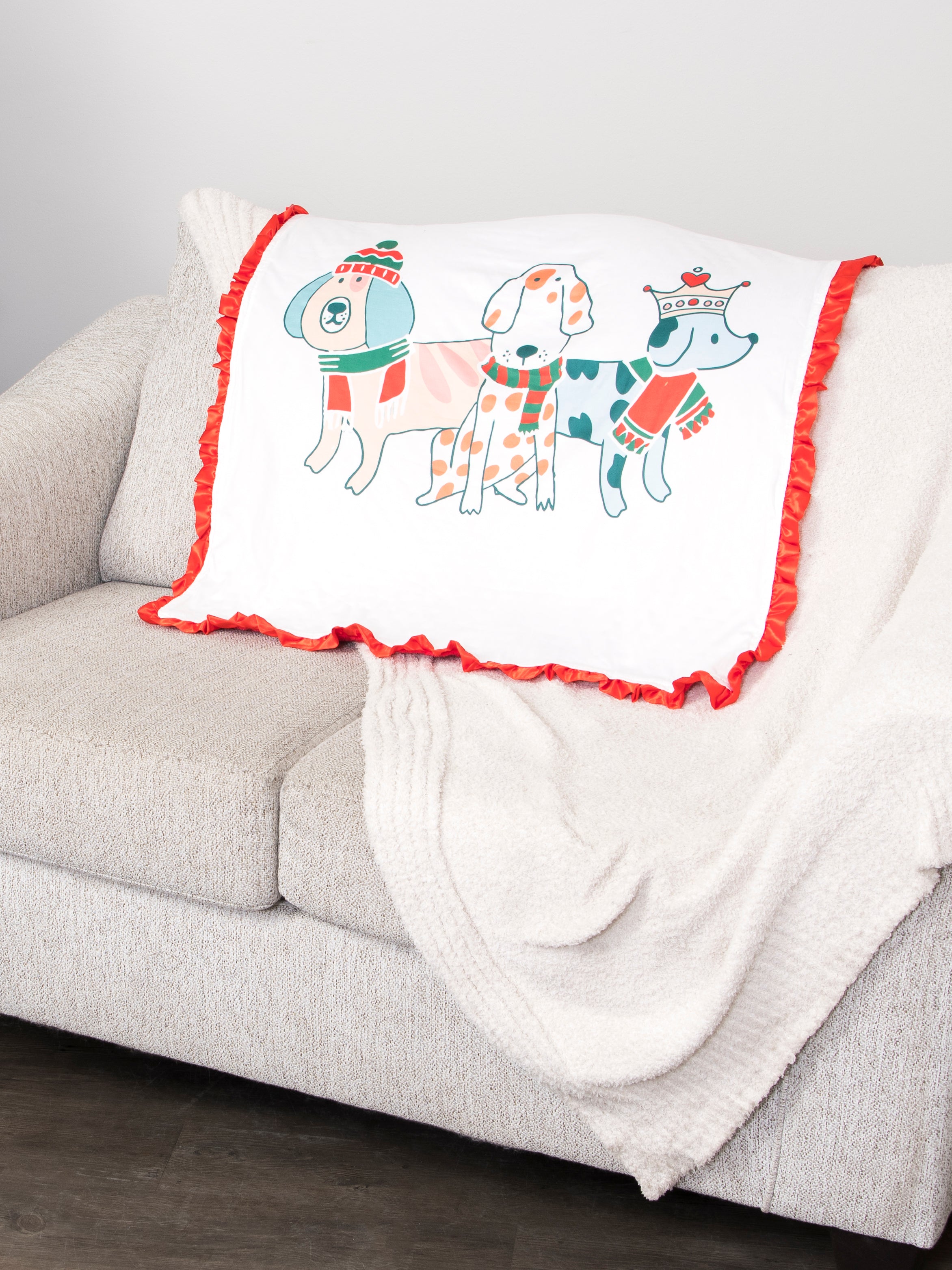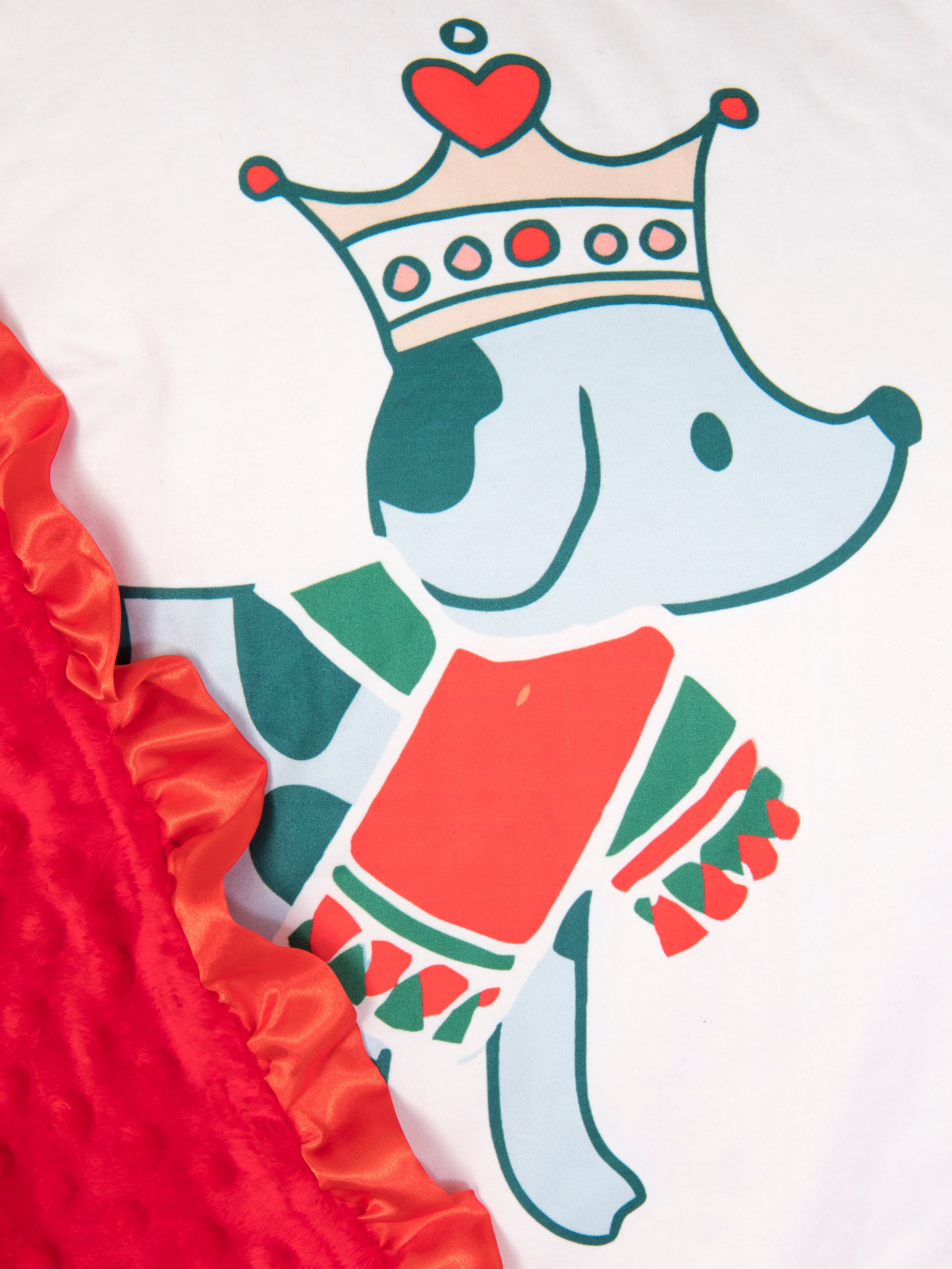 This blanket is a very lightweight polyester material and perfect for the Christmas cuddles! It features ruffle trim, a soft red minky side, & our festive Royal Pups on the other side!