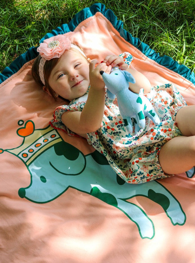 Introducing Our Royal Highness Eloise on our double layer peach blanket. Eloise is fearless, courageous and is always loyal to her fellow companions. Her favorite hobbies include biscuits with morning tea and afternoons on the terrace. She holds her head high to keep her crown from slipping and strolls through the city with grace and elegance. This blanket is a very lightweight polyester material and perfect for all of your summer outings. It features an Eloise vinyl decal, ruffle trim, and a beautiful floral pattern pup mix.