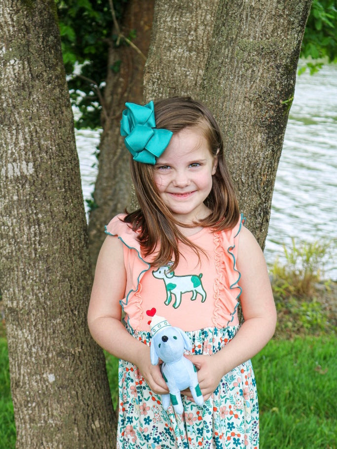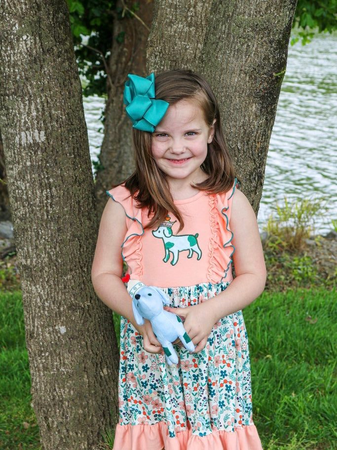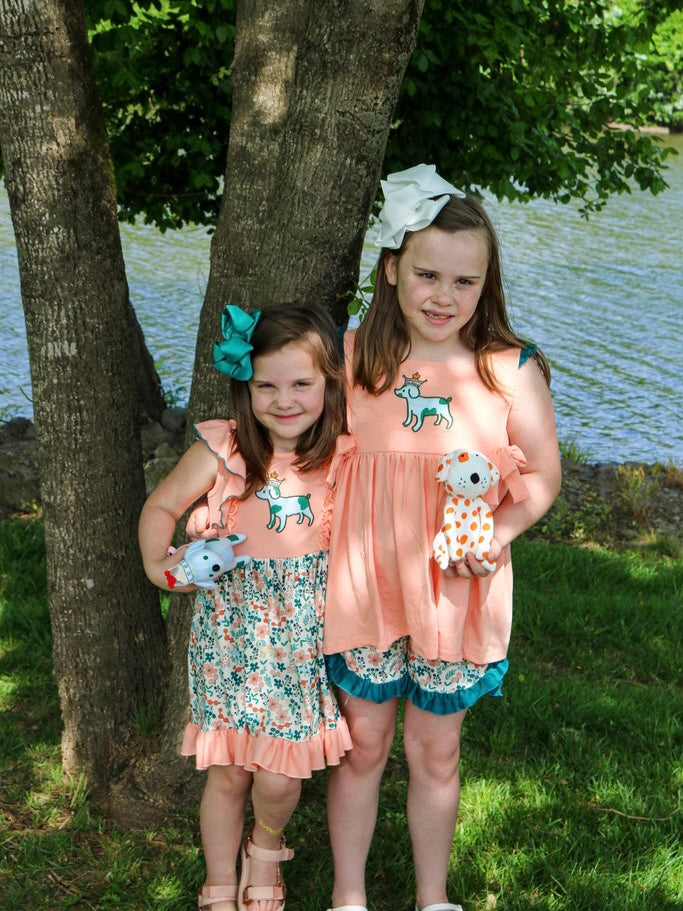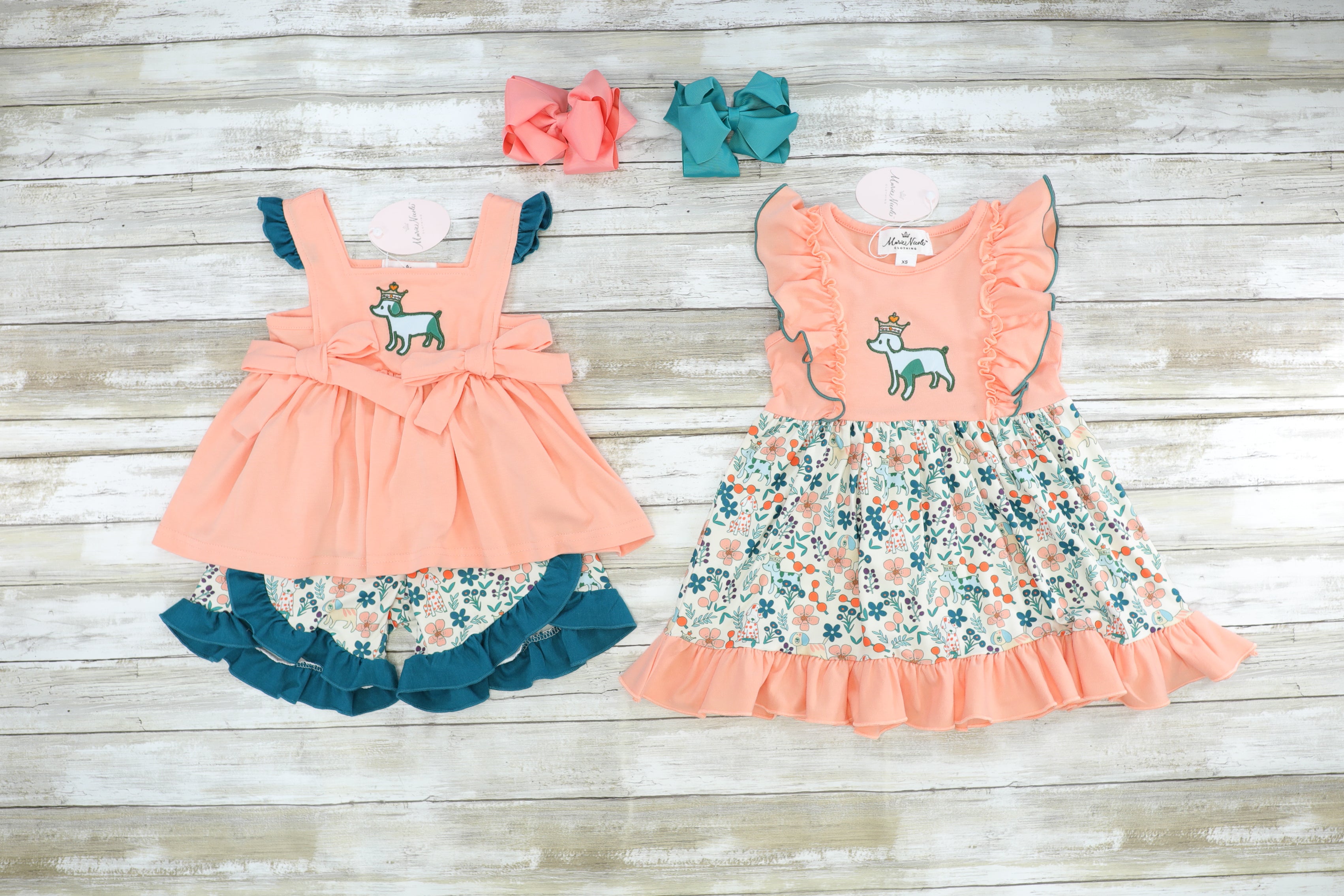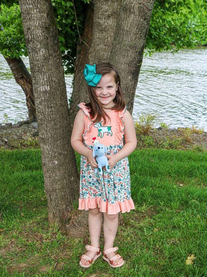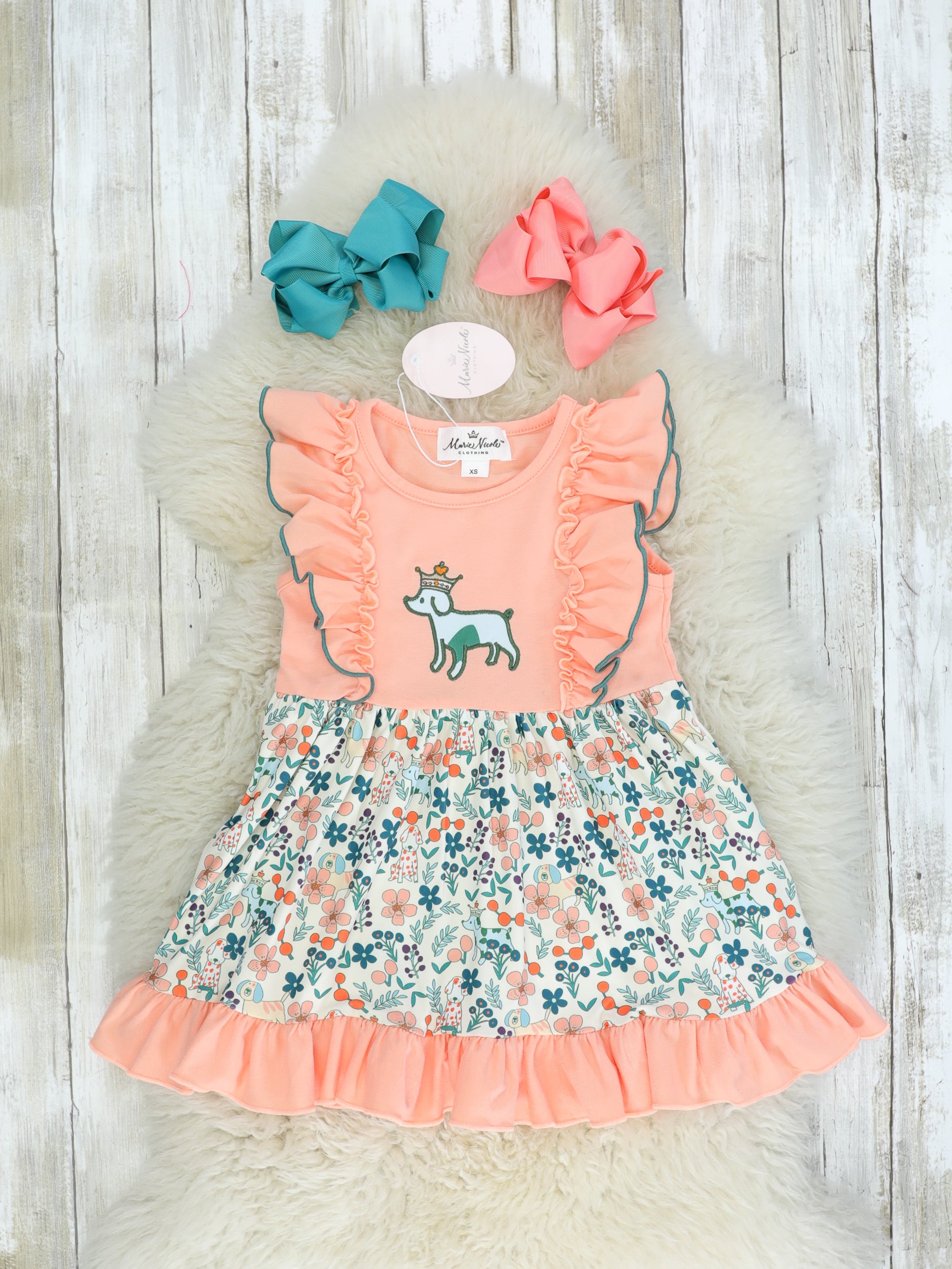 Our favorite sister set from the MNC Royal Pups collection. This dress features our Eloise appliqué, ruffle straps, and a beautiful floral pup mix pattern with a ruffle hem. Our Royal Highness Eloise is fearless, courageous and is always loyal to her fellow companions. Her favorite hobbies include biscuits with morning tea and afternoons on the terrace. She holds her head high to keep her crown from slipping and strolls through the city with grace and elegance.
